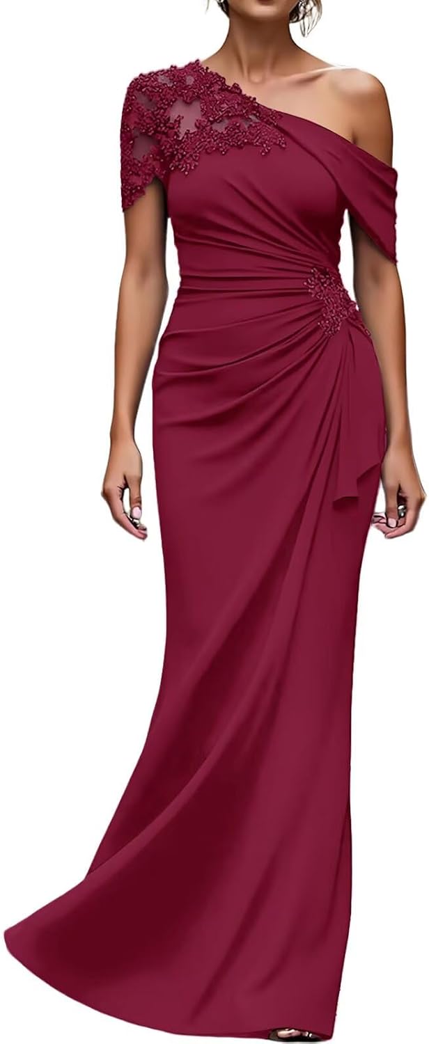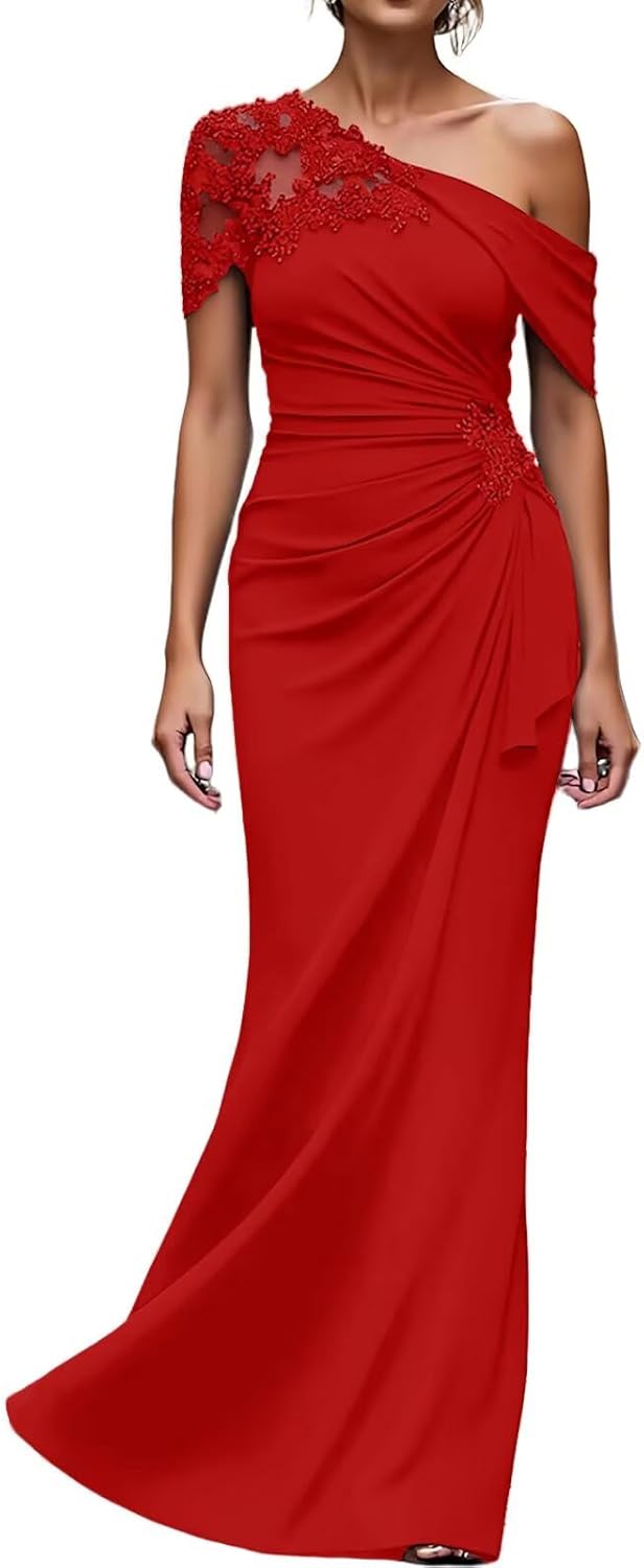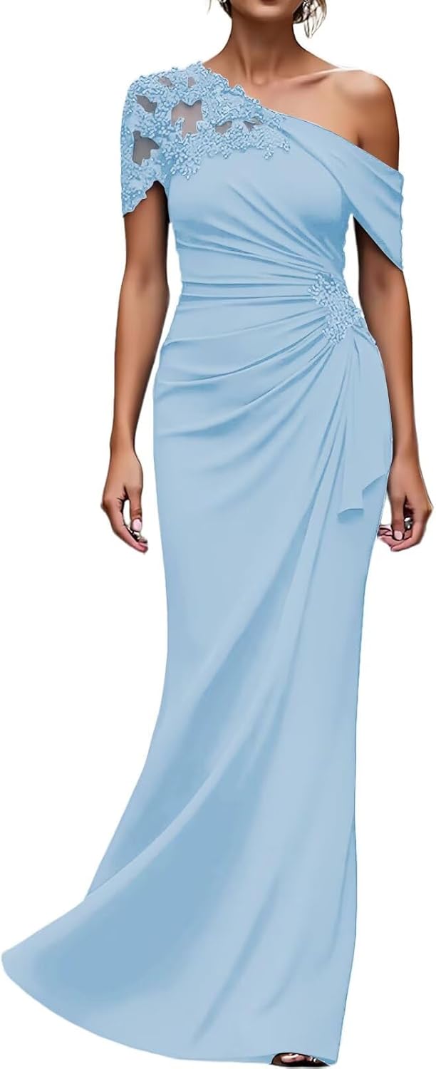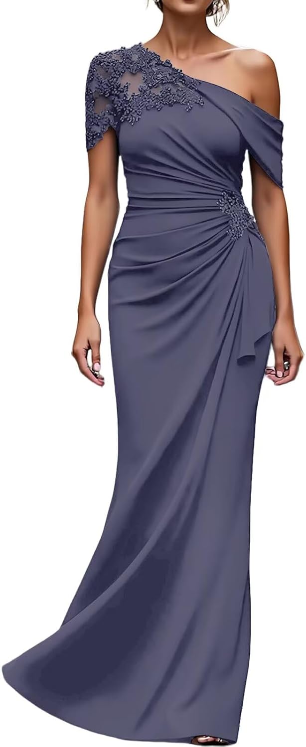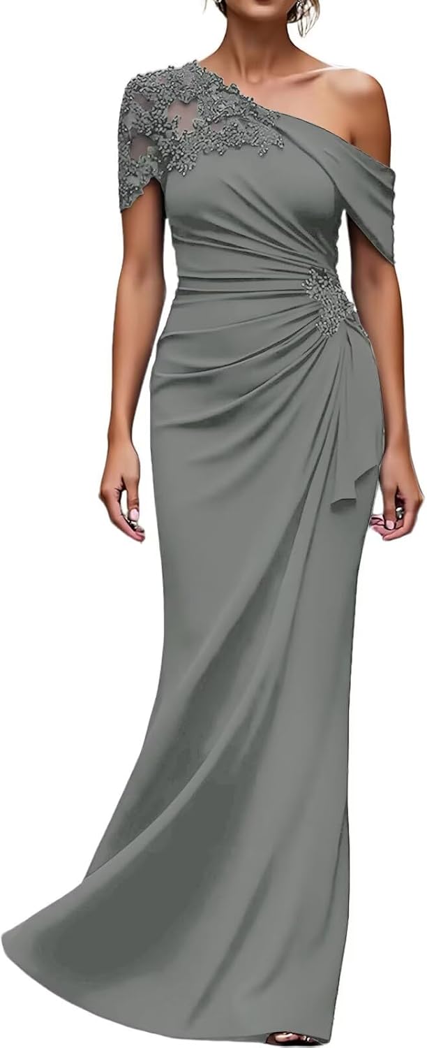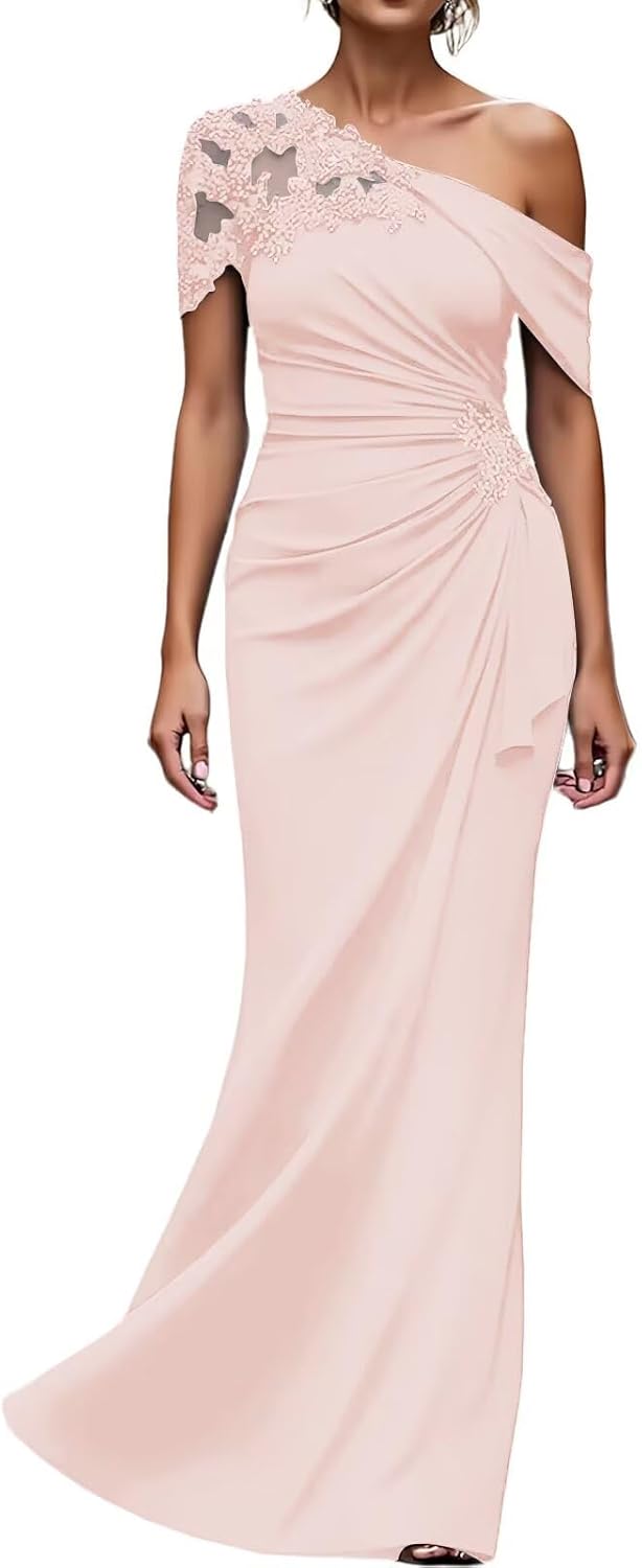 >One Shoulder Mother of the Bride Dresses Long Evening Formal Dresses for Wedding Guest Groom Gowns Mermaid Lace Applique WomenItem DescriptionGender:Womens/Ladies,Teens/Teenager GirlsFabric:High Quality ChiffonFeatures:Mermaid,One Shoulder,Sleeveless,Lace Applique,Beaded/Crystal/Rhinestone,Ruffles,Pleated/Ruched,Long/Full/Floor Length,Zipper Back,Built-in BraCustomized ServicesCustomized Size and Color are also available,detailed measurements as follows:A.Bust _____ inchB.Waist _____ inchC.Hips _____ inchD.Hollow to floor(Without Shoes)______inchE.Height(Without Shoes)______inchF.Shoulder to Shoulder______inchG.Height of Shoes(Shoe Heel)______inchH.The date you need the dress_____
