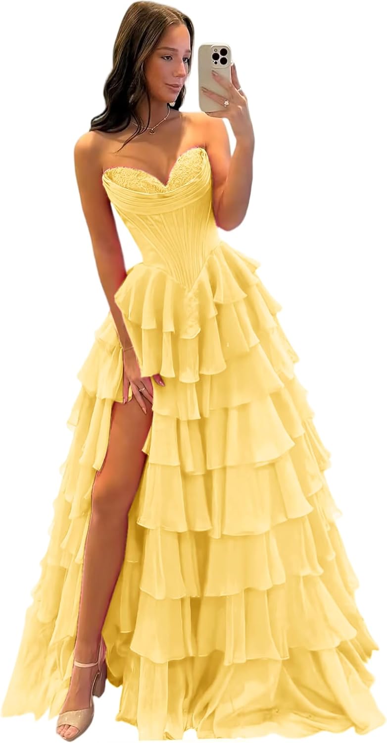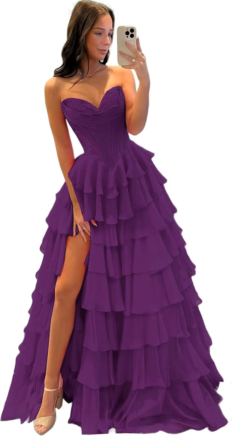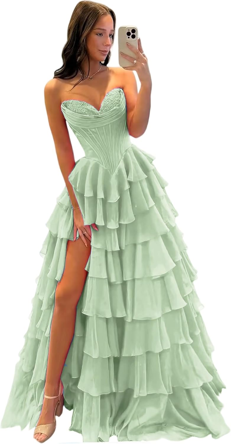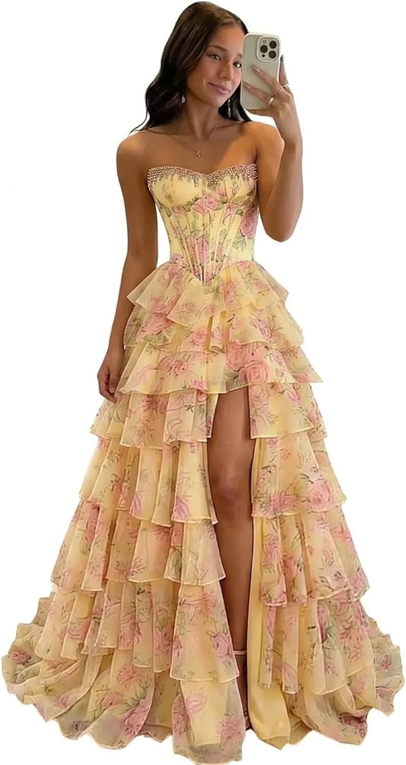 | Style Name | Corset Ruffle Slit A-line Prom Dress |