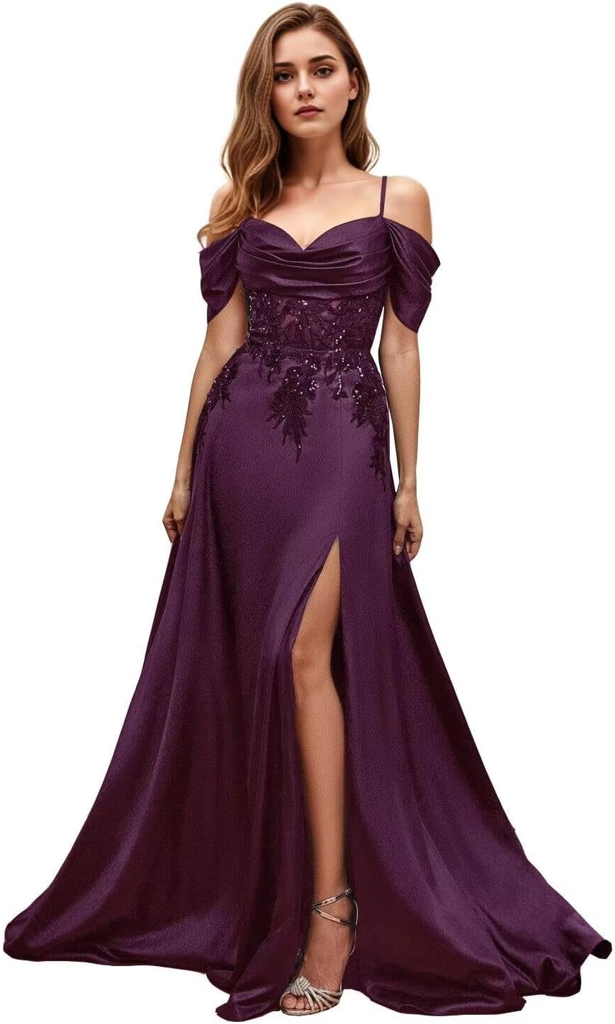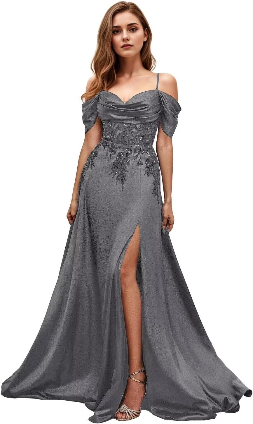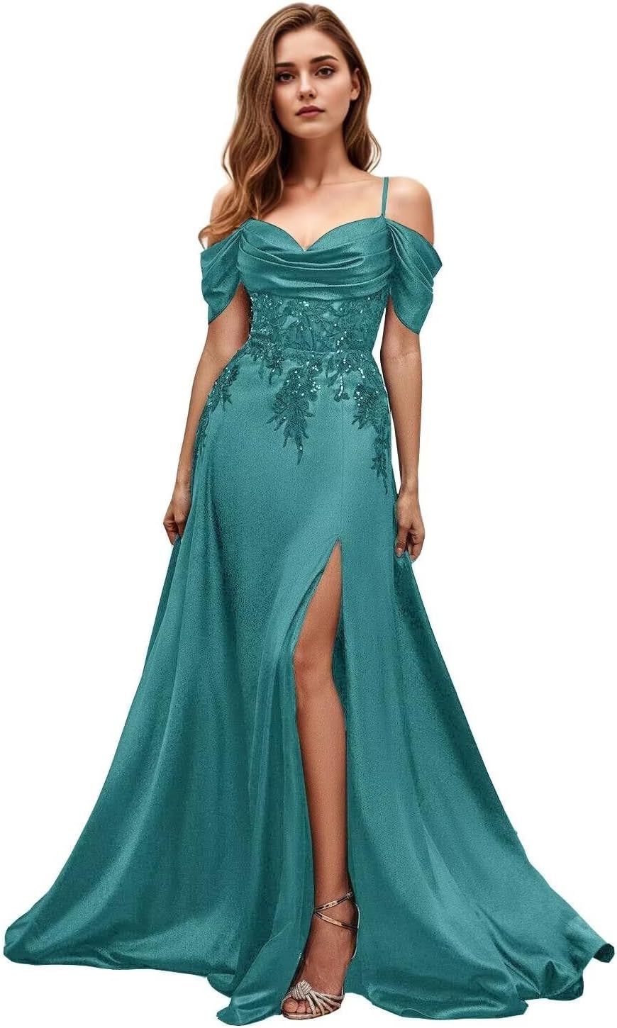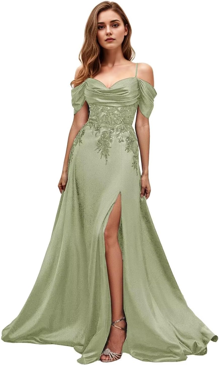 Dress Name: Satin lace appliques spaghetti a-line formal evening gowns with slit Features: Sweetheart a-line satin spaghetti with sleeves for women long prom dress with zipperFabric Type: SatinSilhouette: A-lineDecorations: Lace appliquesStraps: SpaghettiSleeves: SleevesLength: LongBack: Half open backClosure: ZipperWith Slit: YesTrain: YesCustom Size: In addition to standard sizes, we also offer custom sizes, if you need to custom the dress, please send us your measurements of bust, waist, hips, height.