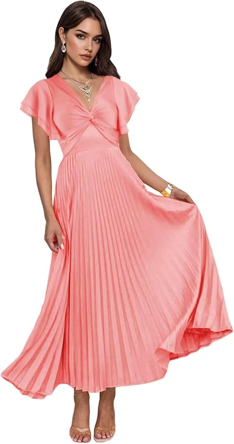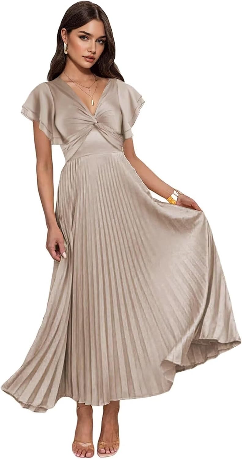 Satin Flutter Sleeve Bridesmaid Dresses for Women Pleated A Line Formal Evening Gown