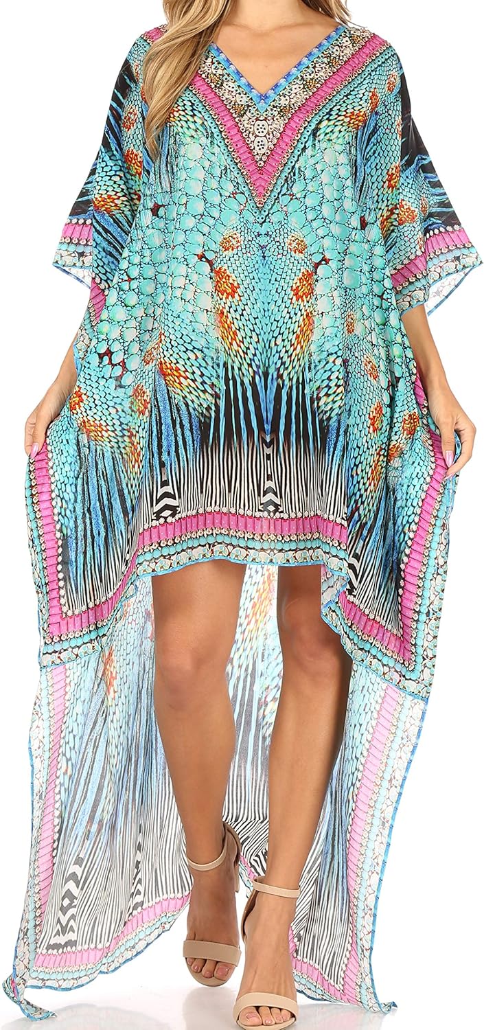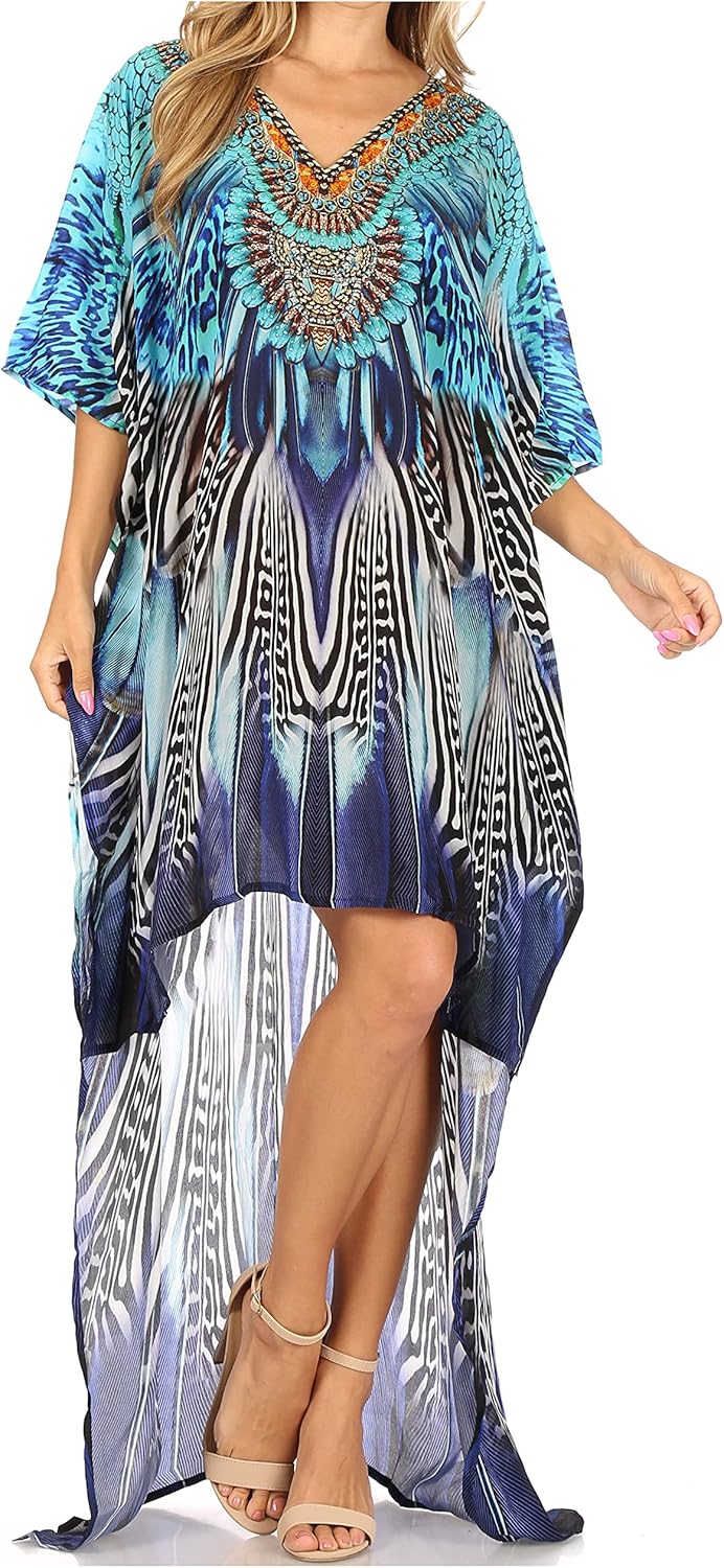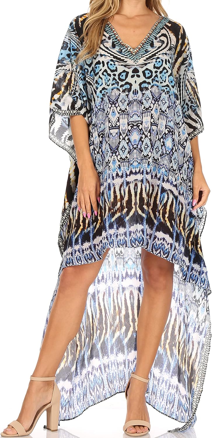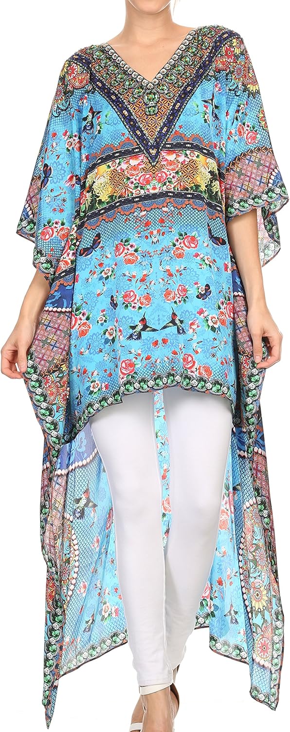 This hi low dress features a beautiful printed textile pattern in many different colors. These handmade dresses are lightweight and can be worn and layered in many different ways! The dress has a subtle v-neck neck line with rinestone detail and a boxy bodice and sleeve fit. The sleeves are wide and flowy for extra comfort. This dress does not have any structured design, so it drapes effortlessly and elegantly for any body type and shape. Because this fabric is lightweight, you will never feel weighed down or too hot in warmer climates. You can also style this dress as a coverup over beachwear! Great for spring and summer time. You can style this with some pants or tights and layer when cooler out, or you can style this over clothing or to wear alone as a statement piece! Hand wash separately in cold water. Line dry. Imported. | Material: 100% Poly Crepe.