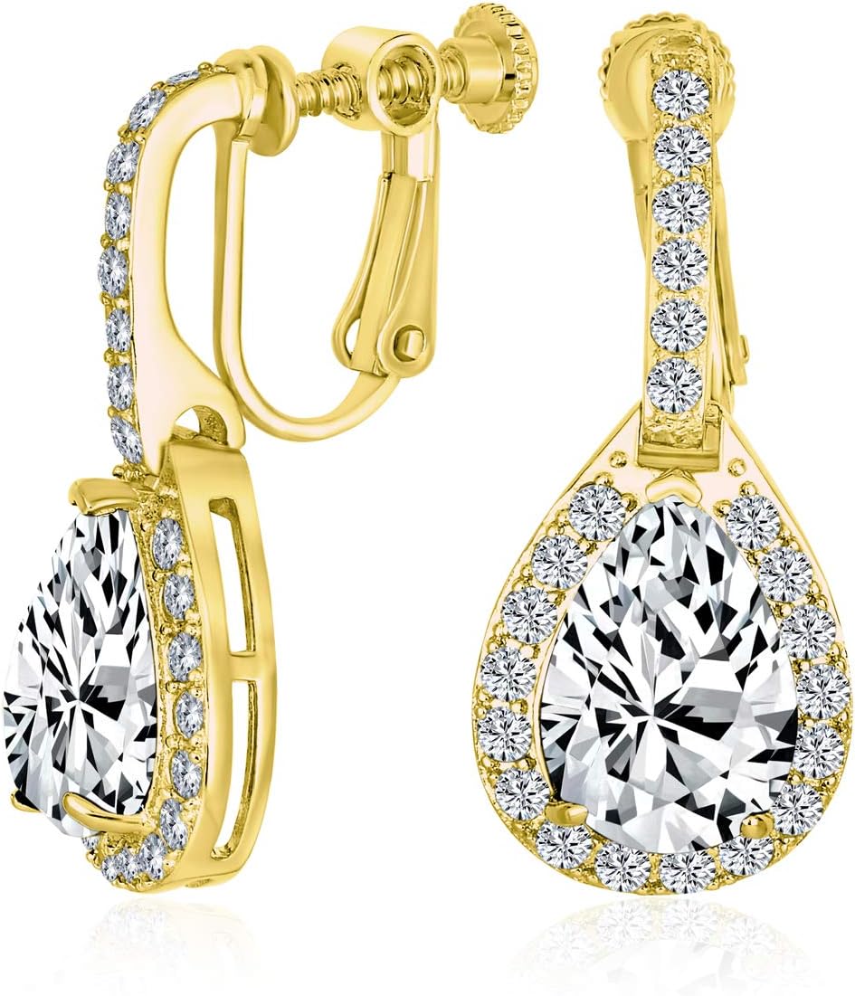 Elegant long chandelier earrings add a smart flair to your look. Trendy gold-plated CZ clip-ons are perfect bridal jewelry. Chic earrings for any fashionista. Affordable cubic zirconia jewelry keeps you on trend. Screw back earrings make it easy to be pretty.