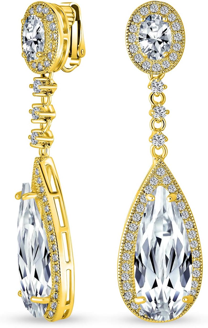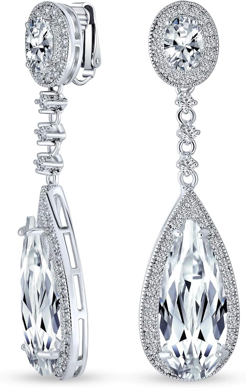 Elevate your style with stunning long chandelier earrings. Trendy silver-plated teardrop Amethyst CZ clip-ons are perfect bridal jewelry. Chic for any fashionista. Affordable cubic zirconia keeps you on trend. Screw back earrings make beauty effortless.