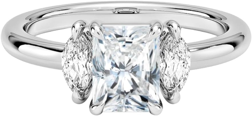 1-5 CT Radiant Cut Moissanite Engagement Ring Sasha Three Stone Marquise 925 Sterling Silver, 10K 14K 18K Solid Gold (ROSE, WHITE, YELLOW) Unique Wedding Ring 1, 2, 3, 4, 5 Carat Diamond Ring Anniversary Gift Promise Ring, This Handmade EVERLYN JEWELS Engagement Ring Is A Unique And Elegant Choice For Proposals. Description Of Ring Production Method: This Ring Is Entirely Handcrafted, With The Stone Expertly Cut And Polished By Our Skilled Artisans. Center Stone Details Shape: Radiant Briliant Cut Moissanite Size: 1, 2, 3, 4, 5 CT Color: D-E Clarity: VVS1-VVS2 Luster: Excellent Make: High Quality Side Stones Details Shape: Marquise Cut Moissanite Size: 0.31 CT Color: D-E Clarity: VVS1-VVS2 Luster: Excellent Make: High Quality Metal Details Designed By EVERLYN JEWELS Materials: Sterling Silver, Rose Gold, White Gold, Yellow Gold Metal: 925 Sterling Silver, 10K 14K 18K Solid Gold Metal Stemp: 925, 10K, 14K, 18K Setting: Claw Prong, Prong Set Band Width:1.80 MM Ring Size: Customize Now