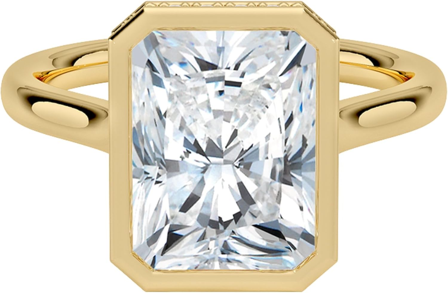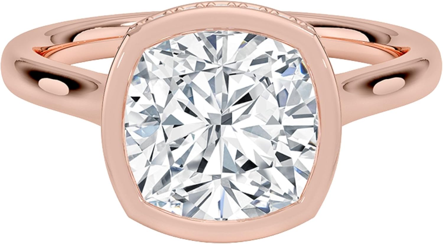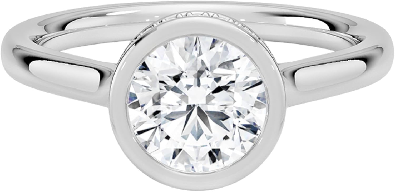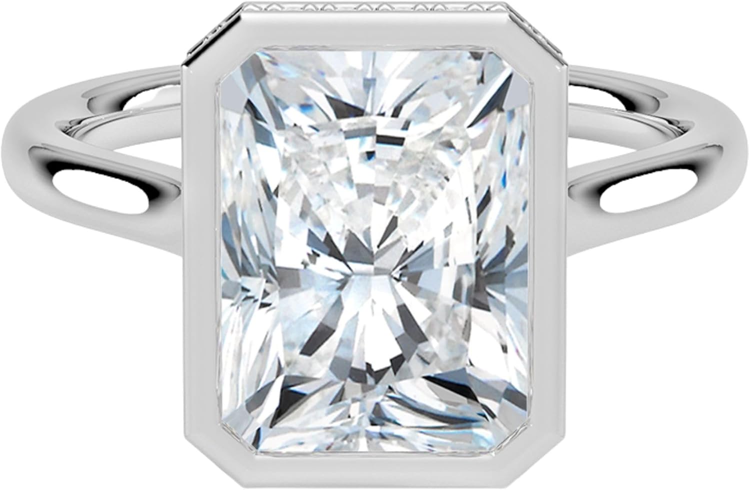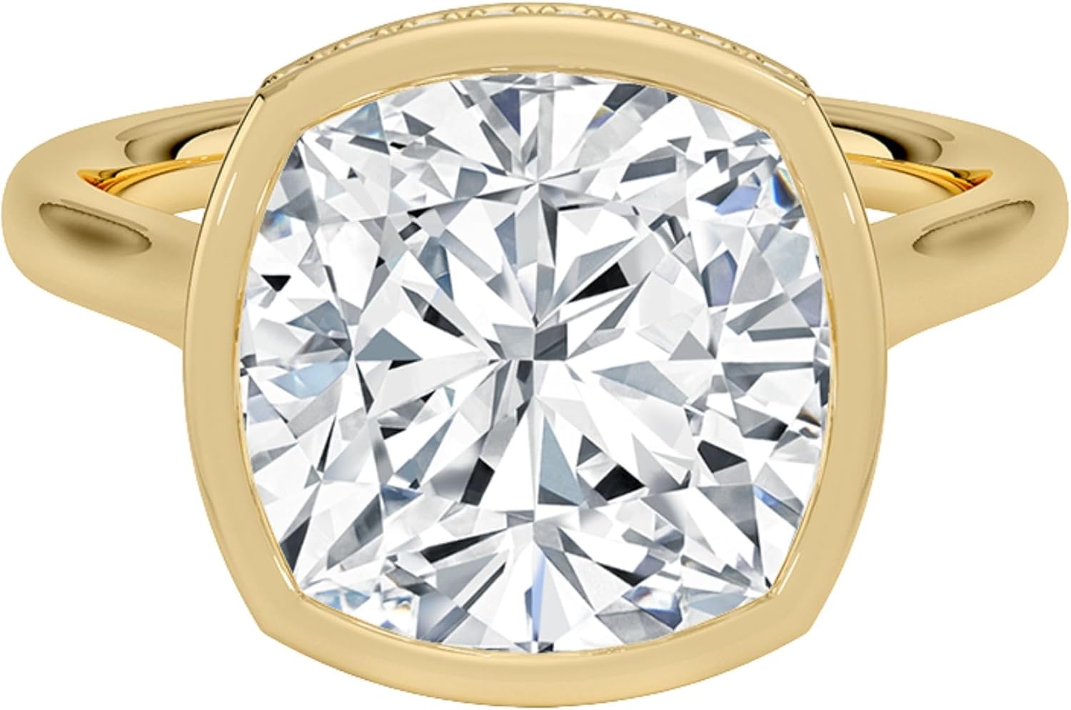DiffNY Jewels Bezel Set Moissanite Engagement Ring for Women Celebrate your love with this elegant and modern engagement ring from DiffNY Jewels. Designed with a brilliant bezel-set moissanite center stone and enhanced by a scalloped pave hidden halo, this ring delivers exceptional sparkle from every angle while maintaining a sleek and contemporary look. Brilliant Center Stone: Features a stunning 0.50–5 carat colorless moissanite center stone with exceptional fire and brilliance, offering a luxurious diamond-like appearance.Modern Bezel Setting: Secure bezel setting protects the stone while providing a clean, contemporary design perfect for everyday wear.Scalloped Pave Detailing: Elegant scalloped pave gallery accented with 0.18 CT round moissanite stones adds refined sparkle from every angle.Custom Cut Options: Available in Asscher, Cushion, Emerald, Oval, Pear, Princess, Radiant, or Round cut to match your personal style.Premium Metal Options: Available in 925 sterling silver or solid 10K, 14K, or 18K gold in Yellow, White, or Rose finishes to suit every preference.Perfect Engagement Gift: Ideal for engagements, anniversaries, proposals, or special celebrations, combining durability, comfort, and timeless elegance. A refined symbol of love and commitment, crafted to shine beautifully for a lifetime.