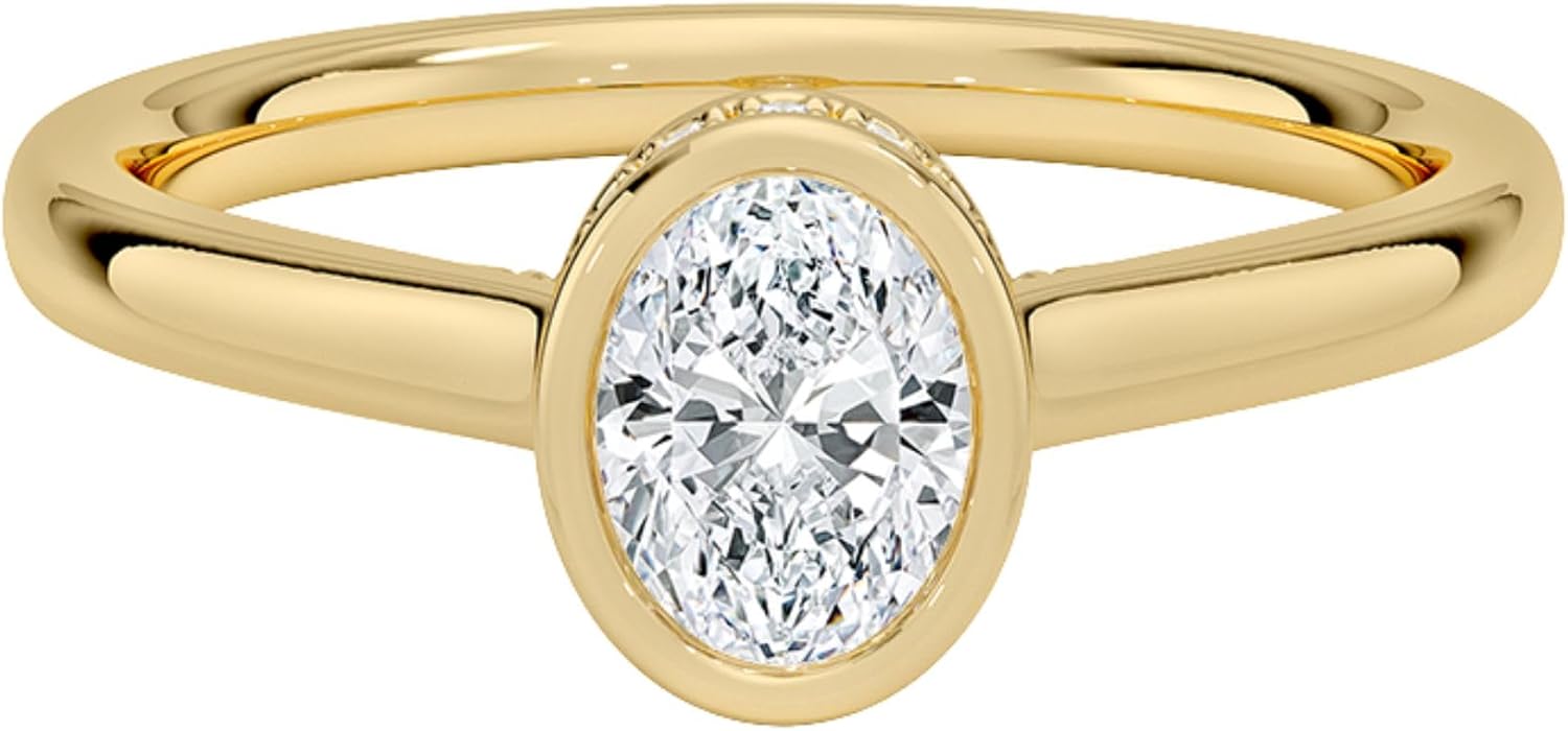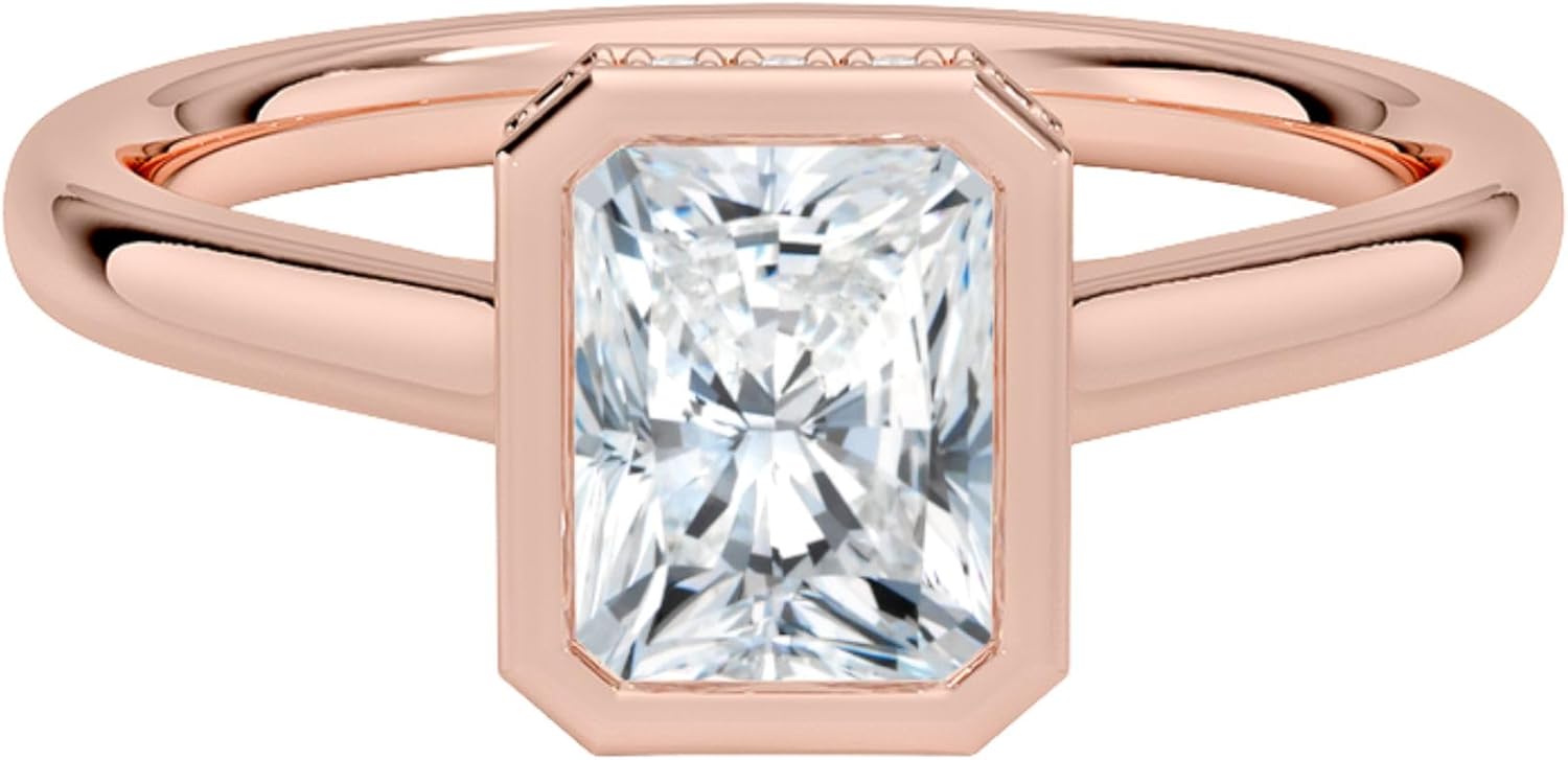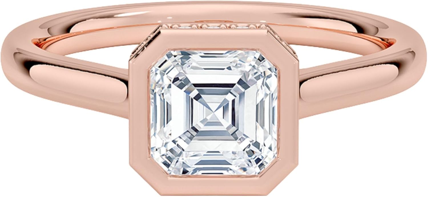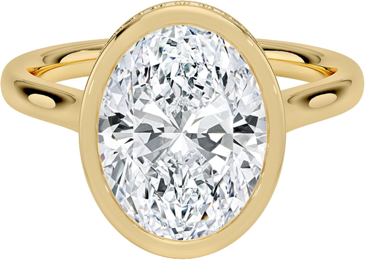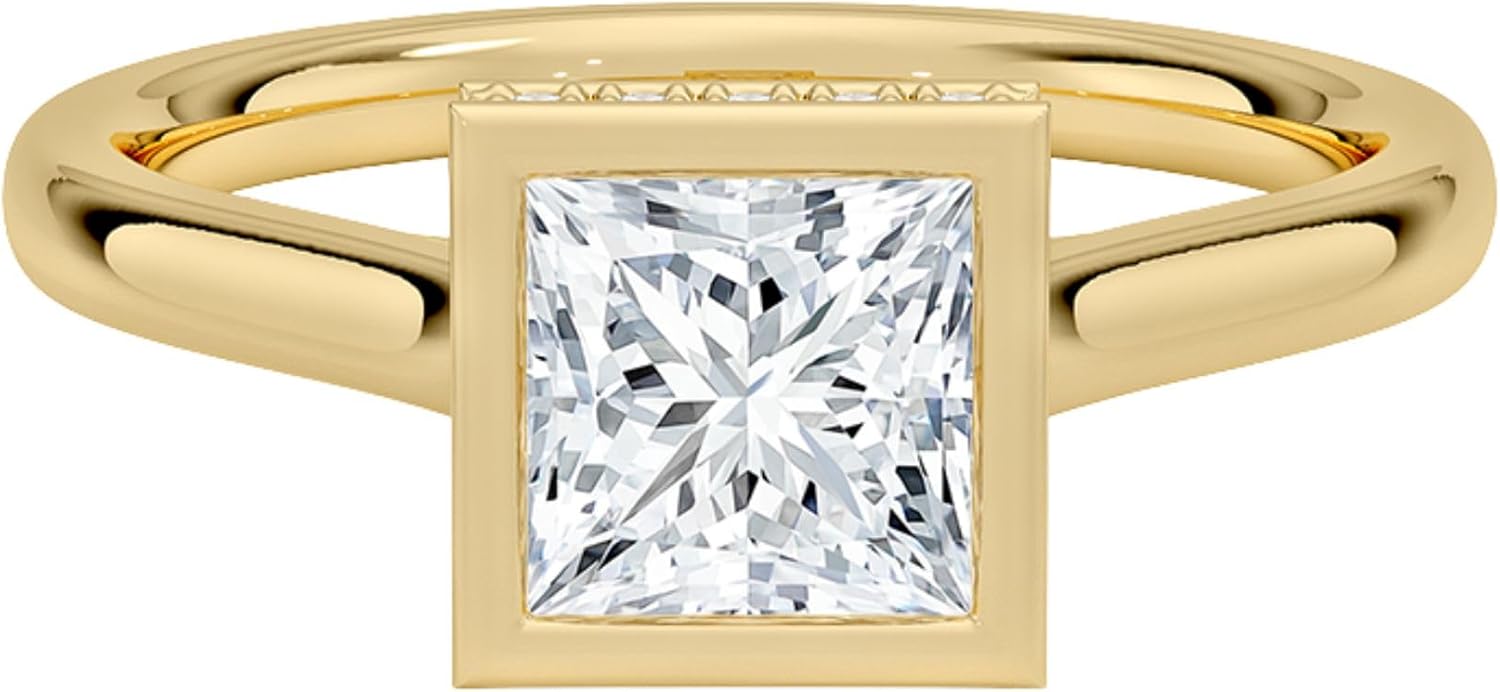 DiffNY Jewels Bezel Set Moissanite Engagement Ring for Women Celebrate your love with this elegant and modern engagement ring from DiffNY Jewels. Designed with a brilliant bezel-set moissanite center stone and enhanced by a scalloped pave hidden halo, this ring delivers exceptional sparkle from every angle while maintaining a sleek and contemporary look. Brilliant Center Stone: Features a stunning 0.50–5 carat colorless moissanite center stone with exceptional fire and brilliance, offering a luxurious diamond-like appearance.Modern Bezel Setting: Secure bezel setting protects the stone while providing a clean, contemporary design perfect for everyday wear.Scalloped Pave Detailing: Elegant scalloped pave gallery accented with 0.18 CT round moissanite stones adds refined sparkle from every angle.Custom Cut Options: Available in Asscher, Cushion, Emerald, Oval, Pear, Princess, Radiant, or Round cut to match your personal style.Premium Metal Options: Available in 925 sterling silver or solid 10K, 14K, or 18K gold in Yellow, White, or Rose finishes to suit every preference.Perfect Engagement Gift: Ideal for engagements, anniversaries, proposals, or special celebrations, combining durability, comfort, and timeless elegance. A refined symbol of love and commitment, crafted to shine beautifully for a lifetime.