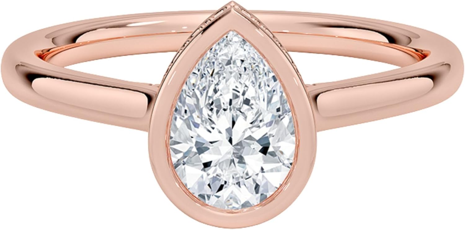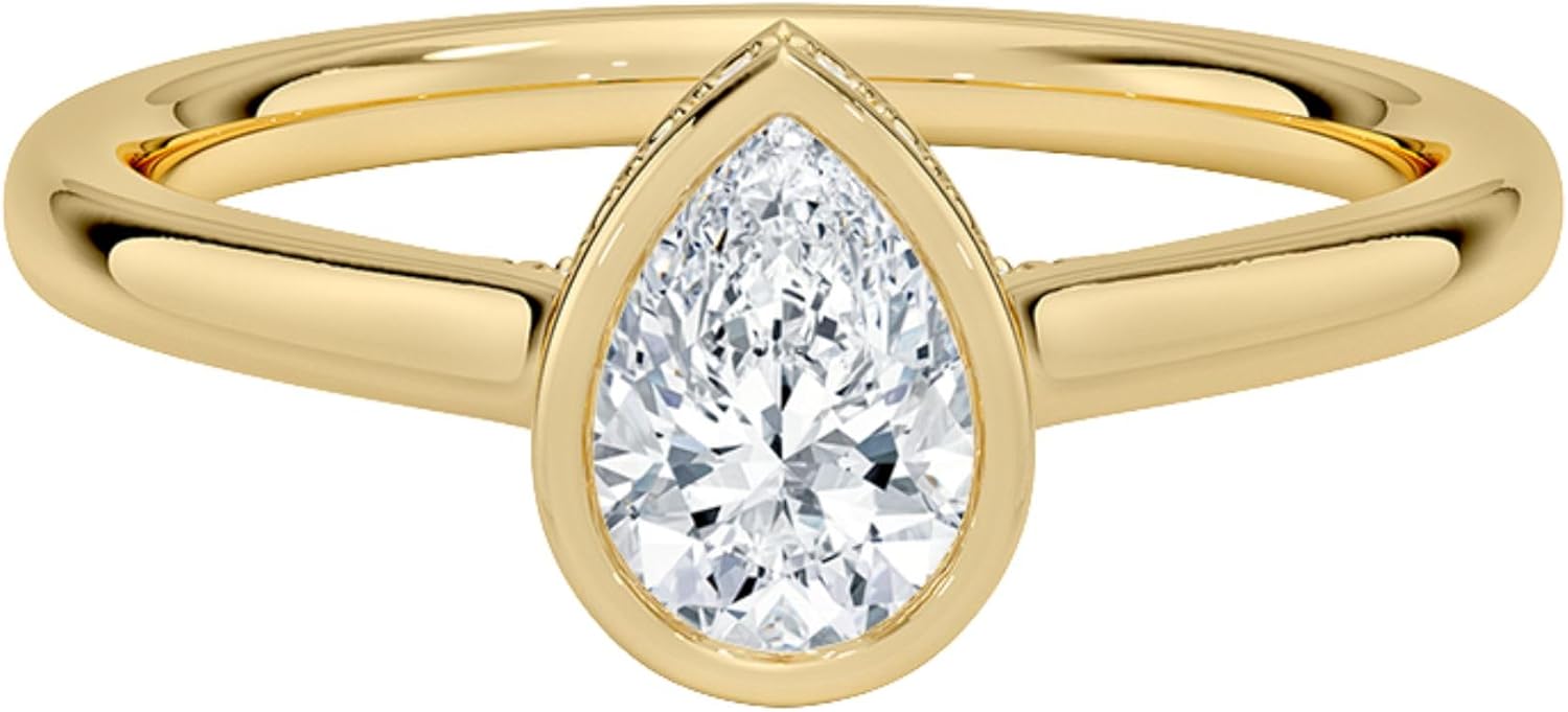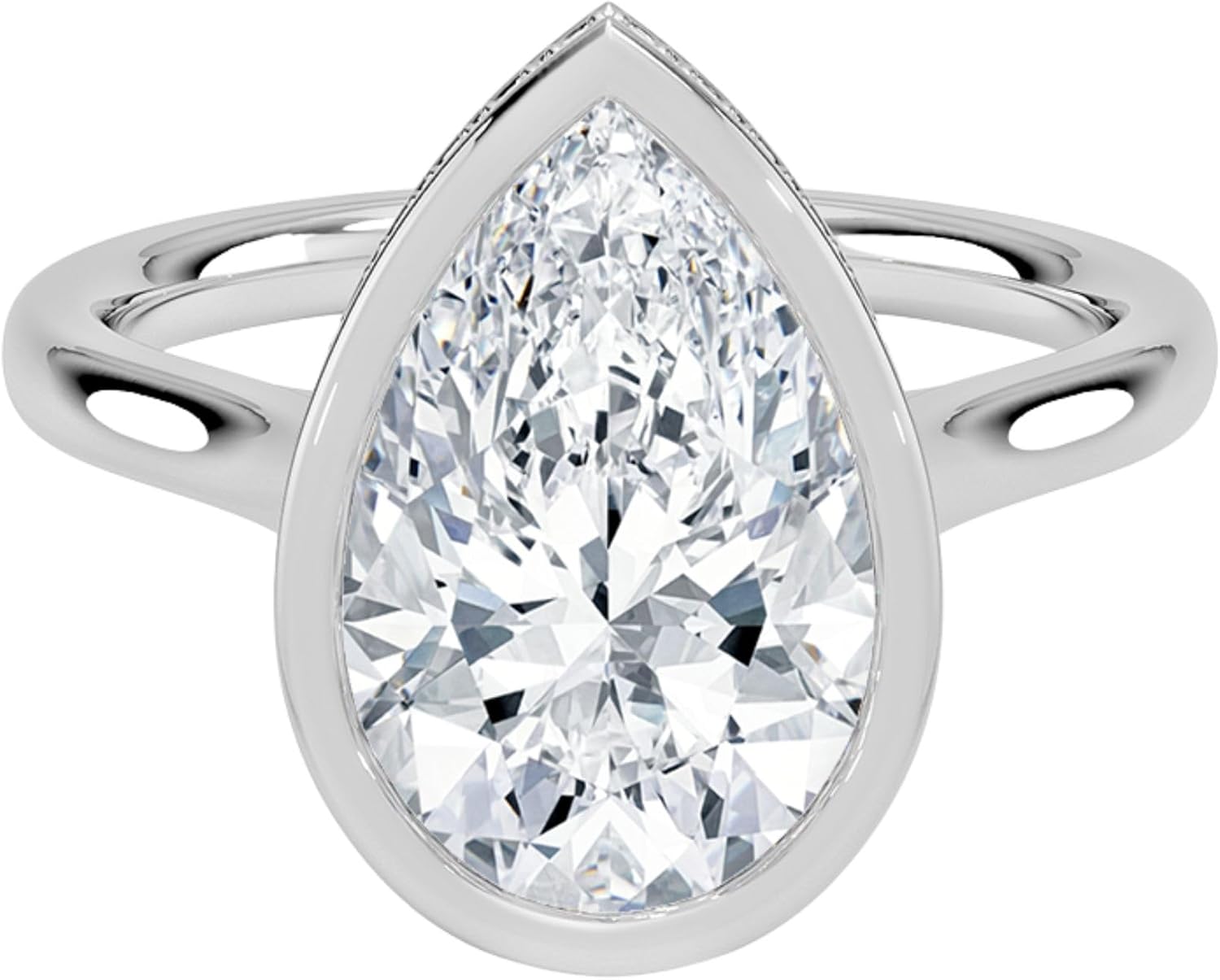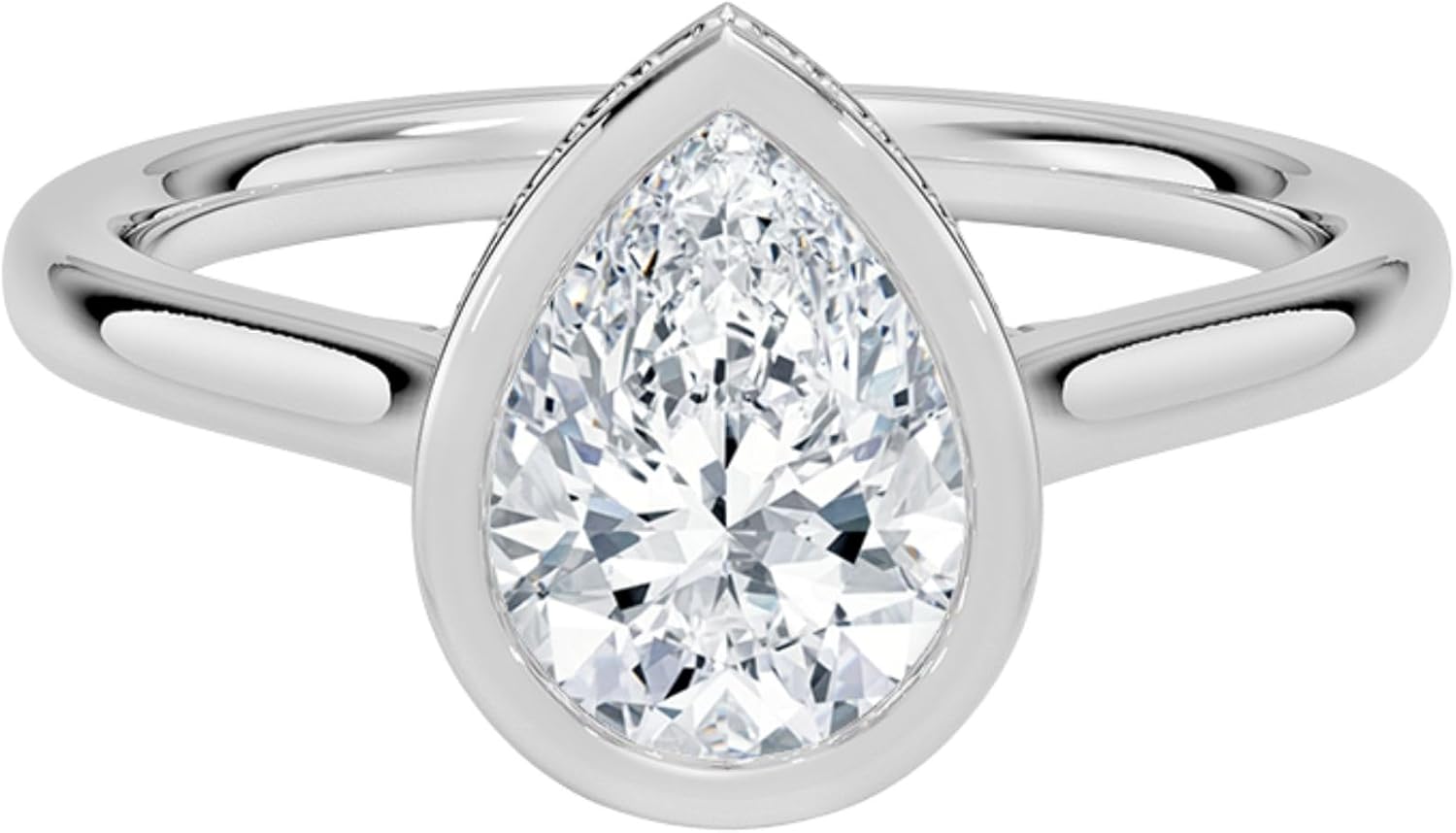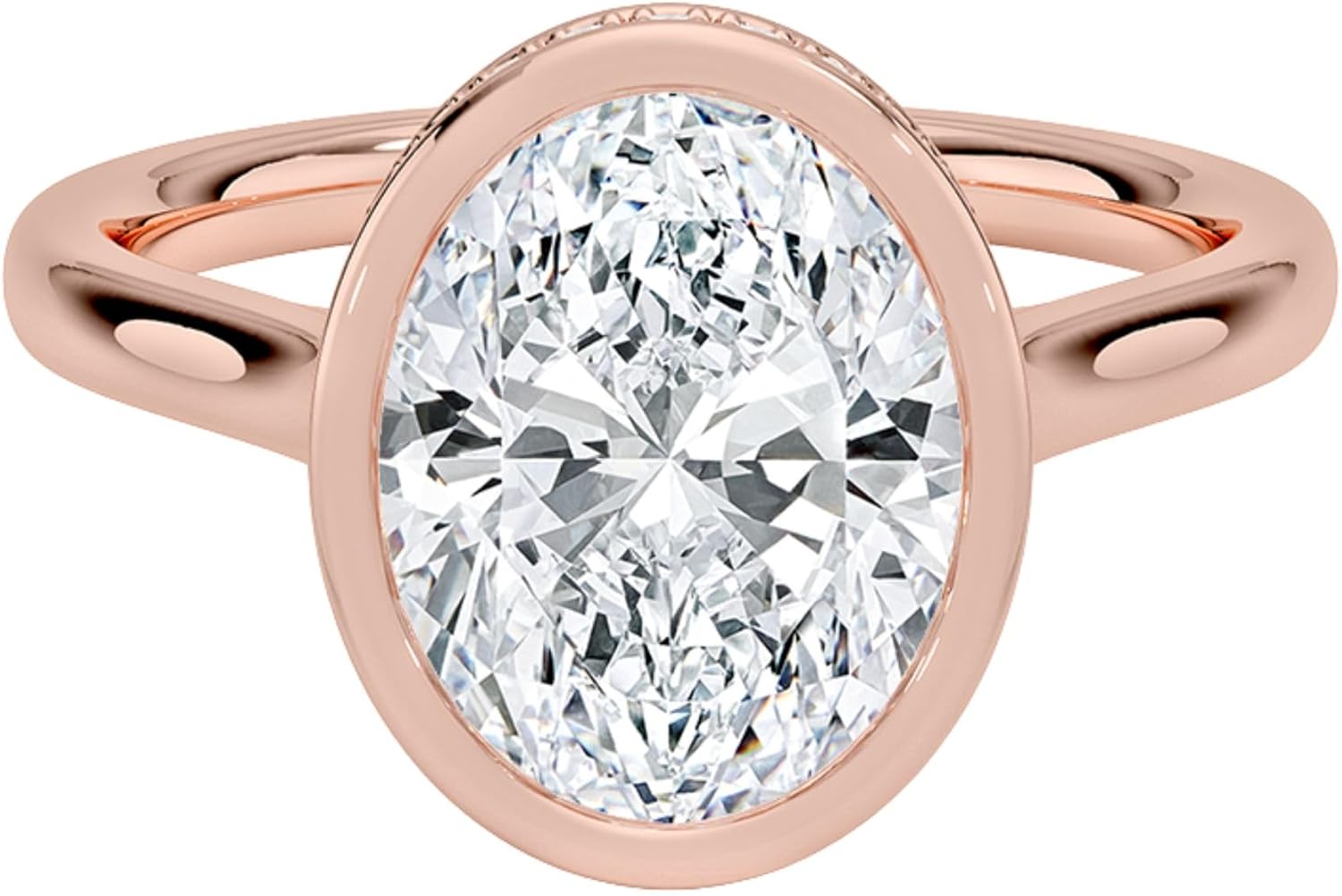 DiffNY Jewels Bezel Set Moissanite Engagement Ring for Women Celebrate your love with this elegant and modern engagement ring from DiffNY Jewels. Designed with a brilliant bezel-set moissanite center stone and enhanced by a scalloped pave hidden halo, this ring delivers exceptional sparkle from every angle while maintaining a sleek and contemporary look. Brilliant Center Stone: Features a stunning 0.50–5 carat colorless moissanite center stone with exceptional fire and brilliance, offering a luxurious diamond-like appearance.Modern Bezel Setting: Secure bezel setting protects the stone while providing a clean, contemporary design perfect for everyday wear.Scalloped Pave Detailing: Elegant scalloped pave gallery accented with 0.18 CT round moissanite stones adds refined sparkle from every angle.Custom Cut Options: Available in Asscher, Cushion, Emerald, Oval, Pear, Princess, Radiant, or Round cut to match your personal style.Premium Metal Options: Available in 925 sterling silver or solid 10K, 14K, or 18K gold in Yellow, White, or Rose finishes to suit every preference.Perfect Engagement Gift: Ideal for engagements, anniversaries, proposals, or special celebrations, combining durability, comfort, and timeless elegance. A refined symbol of love and commitment, crafted to shine beautifully for a lifetime.