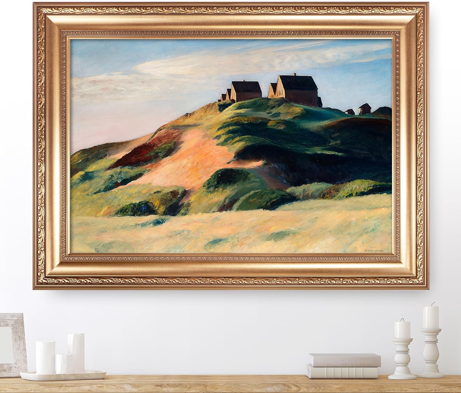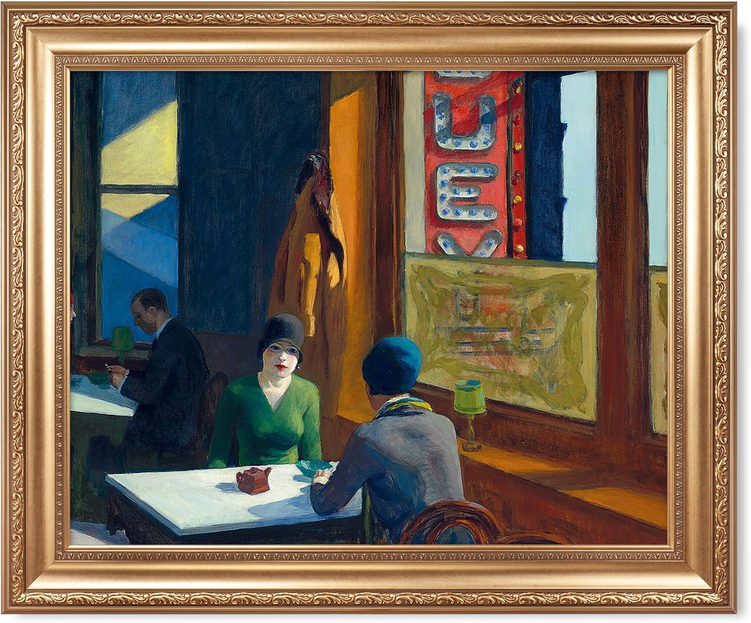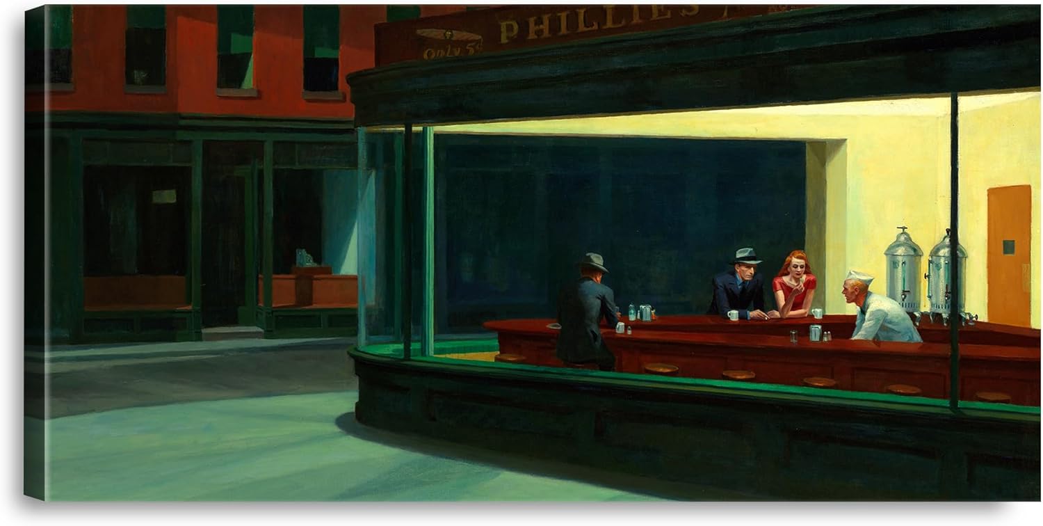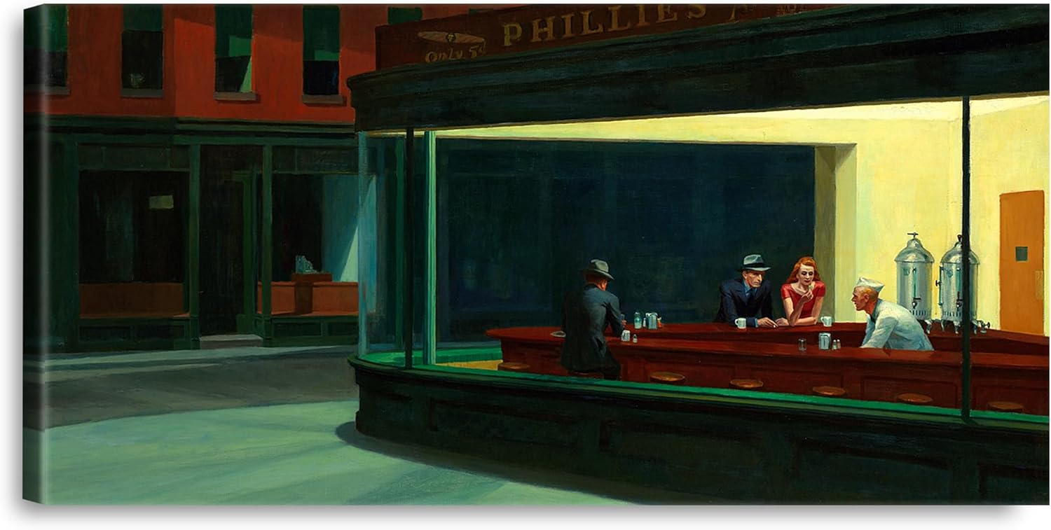 "Nighthawks" is a renowned painting by the iconic American artist Edward Hopper, completed in 1942. This oil-on-canvas masterpiece is perhaps one of Hopper's most famous works, known for its evocative portrayal of urban loneliness and existential isolation. The painting depicts a late-night scene at a downtown diner, illuminated by the harsh fluorescent lights that cast deep shadows on the empty streets outside. Inside the diner, four figures sit quietly at the counter or at separate tables, lost in their own thoughts and seemingly disconnected from one another. Hopper's use of stark contrasts and subdued colors intensifies the sense of alienation and solitude pervading the scene. "Nighthawks" has become an enduring symbol of urban alienation and the ennui of modern life, inviting viewers to contemplate the isolation and anonymity of city living.