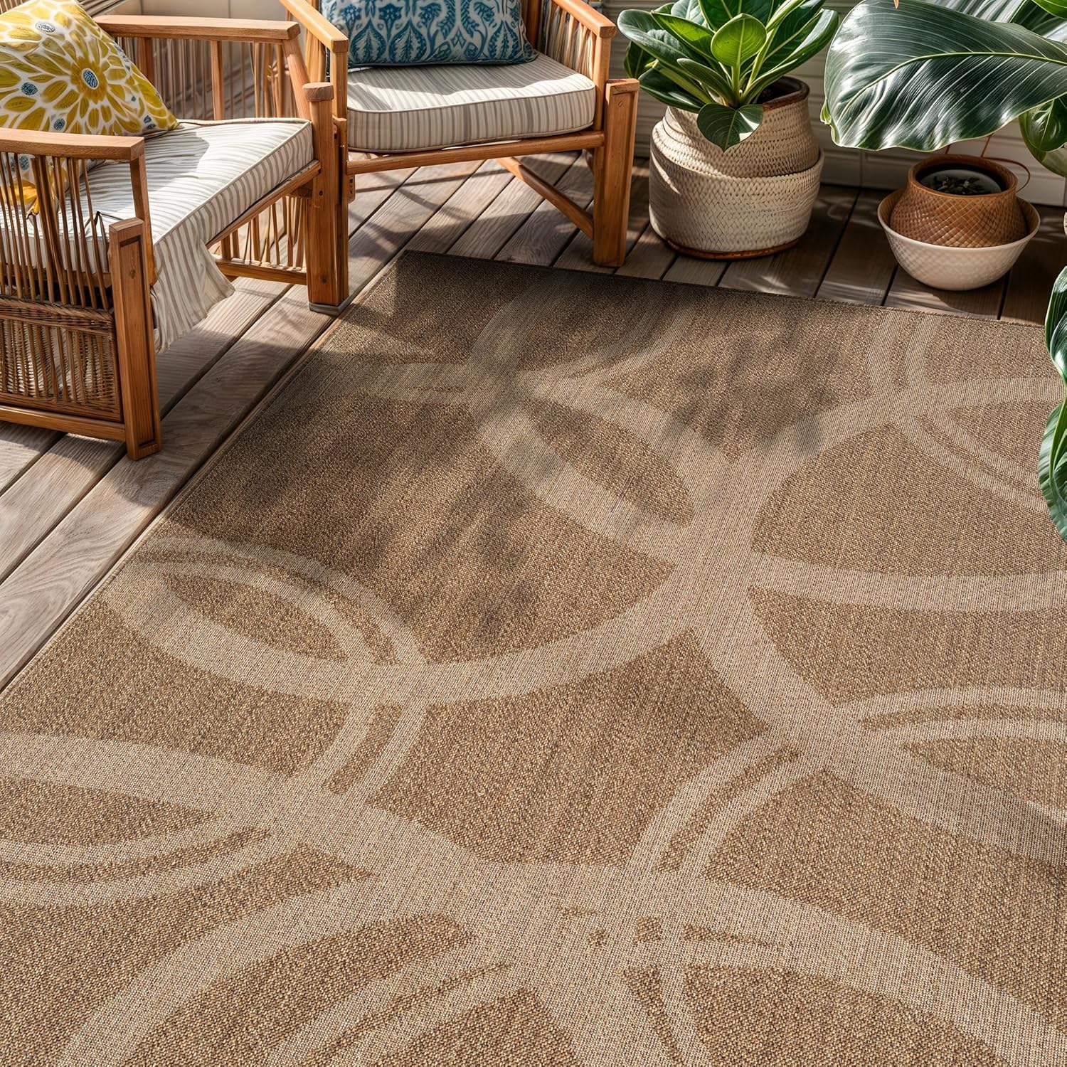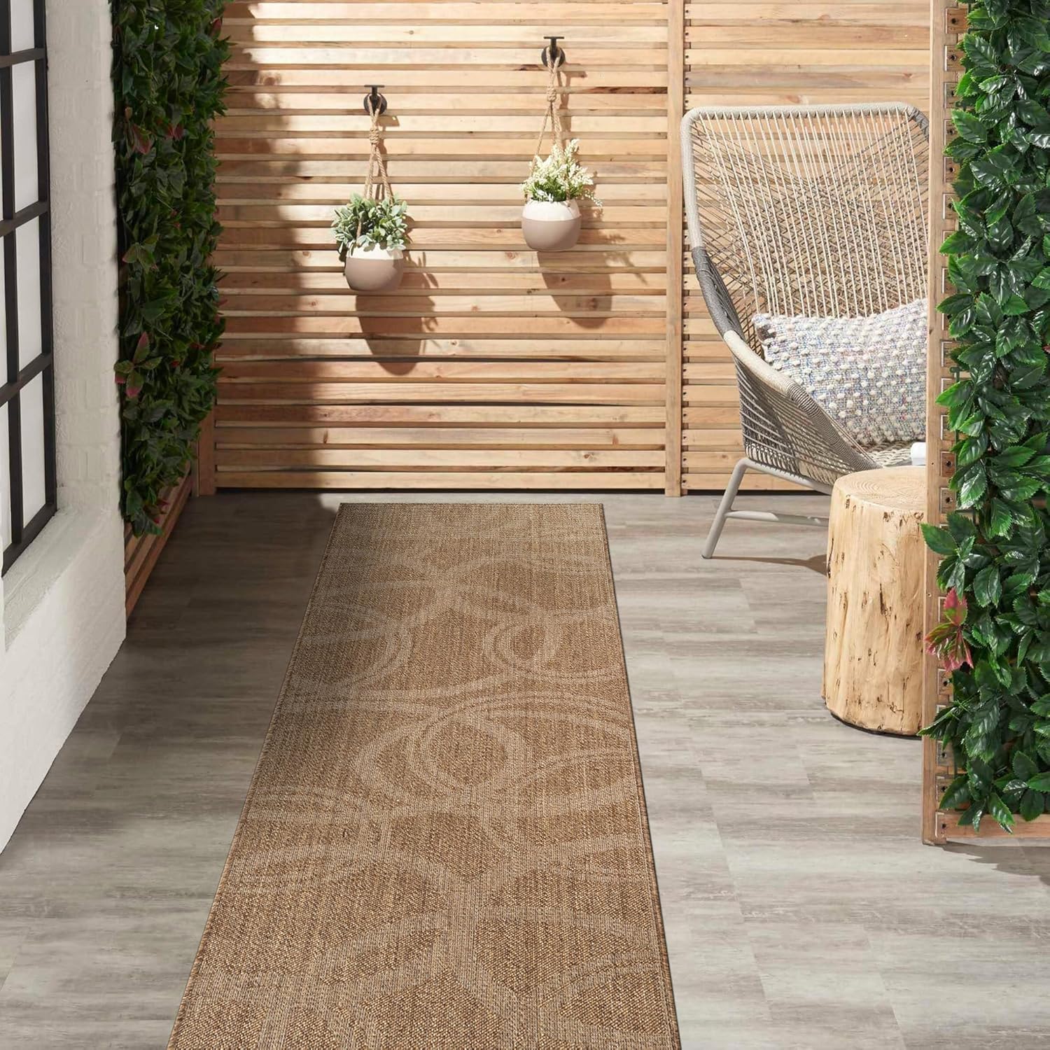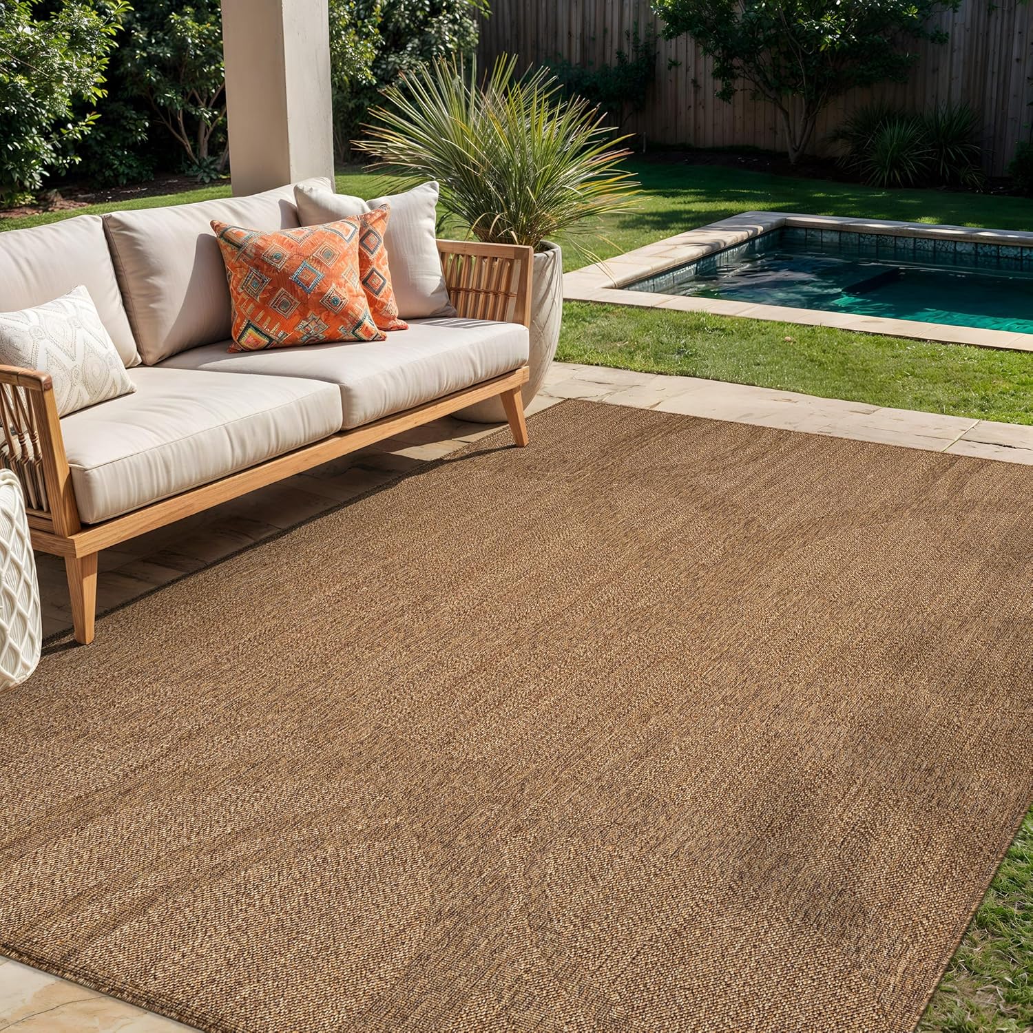 This indoor outdoor rug features a flatweave construction designed to deliver the look of natural fibers with easy everyday care. With its natural jute look outdoor rug appearance, it adds texture and warmth to patios, porches, decks, balconies, entryways, kitchens, and living rooms. The low-profile area rug design lays smoothly in high-traffic spaces and fits easily under furniture and near doorways. Machine made from durable 100% polypropylene fibers with a synthetic backing, this polypropylene area rug is designed for consistent indoor and outdoor use. The flatweave patio rug construction provides a structured surface suitable for covered outdoor areas and busy indoor living spaces. Maintenance is simple and convenient. Shake out debris, sweep, vacuum, or rinse with a garden hose to help maintain the appearance of your outdoor patio rug. After rinsing, hang over a railing and allow the rug to air dry completely before placing it back in use. The non-shedding construction makes this indoor outdoor area rug suitable for homes with kids and pets. For indoor placement on hard floors or other smooth surfaces, a rug pad is recommended to help keep the rug in place. Please note that color may vary slightly due to monitor settings, and slight variations in pattern or size may occur depending on the selected shape and dimensions.