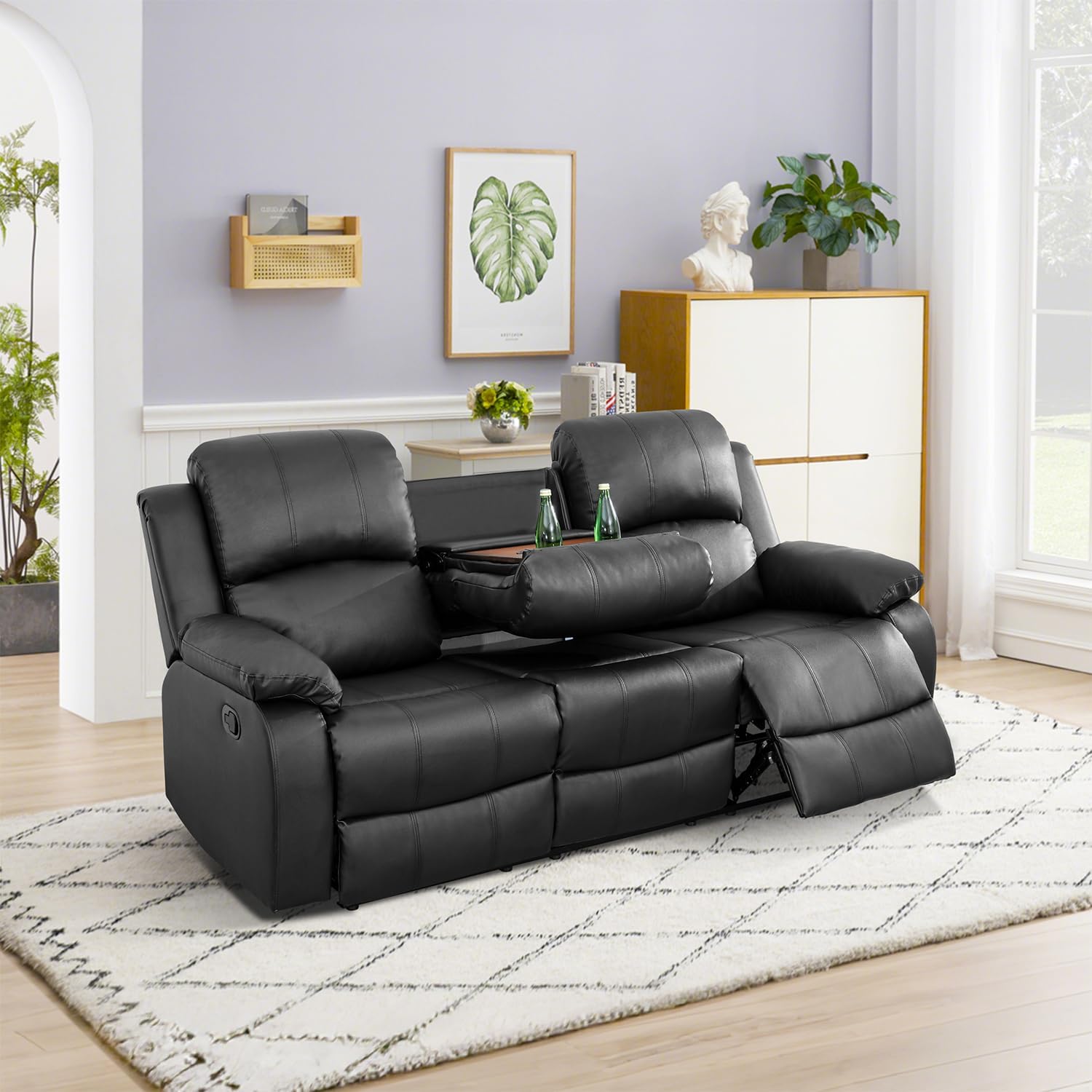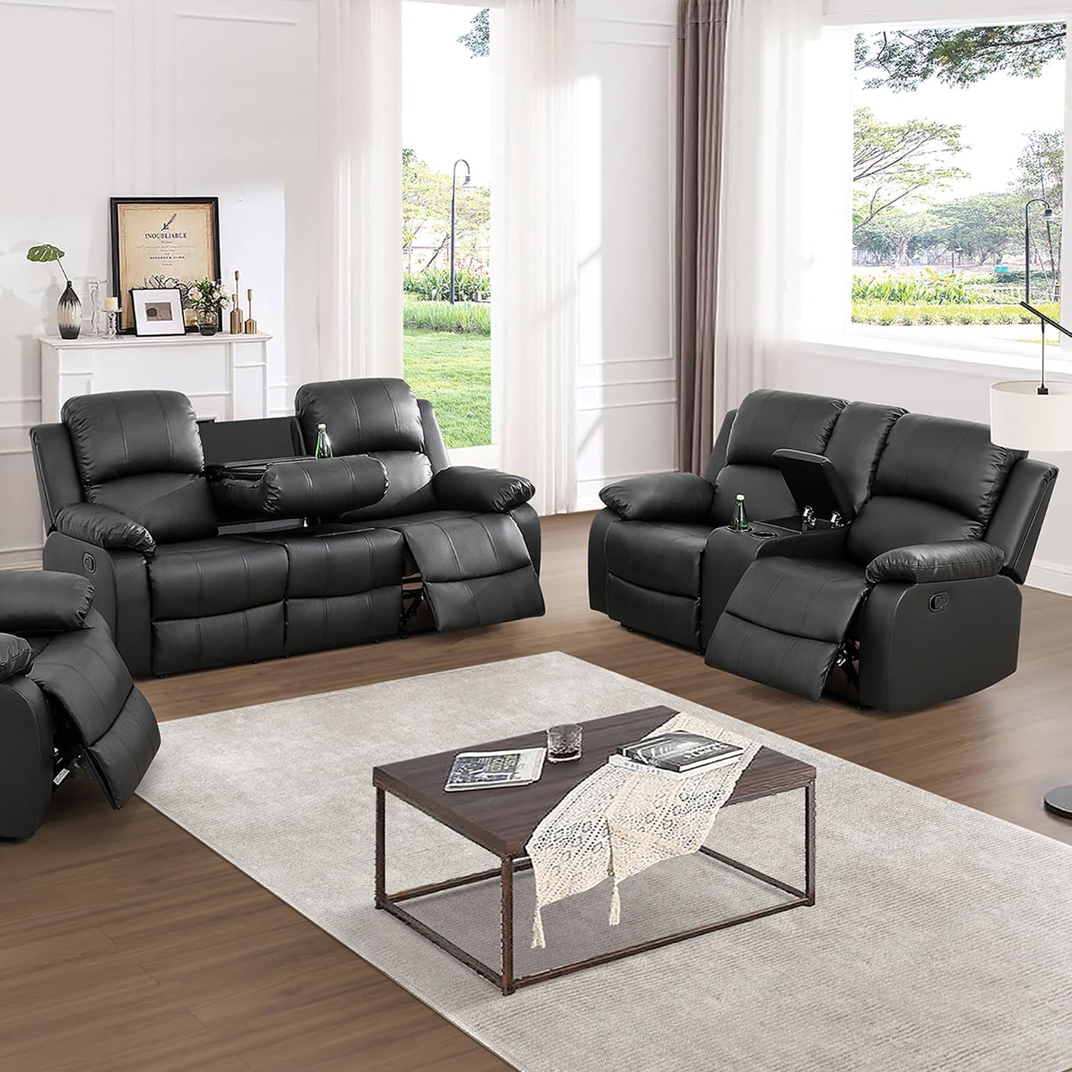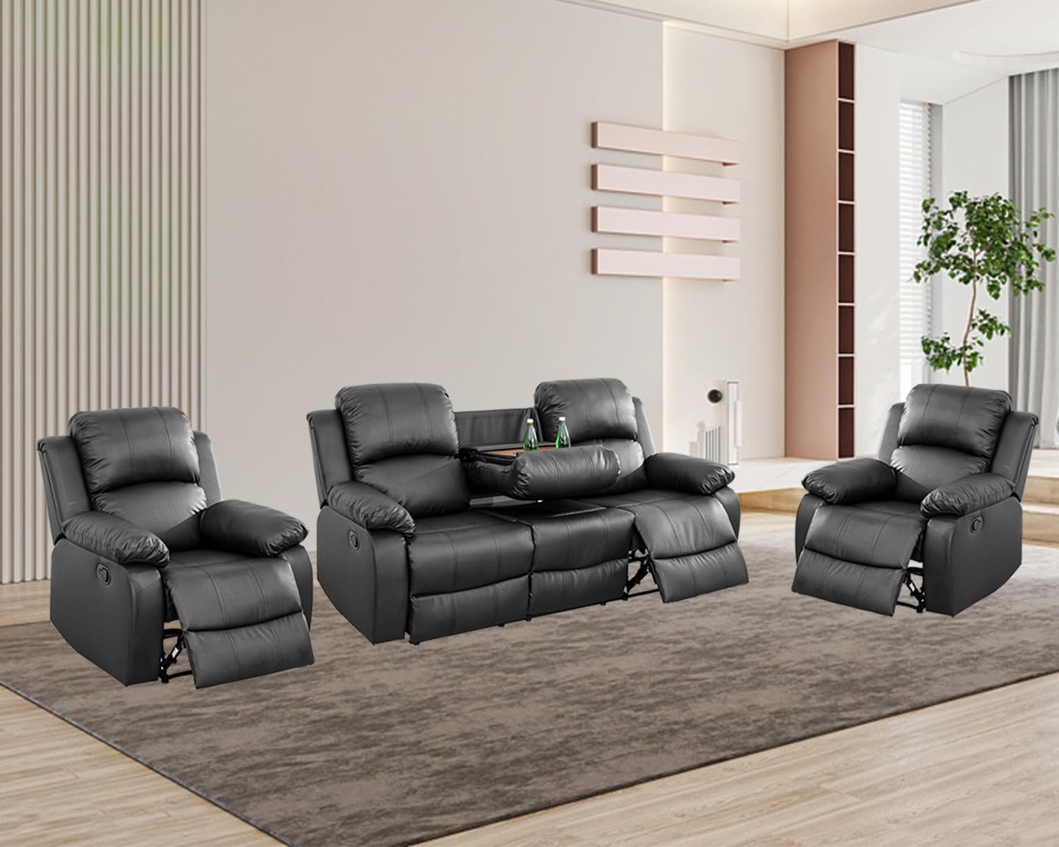 SIENWIEY Manual Recliner Sofa Set for Living Room,Bonded Leather Reclining Sofa Set with Drop Down Table&Storage Console&Cup HolderSKU:2025-8A-GS2800Color:BlackMaterial:Premium Faux LeatherFrame:Solid WoodLoveseat with Storage Console&Two Cup Holders3 Seats Sofa with Drop Down Table⚠NOTE:Only Curbside(Roadside)Del !!!If the type of address you live at is a high-rise apartment it's important to note that truck deliveries are at most as close to the doorway on the first floor as possible.Applicable occasions:Living room,Reading room,Studio,VIP Lounge,Theater,Office ect.
