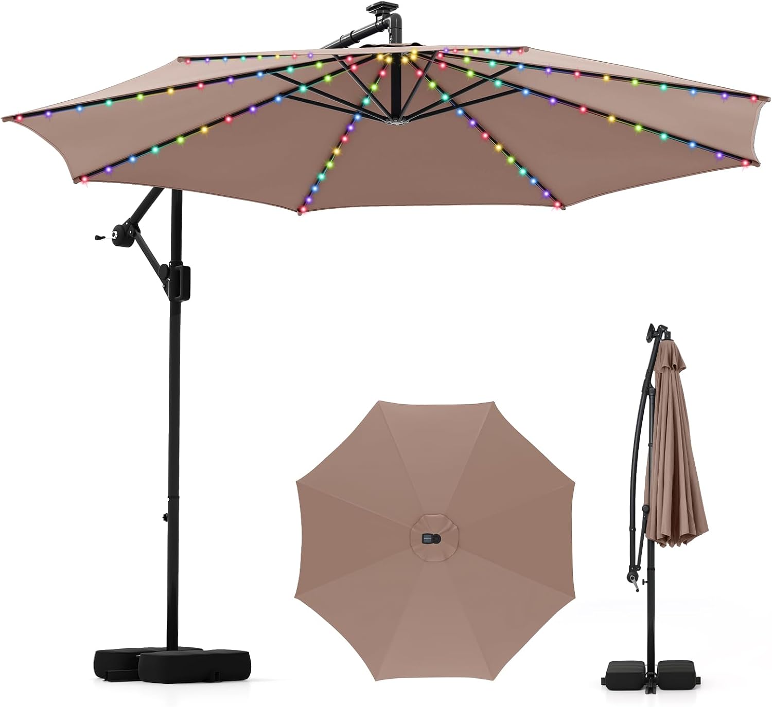 Description:Transform Your Outdoor Space into a Cozy and Illuminated Retract!Our 10 ft offset hanging umbrella not only provides a generous shade area but also enhances evening experiences with its 96 Multi-Colored Flowing LED lights powered by a solar panel. And there are 9 lighting modes available, including static and dynamic modes, allowing you to customize the atmosphere of your outdoor gatherings or personal relaxation time effortlessly. Stability is paramount with our umbrella, supported by 8 robust ribs and secured with a cross base and 2 sandbags capable of withstanding up to 155 lbs. The premium double-tier polyester canopy offers superior protection from the sun and light rain while facilitating air flow through a smartly placed top vent, thus minimizing wind pressure. Designed to provide all-day sunshade, the canopy can be easily tilted as well as rotated 360°, using a straightforward locking mechanism. It caters to both residential leisure and commercial use, providing an ample cool area for backyards, pool sides, and outdoor dining spaces.Features:Equipped with 96 LED lights distributed evenly across 8 ribs, enhance night ambiance9 static and dynamic lighting modes provide the perfect setting for any eveningThe lights are powered by a solar panel, provide 5 H illumination after a full chargeShort press to adjust lighting modes, long press to turn on/off by handy switchSupported by 8 robust metal ribs for excellent stability and wind resistance2 sandbags could withstand a weight of 155 lbsThe infinite tilt and 360° rotation allow you to block the sun from different directionsEasy to tilt, loosen the locking mechanism and then move the handle up and downHow to rotate, loosen the locking mechanism, rotate the canopy, and then lockThe canopy is sun-protective, fade-resistant, water-repellent, tear-resistantFeatures an air vent on the top for optimal airflow and heat dissipationEquipped with a convenient crank handle, easy to open or close the umbrellaSpecifications:Color: Beige/Coffee/Gray/Navy/Turquoise/RedMaterial: Polyester Fabric, MetalProduct Dimensions: 10 x 8.5 ft(Dia. x H)Umbrella Rim Height: 6.7 ftFolding Size: 3 x 3 x 8.1 ft (L x W x H)Net Weight: 33 lbsPackage Includes:1 x Patio Offset Umbrella1 x User’s Manual