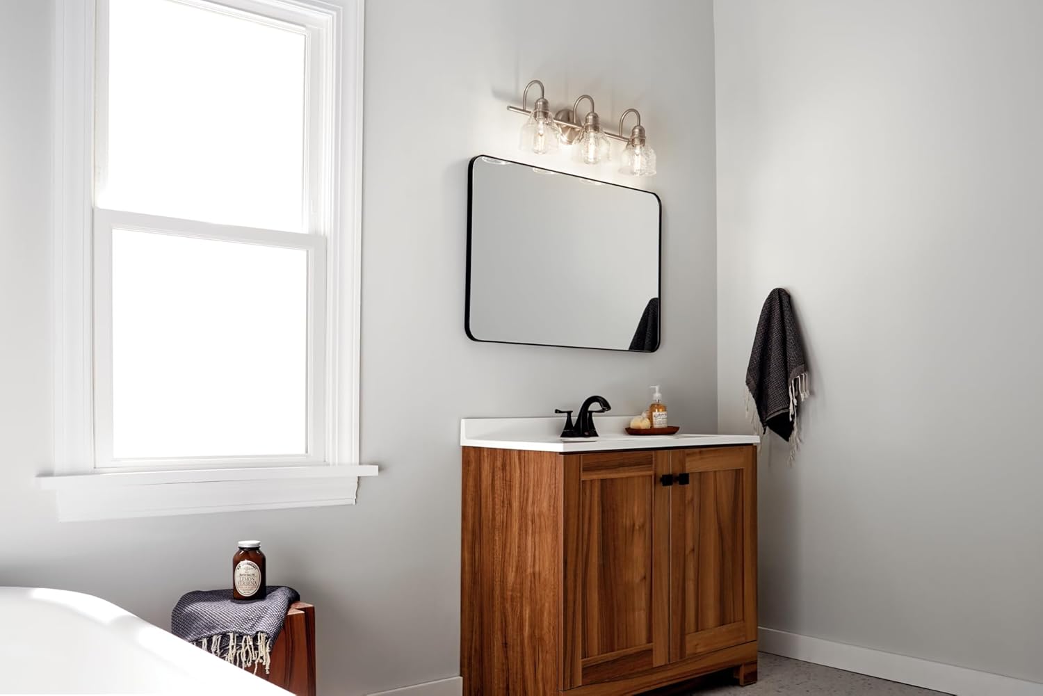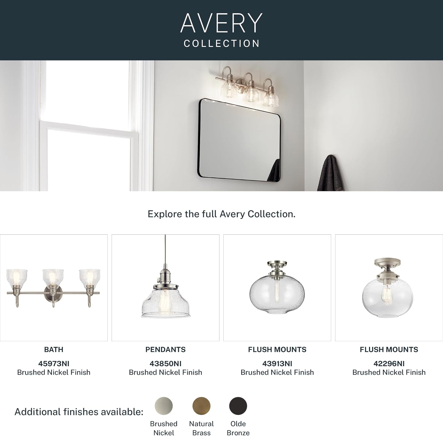 The Avery 24" 3 light vanity light features a classic look with its Brushed Nickel finish and clear seeded glass. The vanity light can be installed with the glass up or down and is damp rated. The Avery vanity light is perfect in several aesthetic environments, including transitional and vintage industrial.