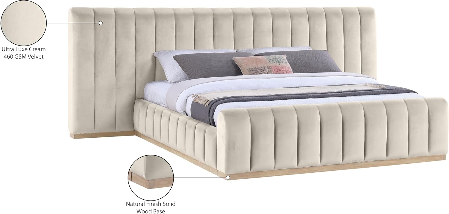 Draped in ultra-luxe 460 GSM velvet, the Amara cream velvet upholstered king bed exudes elegance and sophistication with its lavish, expansive headboard. Its solid wood inner frame provides lasting durability, complemented by a natural-finish solid wood base for a refined touch. Designed with a sleek contemporary aesthetic, this bed seamlessly blends style and comfort.