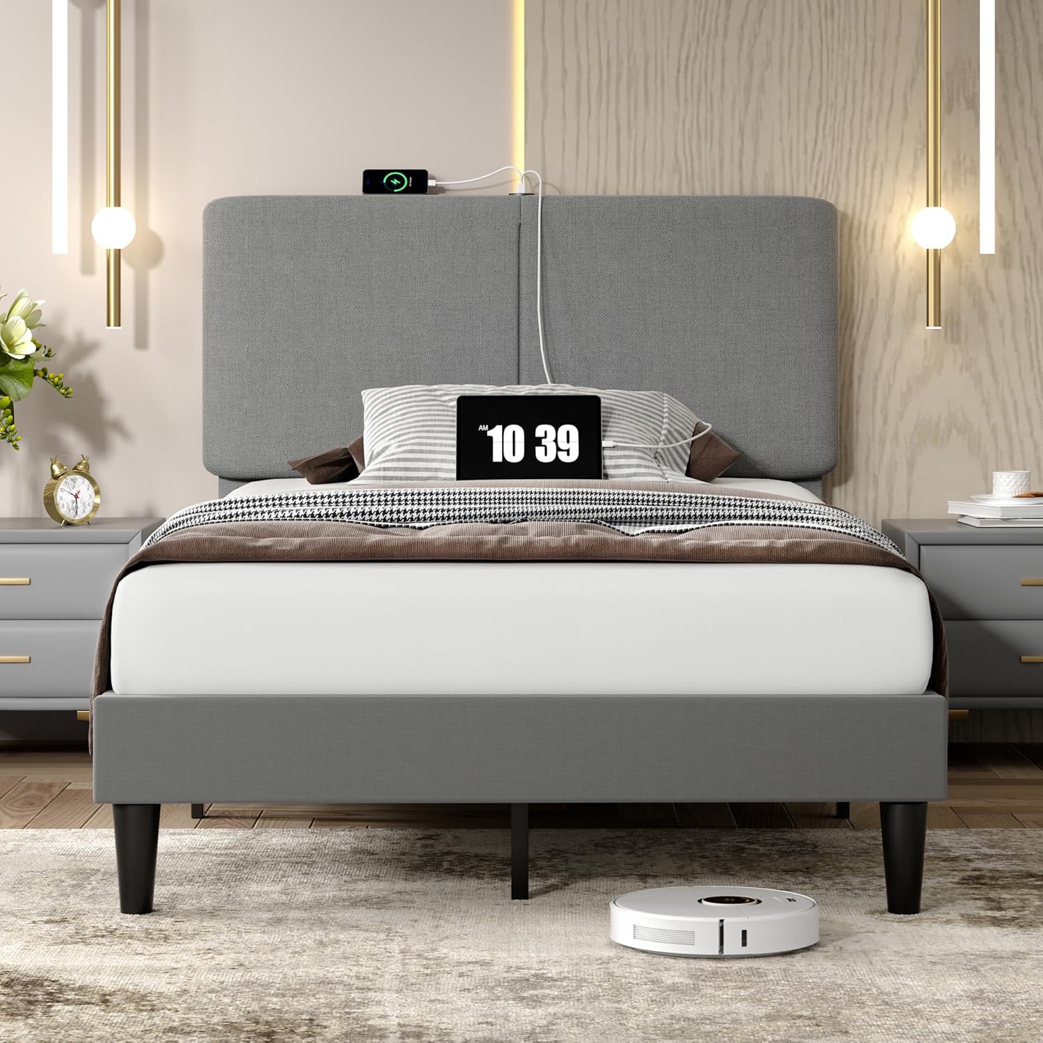 VECELO Queen Bed Frame with Type-C & USB Ports, Upholstered Platform Height-Adjustable Cotton and Linen Headboard, Providing You with the Serenity Sleeping Time.Specification:Color: BeigeMaterial: WoodProduct size:81.5"L x 63.4"W x 47.2"HProduct Weight:74.74 lbsPackage Contents:1x Bed frame1x Installation package1x InstructionVECELO Notes:1. Please read the instruction carefully before assembly2. Contact us when meeting difficulties on installation or any other problems, and your email will be replied to within 24 hours.