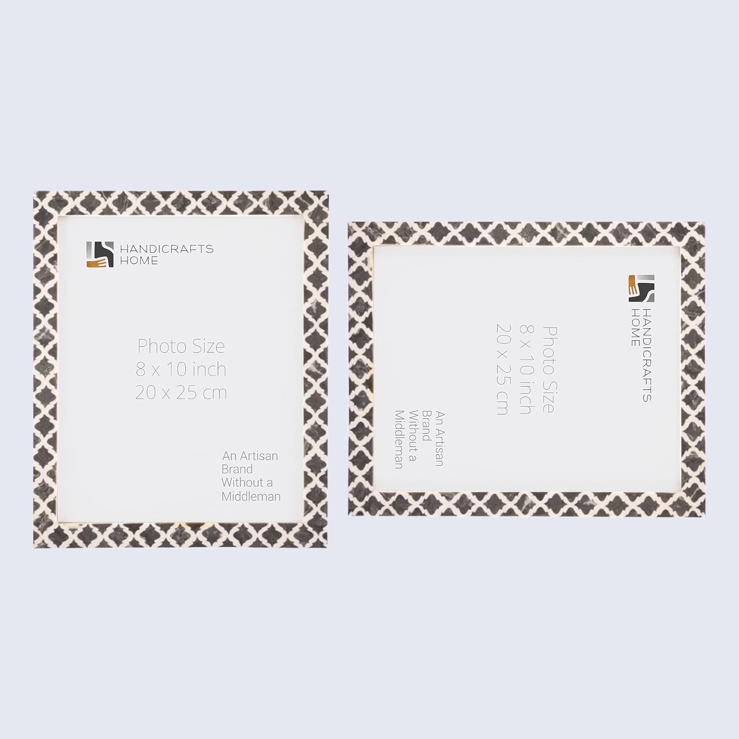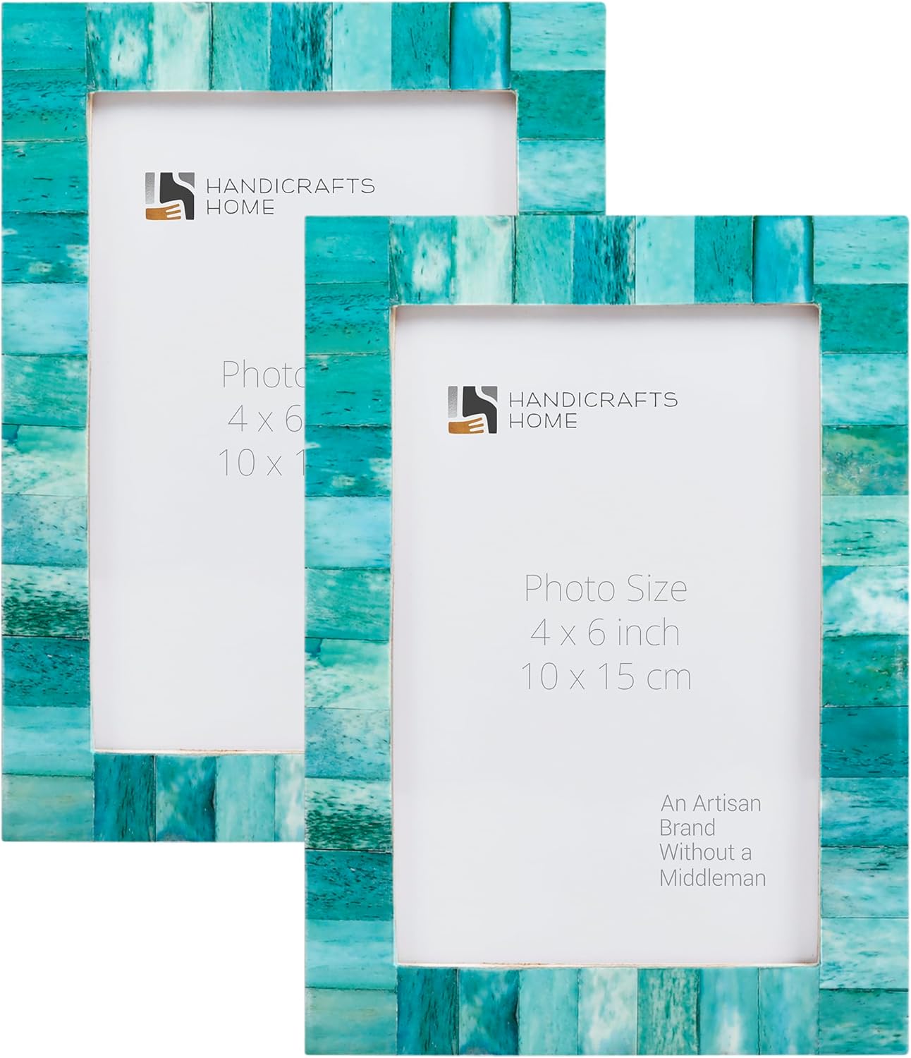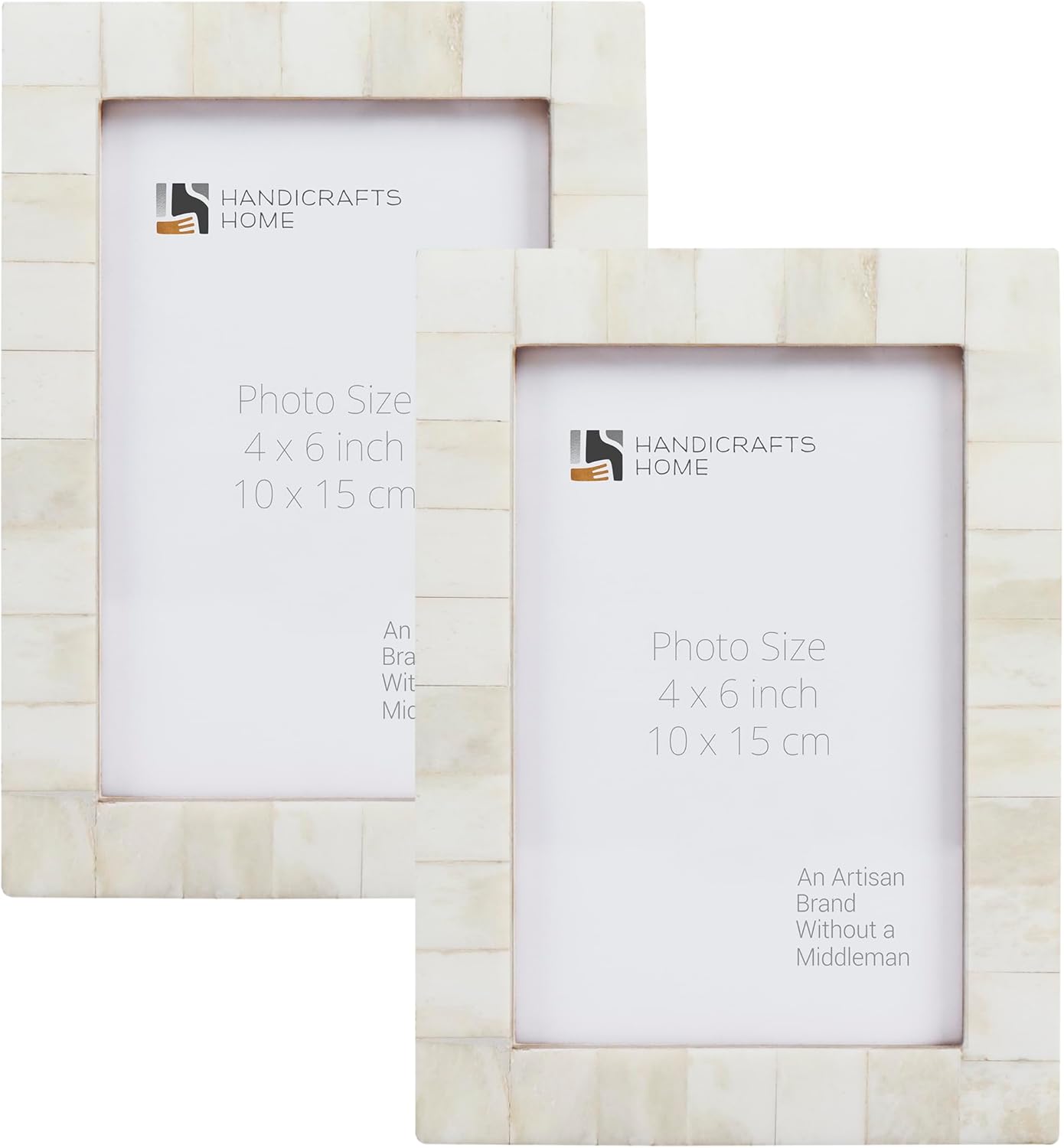 Make a bold yet timeless statement with our Candy Cane Resin Inlay Picture Frame Set. Crafted in striking red and white tones, this structured chevron design creates beautiful rhythm and graphic symmetry, while the smooth white inner border adds balance and refinement. Architectural in presence yet versatile in styling, this coordinated set of two frames transitions effortlessly from festive holiday displays to everyday farmhouse, modern, or classic interiors. Designed to stand confidently on its own or complement curated gallery walls, it brings warmth, craftsmanship, and visual interest to any space without overwhelming surrounding decor. Sold as a coordinated pack of 2 for elevated styling and balanced presentation. Pack Details Set of 2 identical 4x6 picture frames Each frame holds one 4" x 6" photo Easel back for tabletop or shelf display Wall hanging hardware for vertical or horizontal orientation Wrapped together and shipped in one master carton Frames are not individually boxed Materials & Craftsmanship Handcrafted resin inlay Pine MDF base and backing (TSCA Title VI compliant) Clear Plexiglass photo cover for lightweight durability and safer handling Each red and ivory inlay strip is individually cut and carefully placed by skilled artisans. Subtle tonal variations celebrate authentic handcrafted artistry, ensuring every piece is unique. Perfect For Holiday & Christmas decor Farmhouse and modern home decor Living room or bedroom styling Bookshelf and console display Gallery wall arrangements Meaningful gifting Designed in the USA and handcrafted in India by generational artisans preserving traditional inlay techniques, backed by over two decades of craftsmanship excellence.