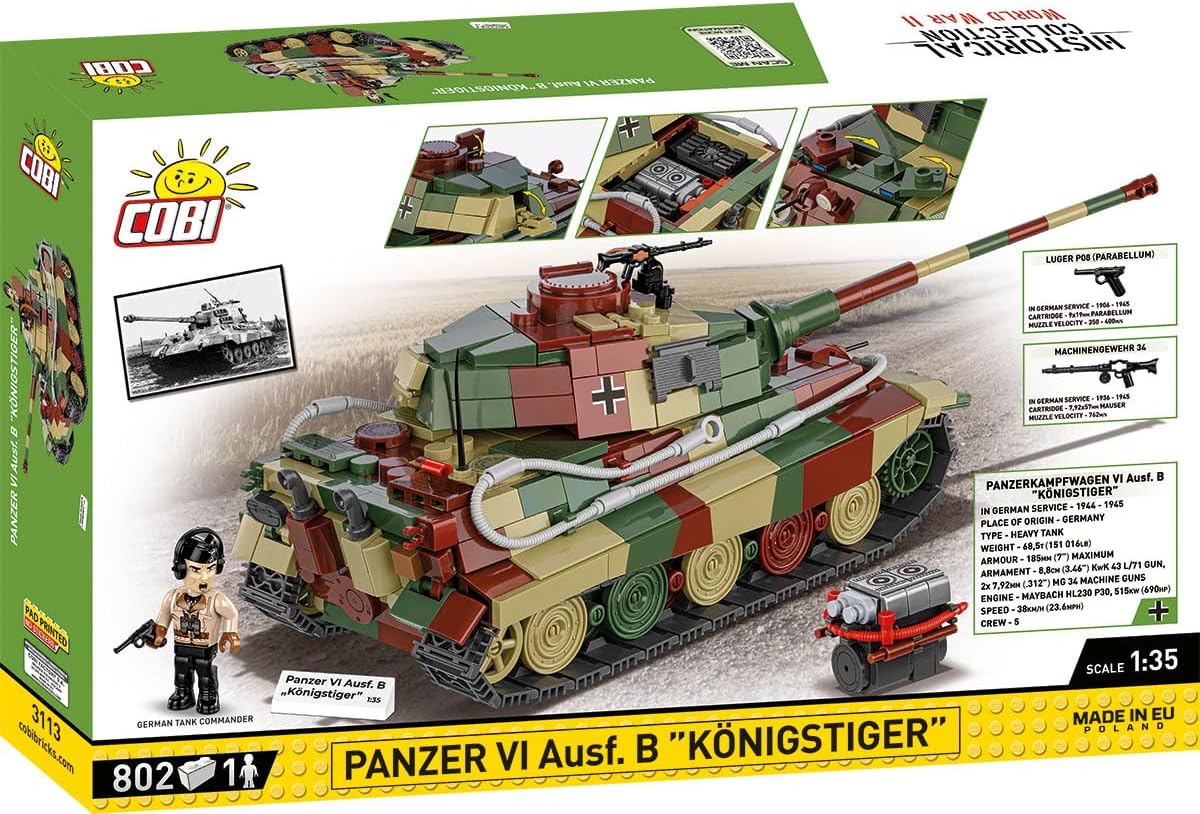 The Tiger II, also known as the Konigstiger (colloquially the King's Tiger), was a German heavy tank used during World War II. For the first time in the COBI offer, the largest tiger was designed in a scale of 1:35 and received a colorful camouflage characteristic of the final period of the war. The model has movable wheels, working tracks, a rotating turret with a movable cannon, a hatch in which you can place a figure, a removable engine and many other details! PANZERKAMPFWAGEN VI Ausf. tanks. B "KONIGSTIGER" were introduced into service in 1944 and were one of the most powerful tanks of their time. The Tiger II combined thick armor, reaching up to 180mm on the front of the hull, with a powerful 88mm KwK 43 L/71 gun, which made it a formidable opponent on the battlefield. Its weight was about 70 tons. The Maybach HL230 P30 engine with a power of 700 HP allowed it to reach speeds of up to 38km/h on the road. Despite its impressive combat performance the Tiger II had numerous technical problems, including frequent engine and chassis failures. Its complex design and enormous resource consumption made production expensive and time-consuming. A total of approximately 492 units were produced. The Tiger II took part in many key battles, including the Battle of the Bulge and the fighting on the Eastern Front. Its presence on the battlefield had great psychological significance, but in practice it was often limited by logistical and technical problems. Despite the flaws, the Tiger II remains one of the most famous and recognizable tanks of World War II.