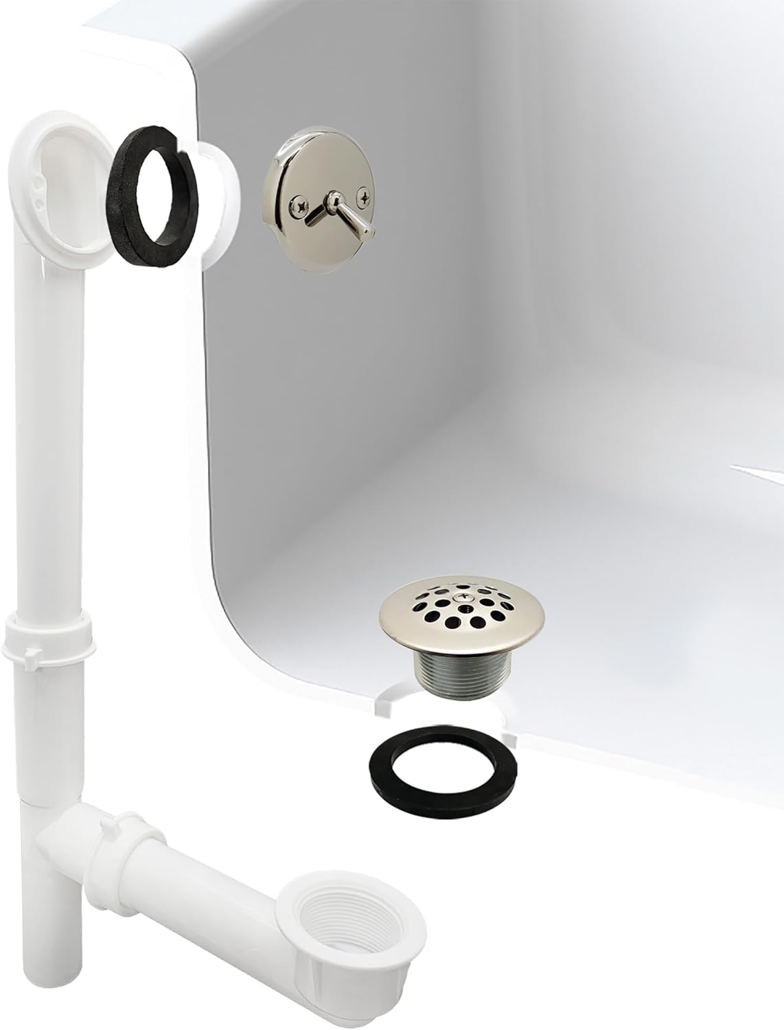 Upgrade your bathtub with this Westbrass Tubular Trip Lever Bath Waste Drain Kit — a professional-grade solution designed for durability, performance, and style. This complete 1-1/2 inch x 14 inch bath waste assembly features white poly slip-joint tubing, allowing for easy alignment and leak-free connections during installation. The included drain shoe features a beehive-shaped Gerber-style grid strainer with a center screw for effective drainage and debris capture. A two-hole trip lever faceplate comes with matching 1/4"-20 x 1-1/2" plated brass screws, offering a clean, secure fit that enhances your bathtub’s appearance. The kit also includes a two-hole overflow elbow, drain shoe, and tee — everything needed for a seamless connection to standard tub systems. Finished with heavy-duty metal trim, this drain kit is built to last and adds a polished, professional touch to any bathroom renovation or replacement project. Be sure to check out our other model styles and VISIT OUR WESTBRASS STOREFRONT for more Kitchen and Bath items to stylize your home with convenient functionality and beauty.