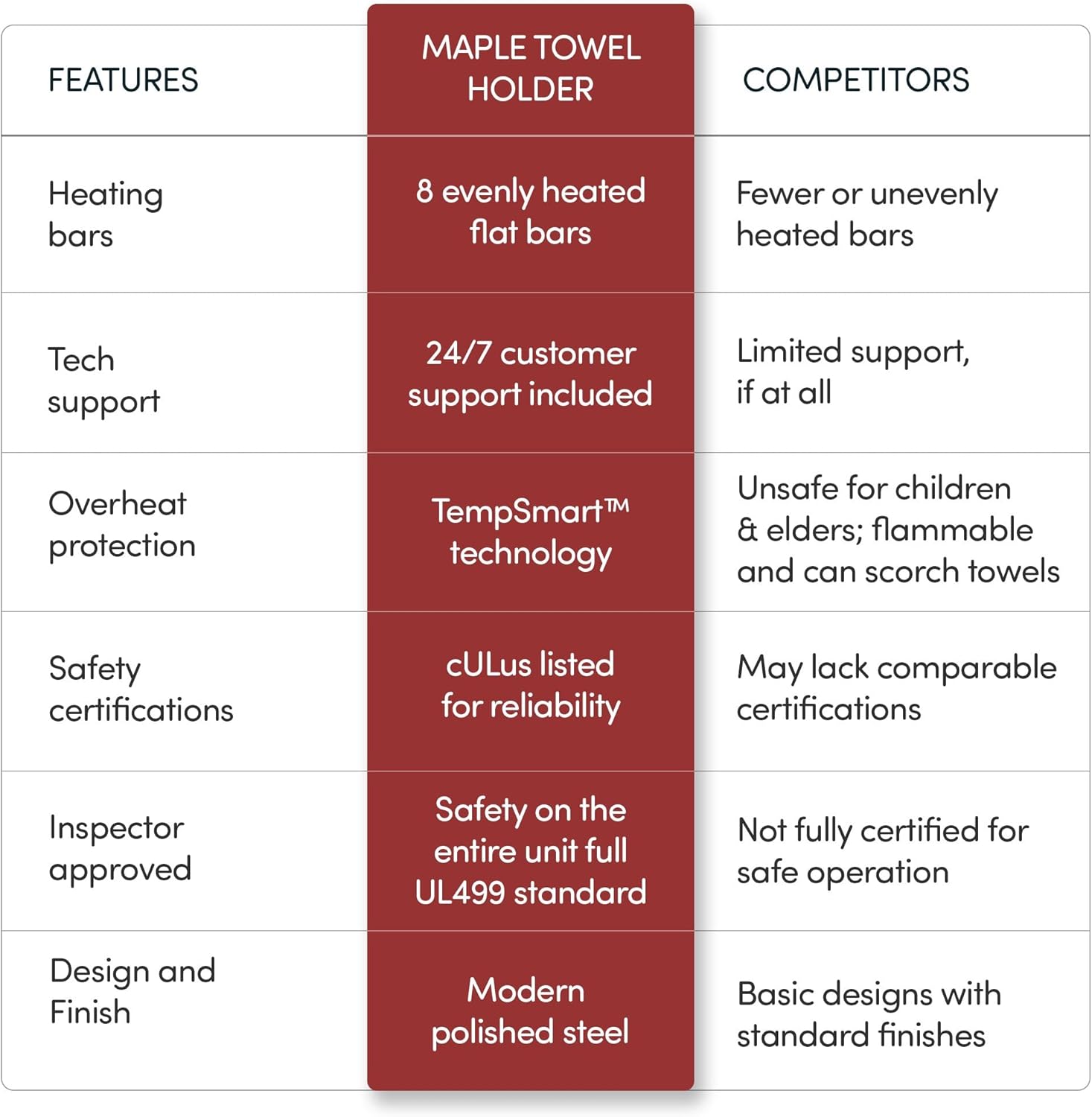 The Maple towel warmer from WarmlyYours combines a unique design with impressive functionality. This wall-mounted towel warmer features 8 heated, flat bars which allows the Maple to provide a heat output of 358 BTUs per hour. The flat bars of this heated towel rack have more surface area than traditional round or square bars for expedient heating of your towels or bathrobes. The design also incorporates a spacing that allows the top pair of bars to perfectly accommodate hand towels. The hardwired connection (120 VAC) of the Maple will ensure no visible wires or cords. This version of the Maple comes with a beautiful, polished finish and durable 304-stainless steel construction. This model comes with built-in TempSmart overheat protection to prevent the unit’s surface temperature from exceeding 149°F (65°C).