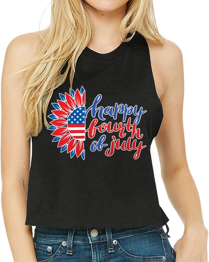Cute and flattering Happy Fourth Of July Racerback Cropped Tank is suitable for most indoor or outdoor activities, such as gym, yoga, running, hiking, beach or relaxing around the house. Pair Flower Women's Tank with your favorite sports bras, especially strappy ones, and high-waisted leggings, then you will enjoy cool and comfortable exercise throughout the summer.