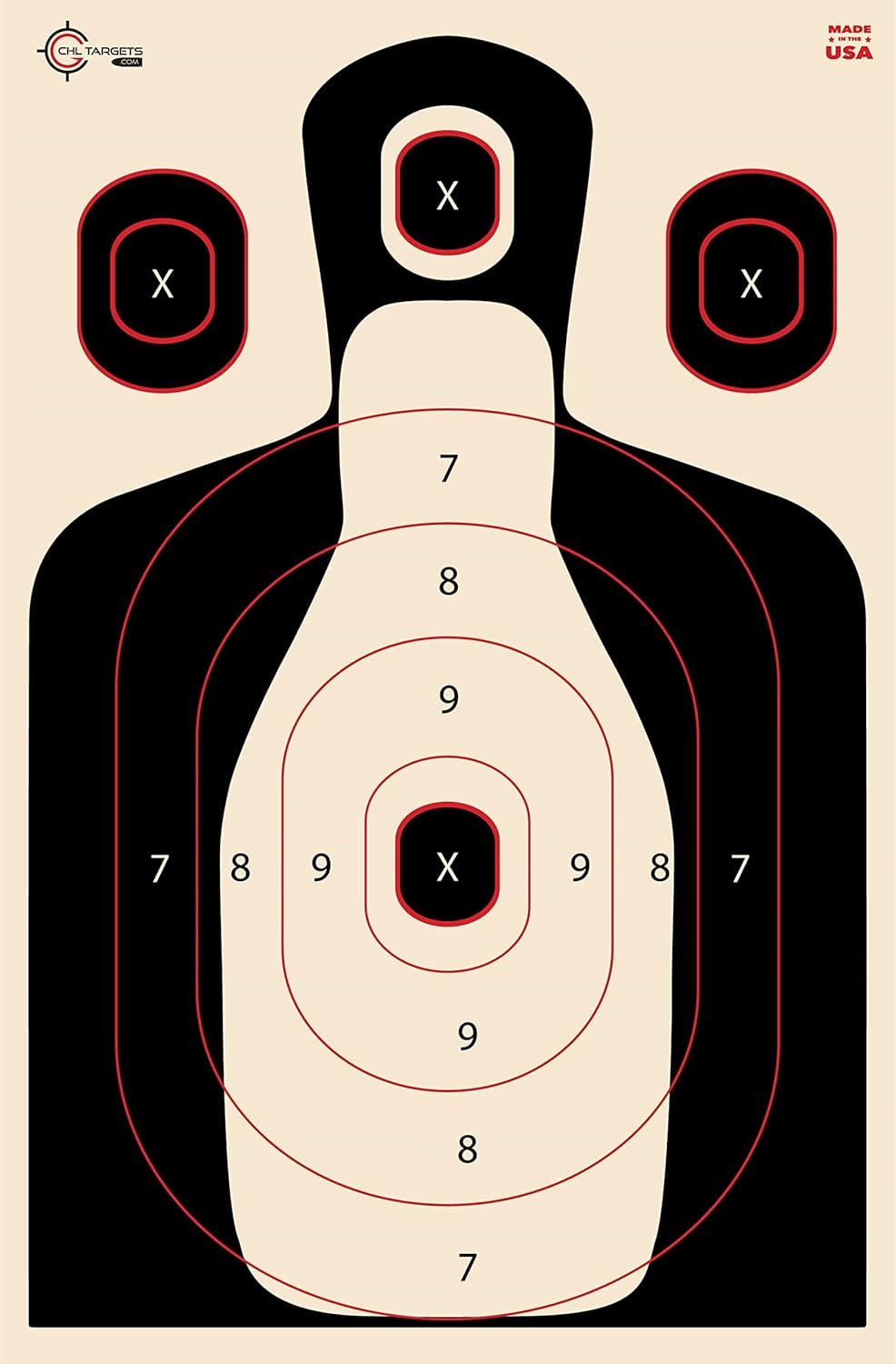 The Official FBI-Q Shooting Target is the perfect tool for shooters to practice, train and hone their skills. This center mass silhouette paper shooting target features a full size human outline with scoring rings that simulate real life scenarios. Designed to help improve accuracy, this paper shooting target is ideal for use at indoor or outdoor gun ranges. With its easy setup and high visibility design, it's sure to become an essential part of your range equipment! All targets sold by CHL Targets are Made In The USA.