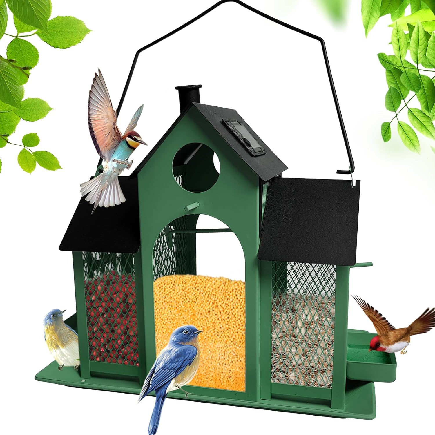 Solar Bird Feeder House for Outside Hanging, Large Capacity Birdhouse Bird Feeders Hanging for Outdoors, Metal Mesh Wild Birdfeeder for Finch Cardinal (Red and Black)
