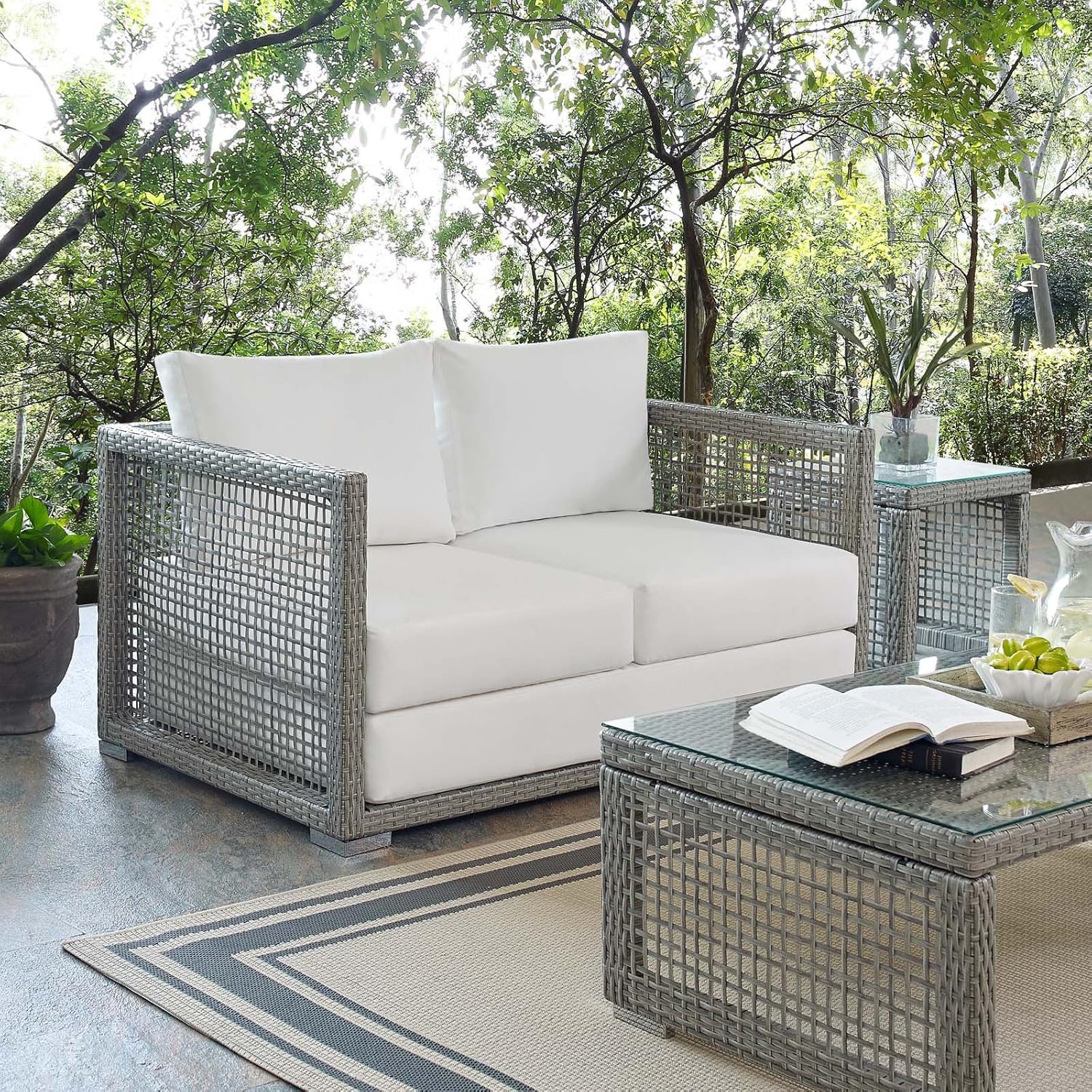 Weave conversational threads into a rollicking good time with Aura Outdoor Patio Sofa. Aura is a patio sofa that comes with a synthetic gray-on-gray tone wicker rattan weave and a powder-coated aluminum frame that delivers a softly versatile outdoor collection that shifts to meet the needs of the moment. Outfitted with machine washable and fade resistant all-weather fabric cushions, and designed with an extra wide and deep body, Aura Outdoor Couch will make your outdoor spot the focal point of good memories and festive gatherings while enhancing your patio, backyard or poolside arena. Featuring thick cushions and non-marking foot caps, enjoy spacious seating and enhanced comfort with this reliable piece of outdoor furniture. Comes fully assembled.