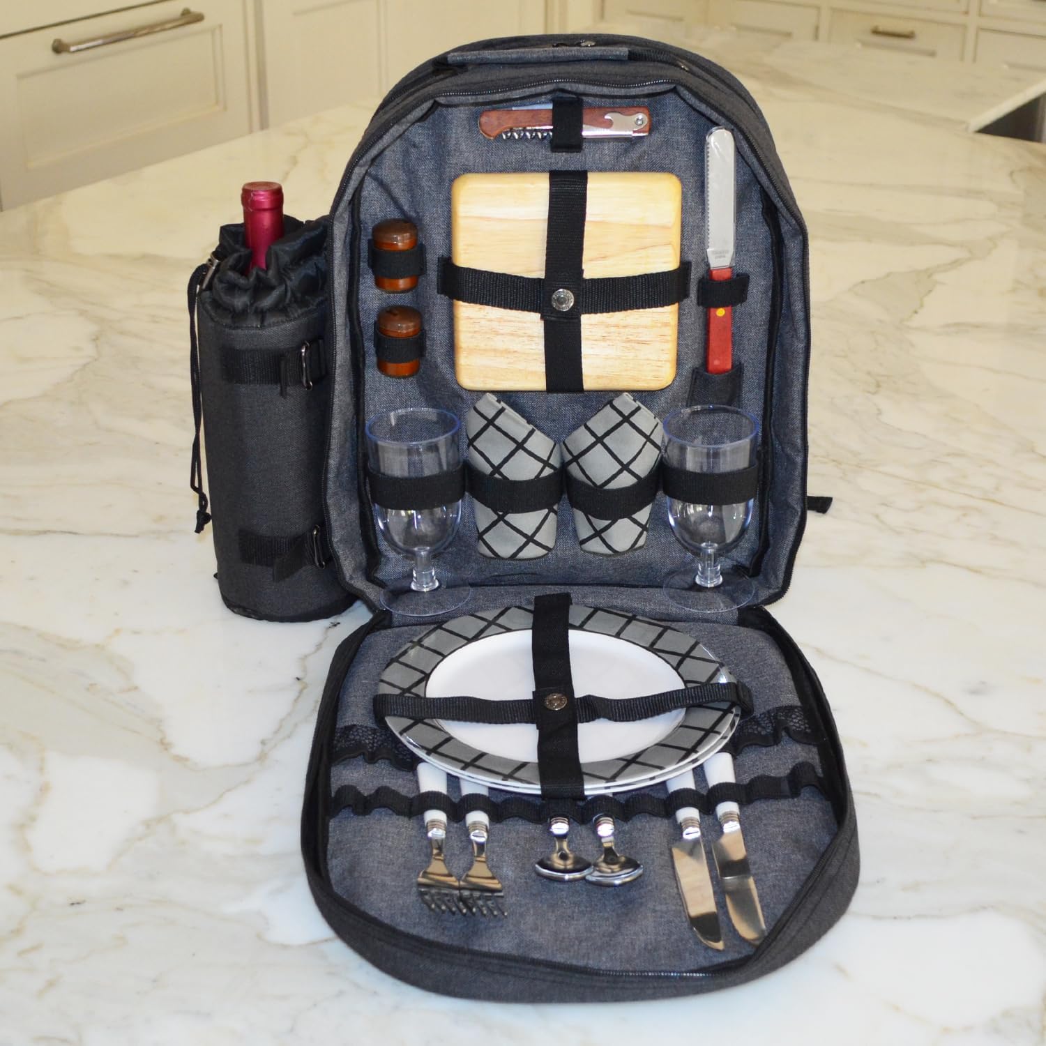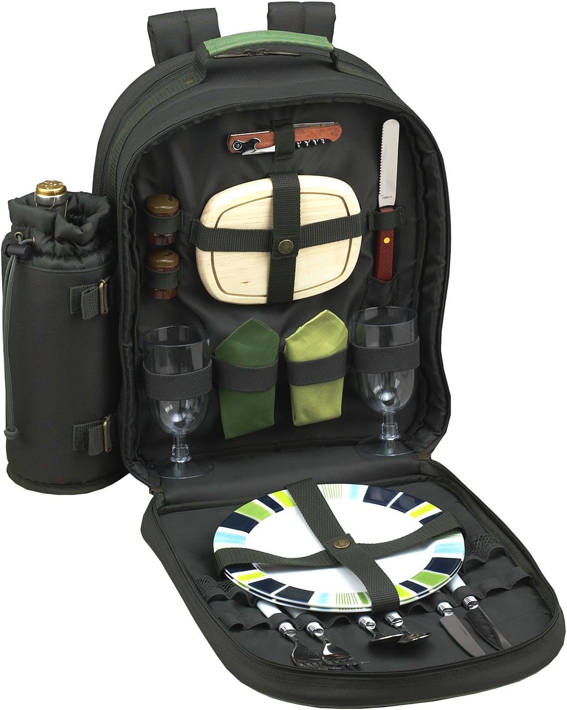 Fully equipped picnic Backpack for two with detachable insulated wine holder & Thermal Shield insulated cooler section to keep food and drink at the perfect temperature. Includes combination corkscrew, hardwood cutting board, cheese knife, wooden salt & pepper shakers with non spill tops, acrylic wine glasses, 9" melamine plates, stainless steel flatware, and napkins. Constructed of 600D polycanvas. Designed and assembled in the USA. Lifetime warranty.