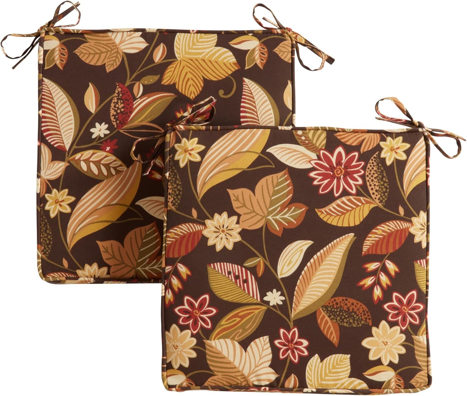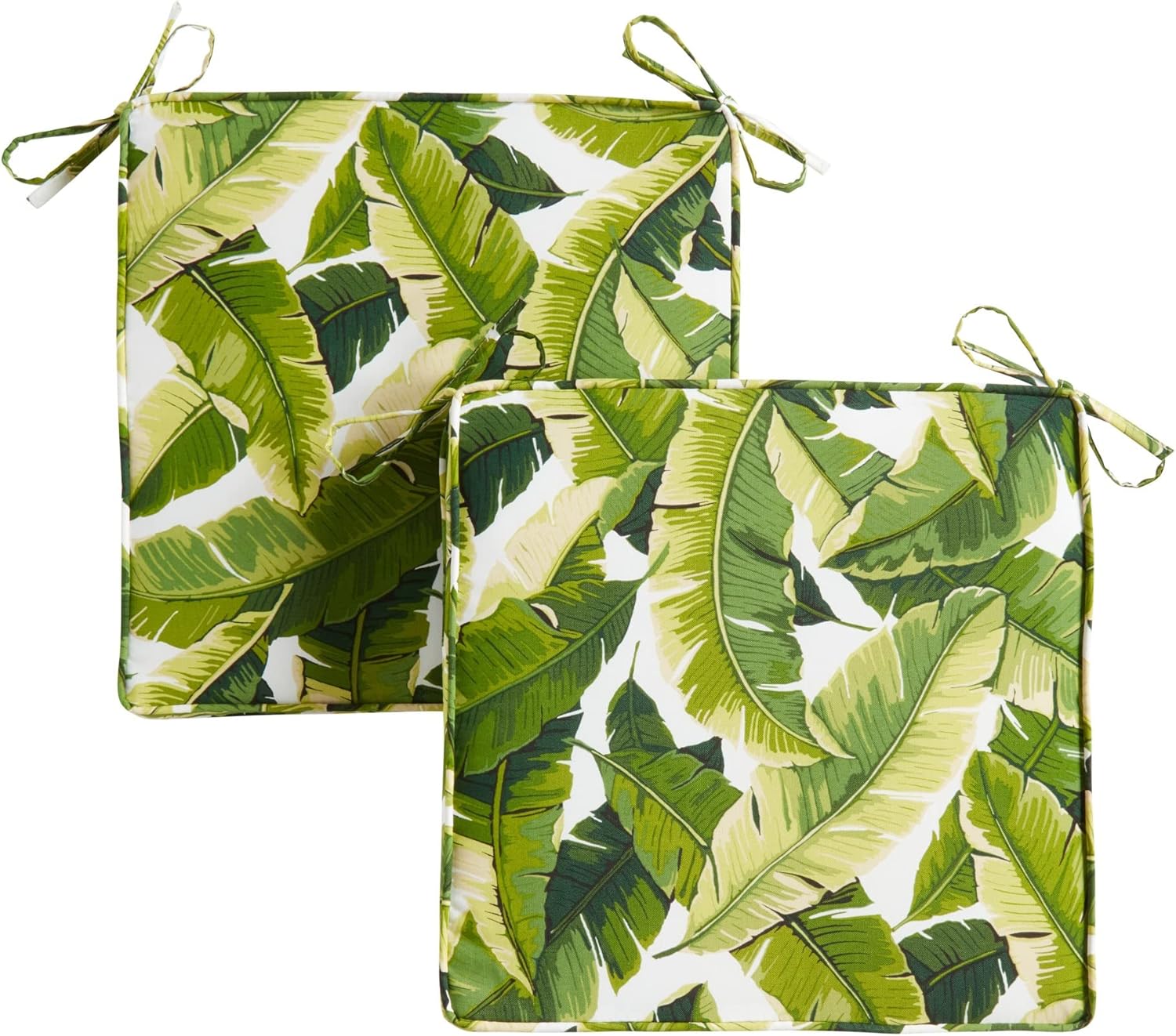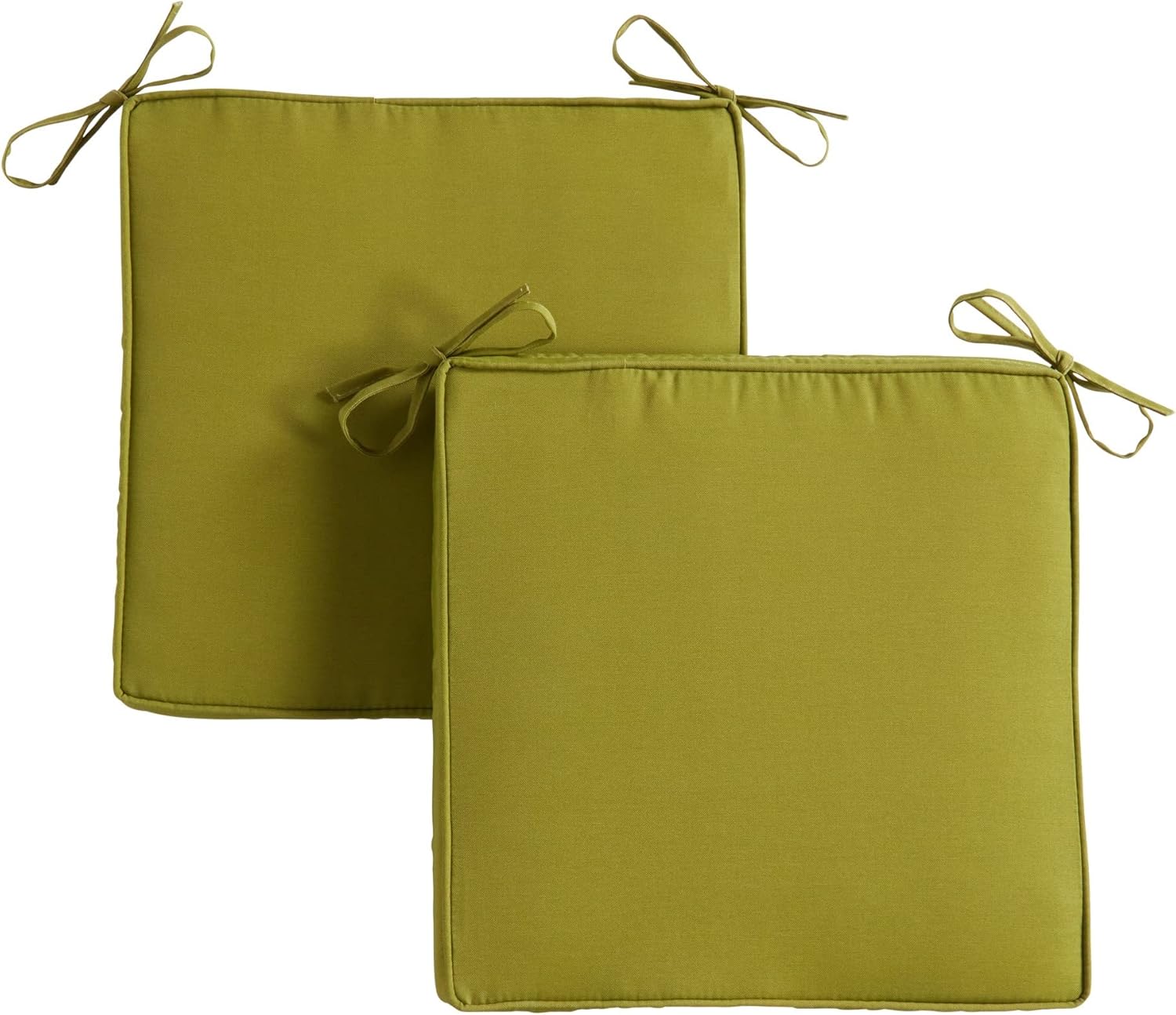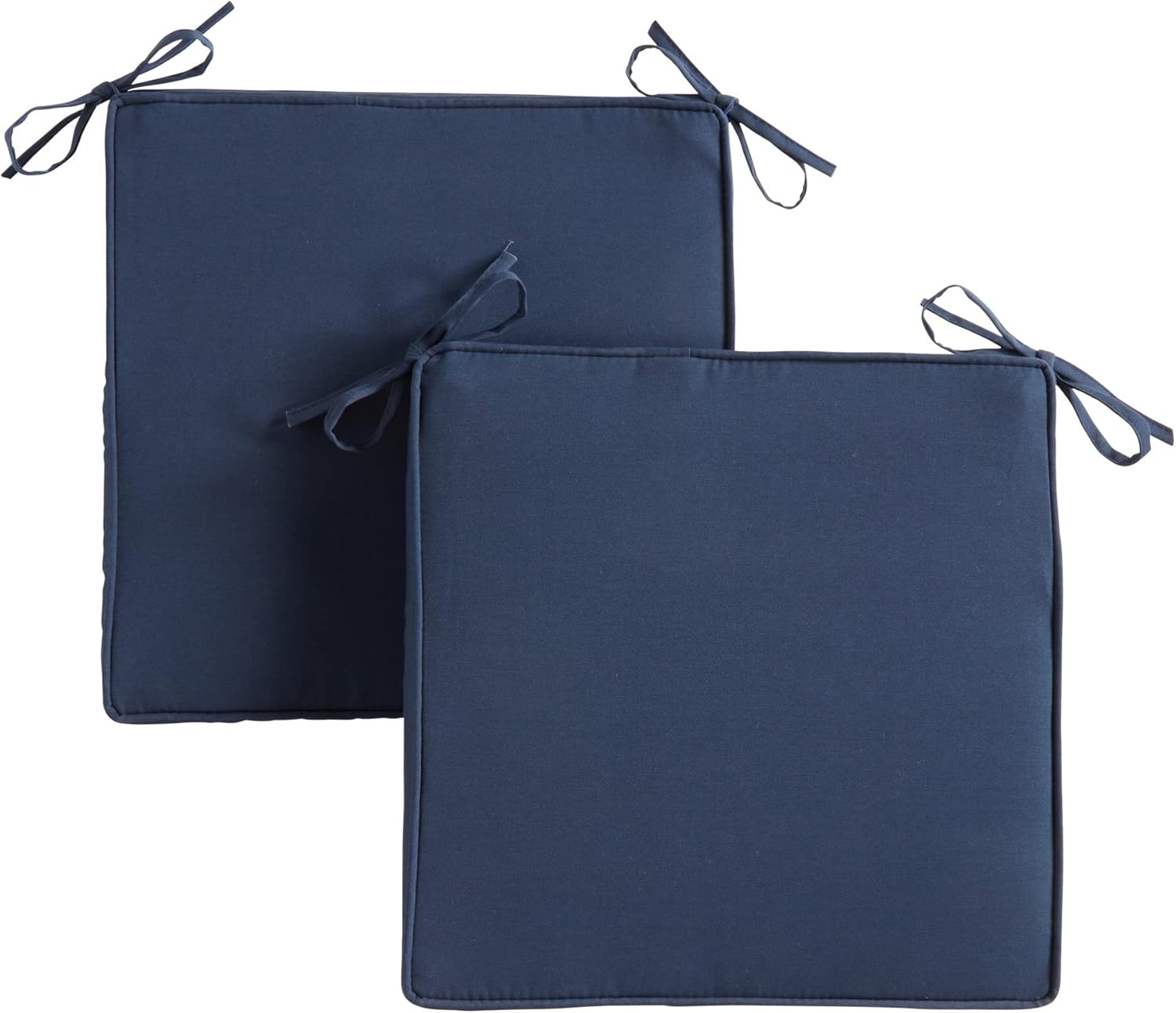 Freshen up your outdoor seating with this set of 2 square chair pads from Greendale Home Fashions. A dense fiberfill insert gives this cushion a smooth finish, and eliminates any shifting for a more consistent comfort. Our durable outdoor polyester fabric resists fading, repels water, stains and spills, and is available in a wide variety of colors and patterns. Use with other Greendale cushions and pillows for a coordinated look. To prolong the life of our cushions and keep them looking beautiful, we recommend storing them indoors or covered when not in use.Please be sure to measure your furniture before purchasing this cushion to ensure a proper fit. A dimensional diagram is provided in the image section for your convenience.In an effort to reduce waste, your cushions will arrive in a recyclable box with no additional plastic waste.