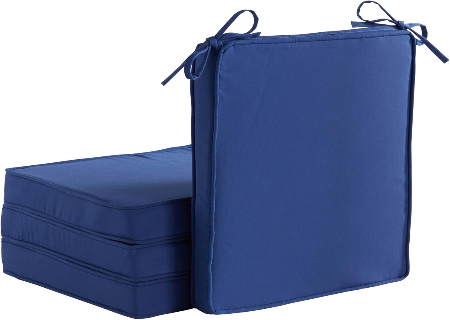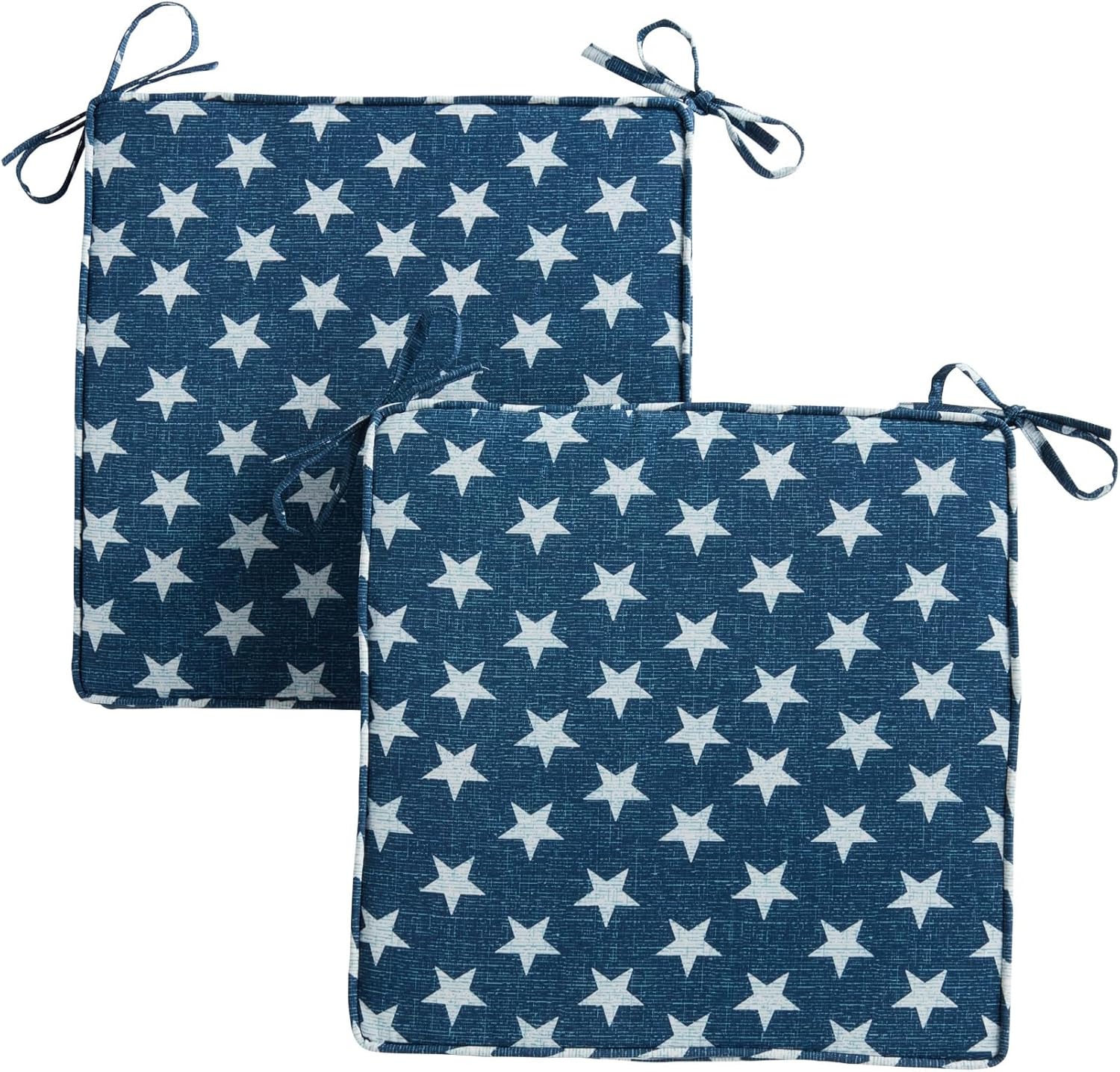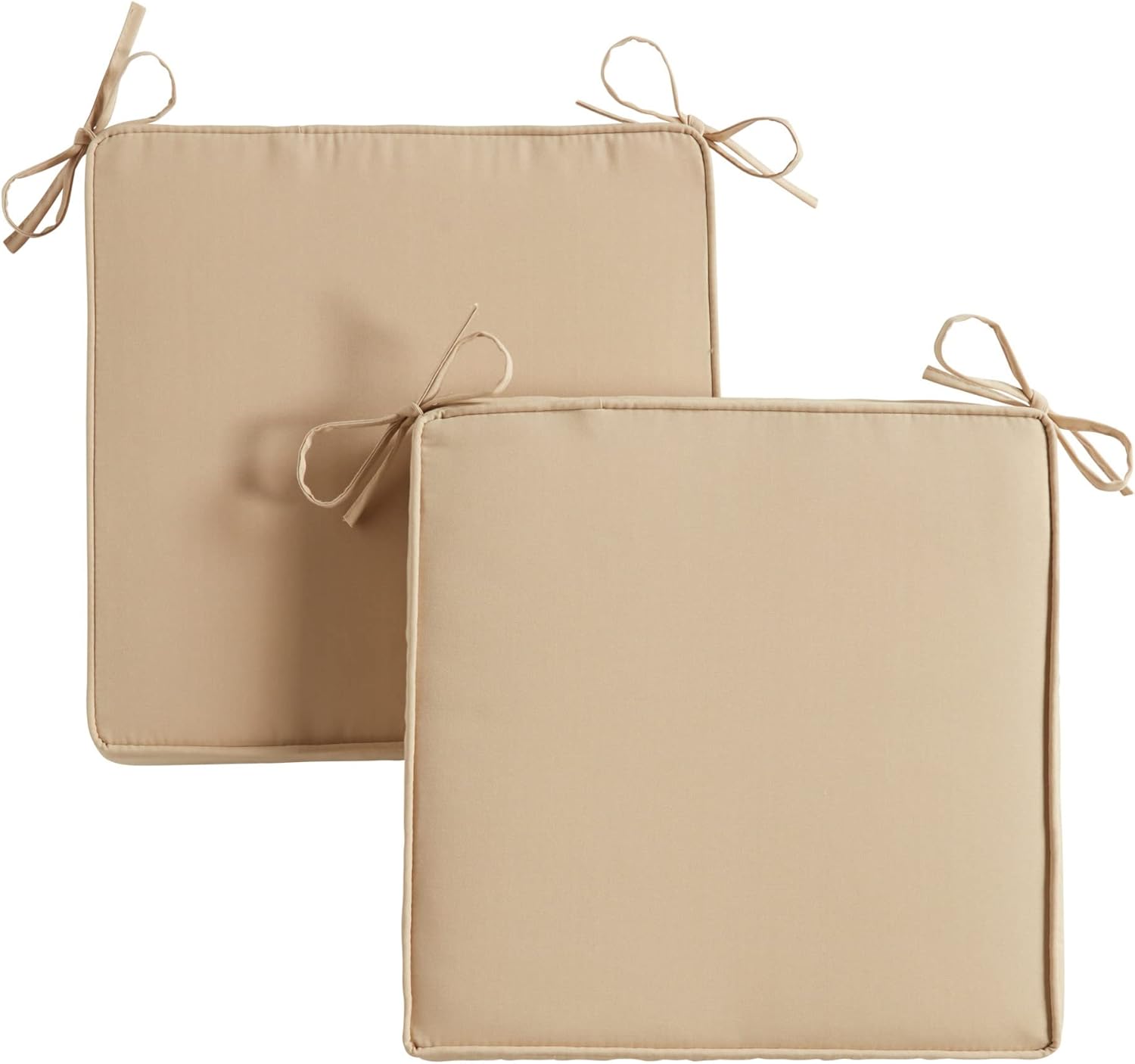 Freshen up your outdoor seating with this set of 2 square chair pads from Greendale Home Fashions. A dense fiberfill insert gives this cushion a smooth finish, and eliminates any shifting for a more consistent comfort. Our durable outdoor polyester fabric resists fading, repels water, stains and spills, and is available in a wide variety of colors and patterns. Use with other Greendale cushions and pillows for a coordinated look. To prolong the life of our cushions and keep them looking beautiful, we recommend storing them indoors or covered when not in use.Please be sure to measure your furniture before purchasing this cushion to ensure a proper fit. A dimensional diagram is provided in the image section for your convenience.In an effort to reduce waste, your cushions will arrive in a recyclable box with no additional plastic waste.