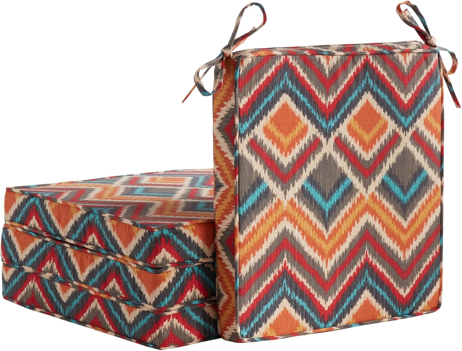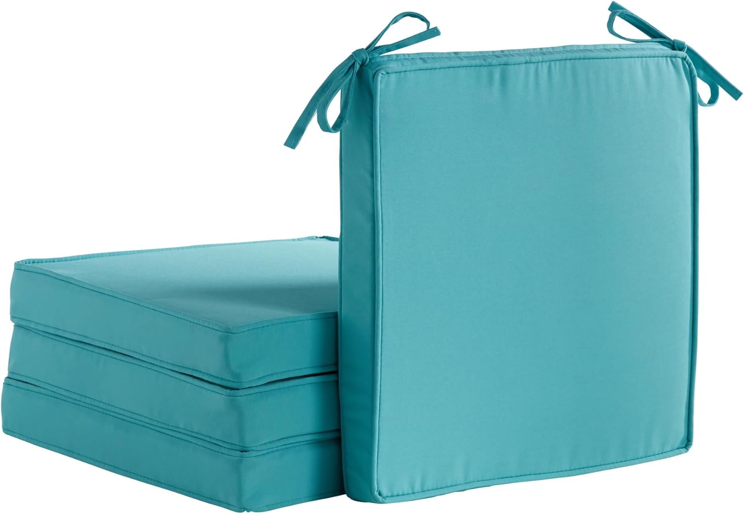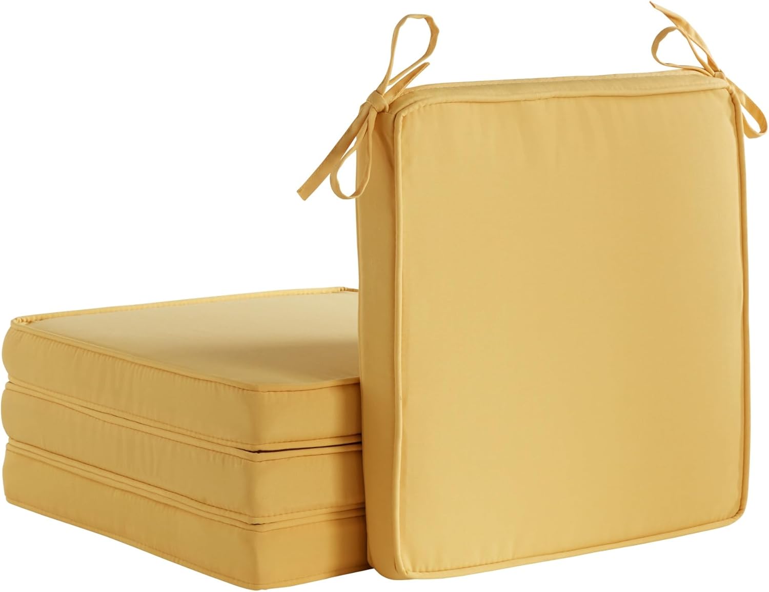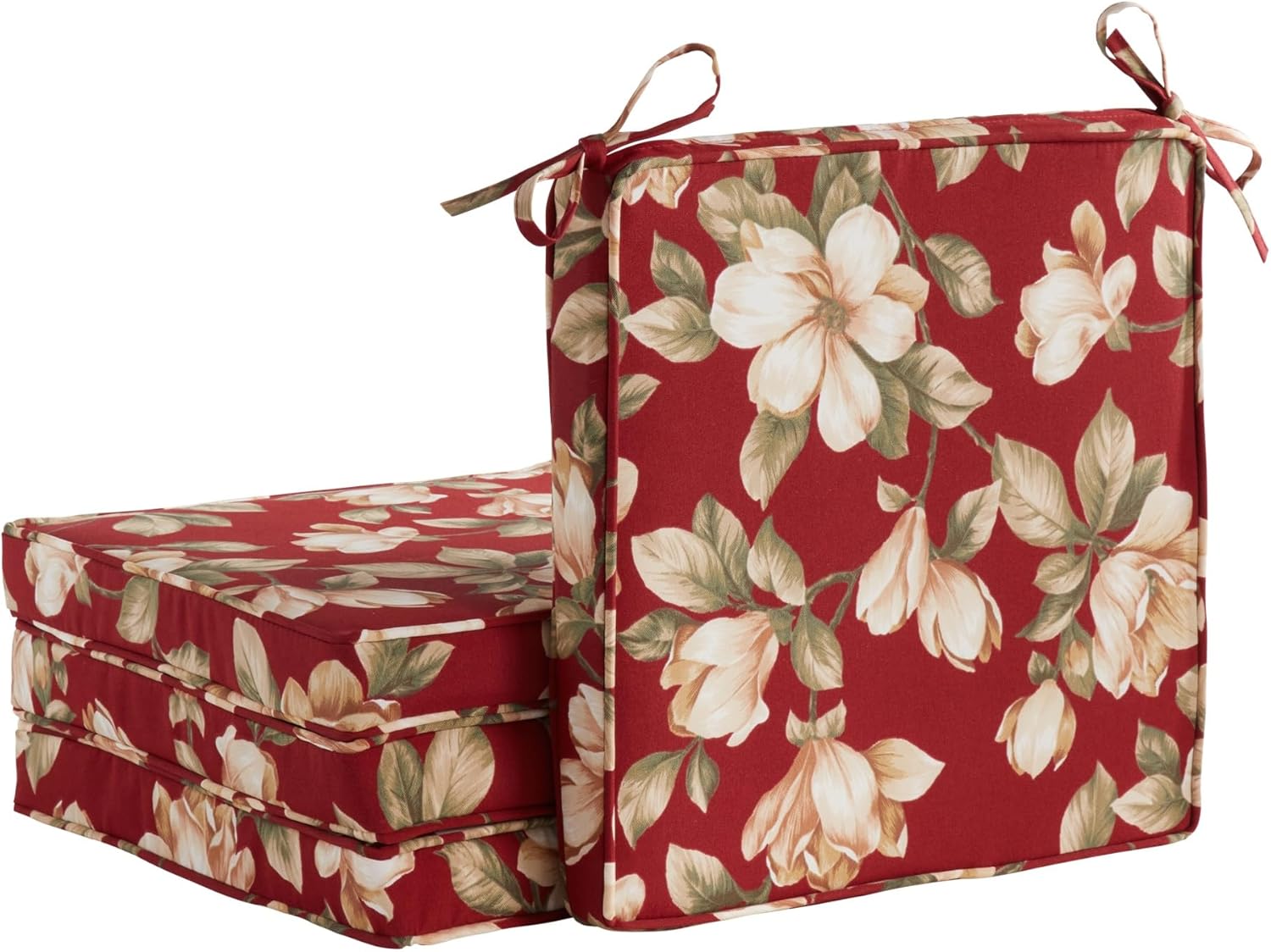 Freshen up your outdoor seating with this set of 2 square chair pads from Greendale Home Fashions. A dense fiberfill insert gives this cushion a smooth finish, and eliminates any shifting for a more consistent comfort. Our durable outdoor polyester fabric resists fading, repels water, stains and spills, and is available in a wide variety of colors and patterns. Use with other Greendale cushions and pillows for a coordinated look. To prolong the life of our cushions and keep them looking beautiful, we recommend storing them indoors or covered when not in use.Please be sure to measure your furniture before purchasing this cushion to ensure a proper fit. A dimensional diagram is provided in the image section for your convenience.In an effort to reduce waste, your cushions will arrive in a recyclable box with no additional plastic waste.