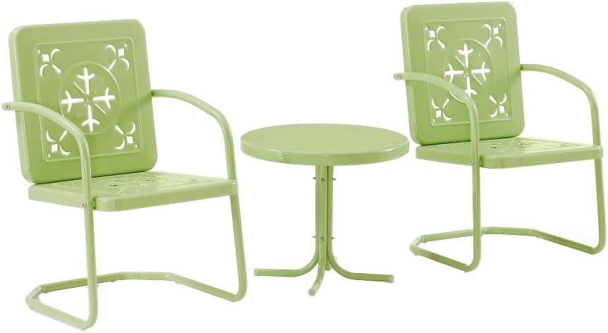 The Azalea 3-Piece Chair Set brings a touch of retro charm and vibrant color to your front porch. Designed to withstand the elements, this outdoor set features durable, powder-coated steel construction. The patio chairs combine timeless decorative cutouts with the subtle recline of a cantilever base, while the side table offers a sturdy surface to complement the chairs. Stylish and versatile, this set turns your outdoor space into a cozy spot for everyday moments.
