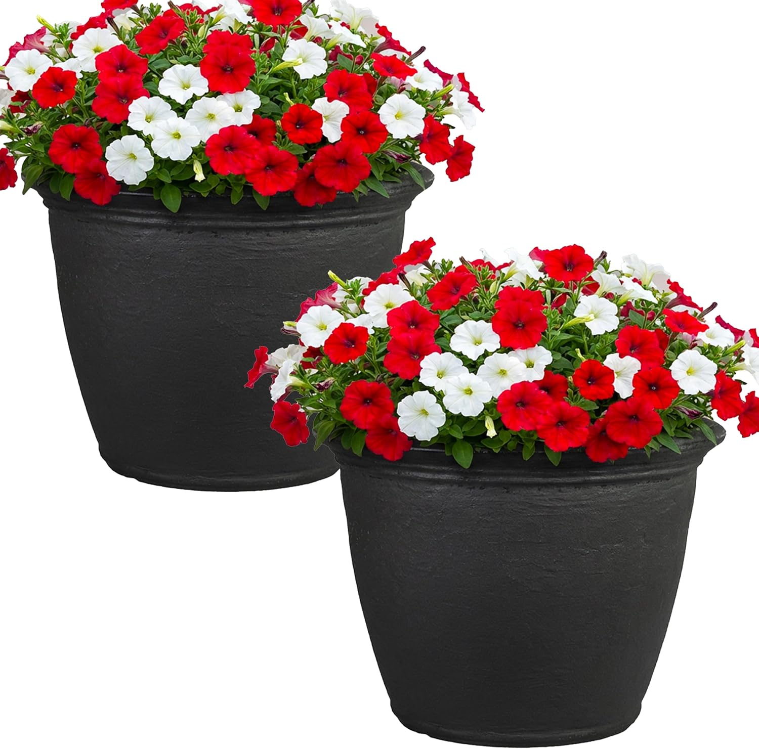 Create a beautiful accent for plants in the home or garden with this large flowerpot. Featuring a hand-painted finish, this planter has the charming look of a weathered container, adding rustic character wherever placed. The linear low-density polyethylene construction gives this planter the strength and durability to handle the elements. Not only can it withstand harmful UV rays, but it can also resist cracking in cold temperatures. This planter can even be placed outside in windy locations. The double-wall construction features a space that can be filled with sand or gravel to weigh down the planter so that it stays put on gusty, blustery days. Plus, the full-depth inner wall provides insulation to protect roots from changes in temperature, so plants can grow healthier. Not only can this versatile planter be used outdoors, but it also makes a beautiful decorative piece indoors too when paired with a protective saucer.