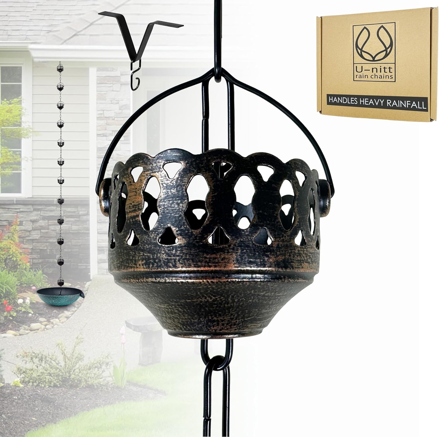 U-NITT RAIN CHAINS look great work great and sound great! No more boring downspouts! Install one of these at your front porch or backyard for added curb appeal. U-nitt Rain Chain Anchoring Basins / Pans / saucers / bowls / spill over with pour spouts are sold separately. Our rain chains feature black, blue, multi-color, gold, red, white cups, powder coated, heavy duty metal and detailed craftsmanship. They are bold, textured, cut-out, stamped cups, some are hand brushed, spray painted a second coat. Modern, antique, Victorian, Medieval, Farmhouse, country, Mid Century Modern themed. They all come assembled and measure 8.5 ft long full length. sufficient length for most home gutter height. Additional links or cups are available at U-nitt. Each rain chain package includes a rain chain and a basic gutter clip (with S hook) for easy do-it-yourself installation.