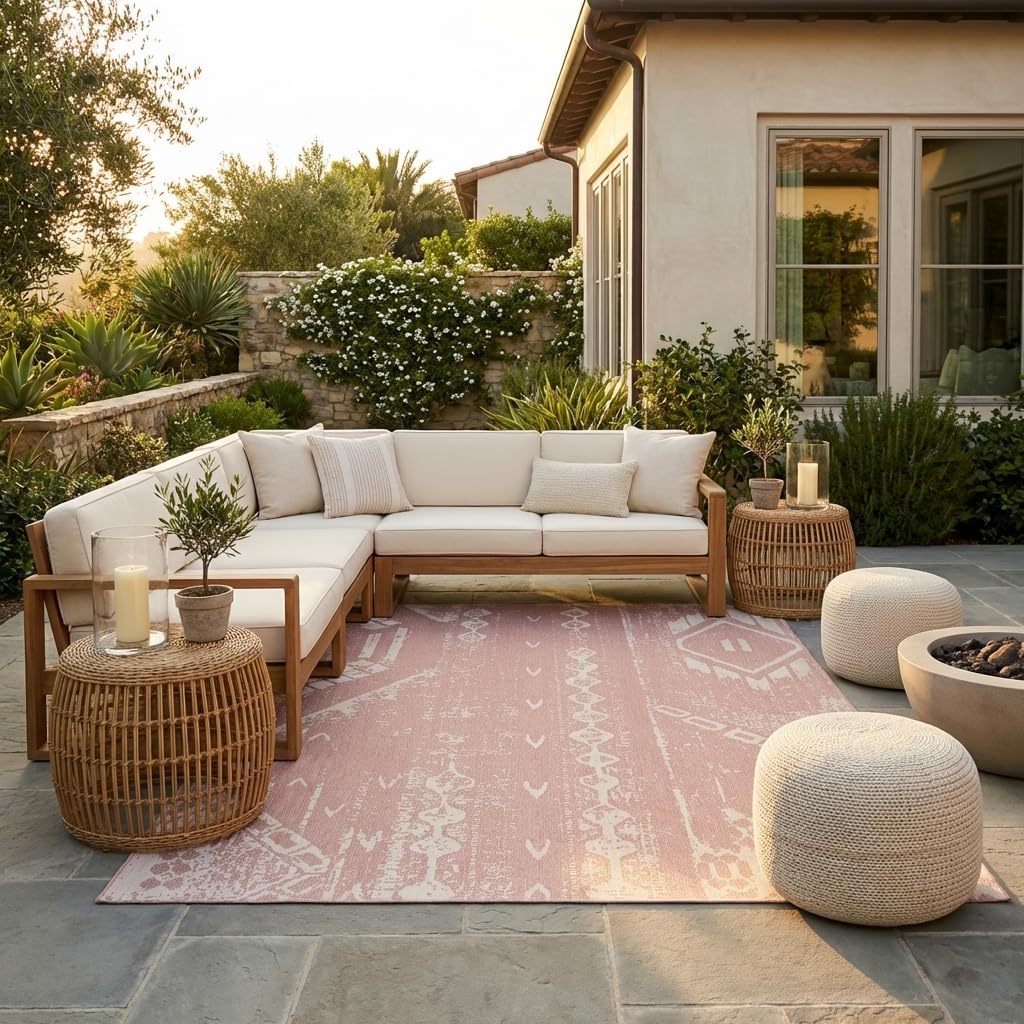Bring a boho look to your outdoor living space with the subtle design of the Outdoor Bohemian rug. The distressed design of this contemporary, yet abstract outdoor rug will make it a welcome addition to any porch, deck, or sunroom in your home. Geometric designs woven through its rust-red and ivory color palette will be the perfect complement to the green of the outdoors. Machine-made in Turkey, this rug is constructed of 100% polypropylene material making it perfect for outdoor entertaining. It's tough enough to hold up to weather and heavy traffic and is easy-to-clean. Generously sized, the Outdoor Bohemian rug will inspire you to go barefoot and enjoy the great outdoors. Bring warmth and comfort to any outdoor space with this versatile and stylish rug.