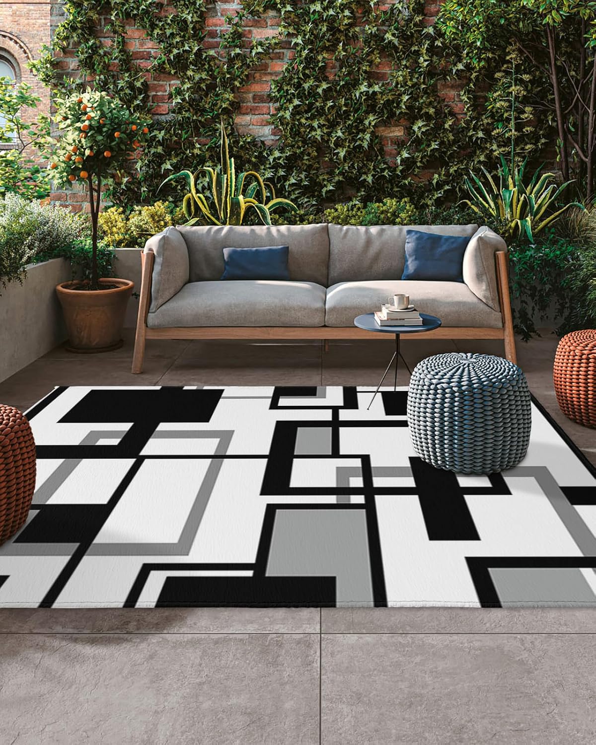 Enjoy supreme comfort and plush softness under your feet.Transform your existing decor with the chic modern style of our outdoor area rug carpet.Size4x6 ft5x8ft 6x9ftThickness measures: 0.2 in.Shape: RectangularBacking: Non-skip rubber points.Package includes:1 PC x Area RugsSpecial Note: Rugs may contain temporary creases upon arrival, allow time for creases to flatten and settle.How to remove carpet creases? 1. Wet the carpet and flatten it to air dry 2. Use a steam iron 3. Roll the area rug in reverse of the wrinkle or crease 4. Use a steam cleanerPremium MaterialMade from high-quality, soft, comfortable and strong durability. Provide a warmer and softer feel under your bare feet and knees, without damaging your deck or grass.Double-layer, outdoor mat is breathable, easy to clean, washable and quick dry.Multiple OccasionOutdoor rugs suitable for terrace, balcony, deck, garden, beach, porch, RV, camping, garage and other places.Versatile Mats Outdoor PatioThe outdoor rug can fit your patio style well, elegant as it is functional, not only protects the floor, but also adds a new view and to show off your personal style.Ideal Home DecorThe soft outdoor carpet is available in multiple colors and sizes to suit your different styles and needs, making it an ideal choice for home decoration.Wash TipsWhen the rug is dusty, only need to wash it with a hose outdoors.
