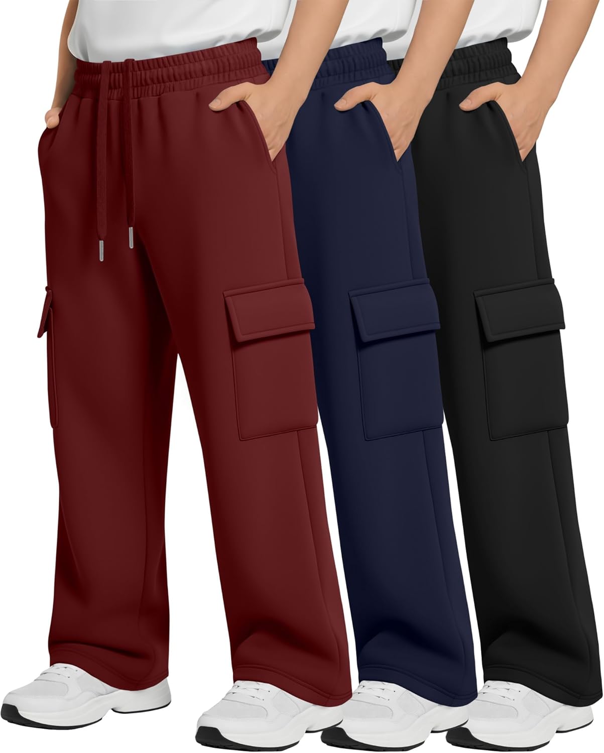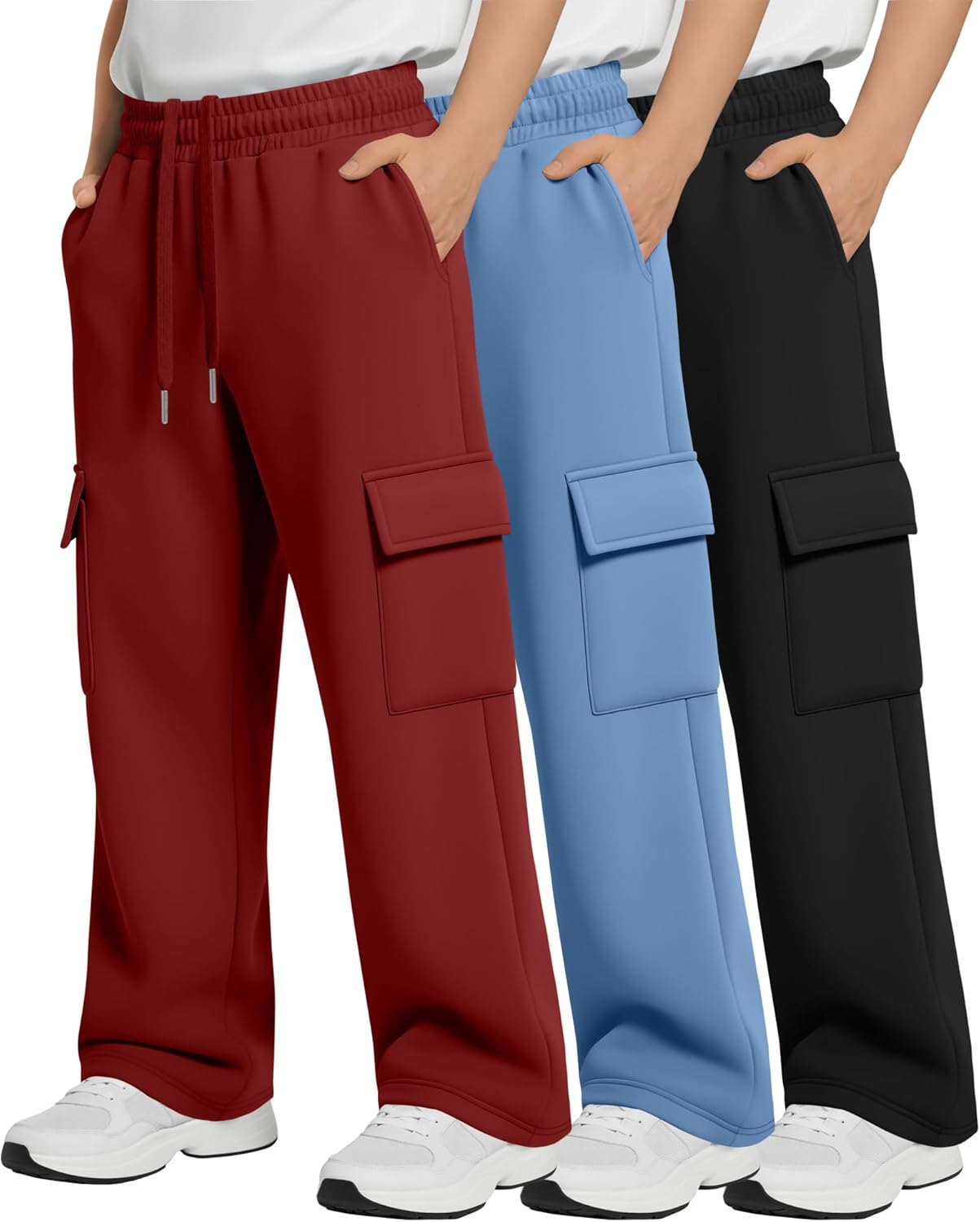 Features: Elastic drawstring design: These boys' athletic pants have an elastic waistband with a drawstring, fitting different body types. The stretchy waist stays put during jumping. Easy for kids to put on or take off independently, the timeless solid color is highly versatile for every day or sporty looks. Easy care: Washer and dryer safe. Recommend to wash in cold water and tumble dry low or line dry. Specifications: Material: 100% Polyester Package Includes: 3 x Cargo sweatpants for boys Notes: Manual measurement, please allow slight errors on size. The color may exist a slight difference due to different screen displays Please do not wash our products with other clothes, and bleaching is not allowed