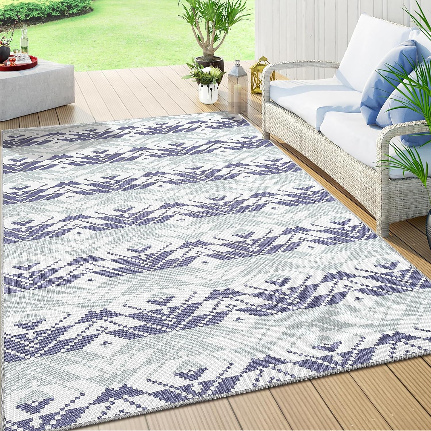 Enhance your indoor and outdoor spaces with this elegant and practical indoor/outdoor rug. Crafted from 100% polyester, this washable rug is ideal for patios, decks, backyard and more, this rug combines style and functionality effortlessly. More characteristics:Non-slip TPR backingThe indoor/outdoor rug can be compactly folded for storageUV coating prevents fading and other sun damage.The stitching edges are delicated to prevent wear and tear, ensuring soft sturdy with low maintenance costs. Specification:Muti-sizes Available(Ft): 5x8/6x9/8x10/9x12Material: 100% machine-woven polyester and TPR rubber bottom Product Care Instructions: * Simply brush off dirt with water and let it dry.* Our carpets are machine washable; however, due to their weight, please ensure your household washing machine's capacity is adequate before use. Please note:Upon arrival, if there are temporary creases on the area rug, rolling it in the opposite direction and laying it flat on the floor for 24-48 hours.The rug's color may looks vastly different under different lighting conditions. Please kindly notice that.