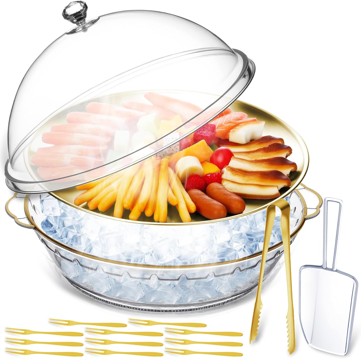 | Special Feature | Innovative Design: the fruit platter tray is ingeniously divided into 3 separate, removable sections; The upper layer is designed for food placement, while the lower layer accommodates ice cubes, with a lid to prevent dust and insects; This modular design ensures that your food remains fresh throughout the event, allowing each section to be applied independently as needed |
