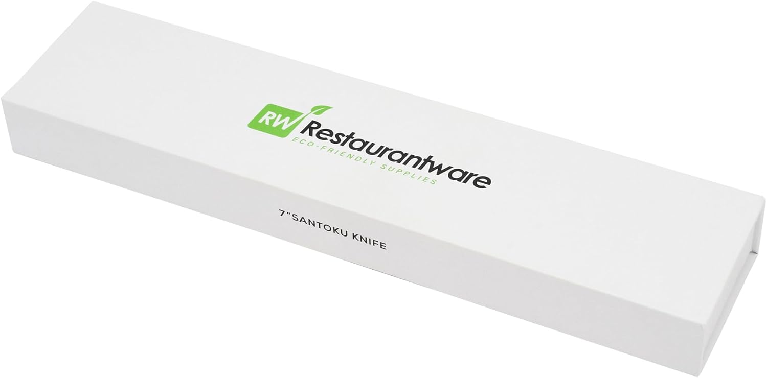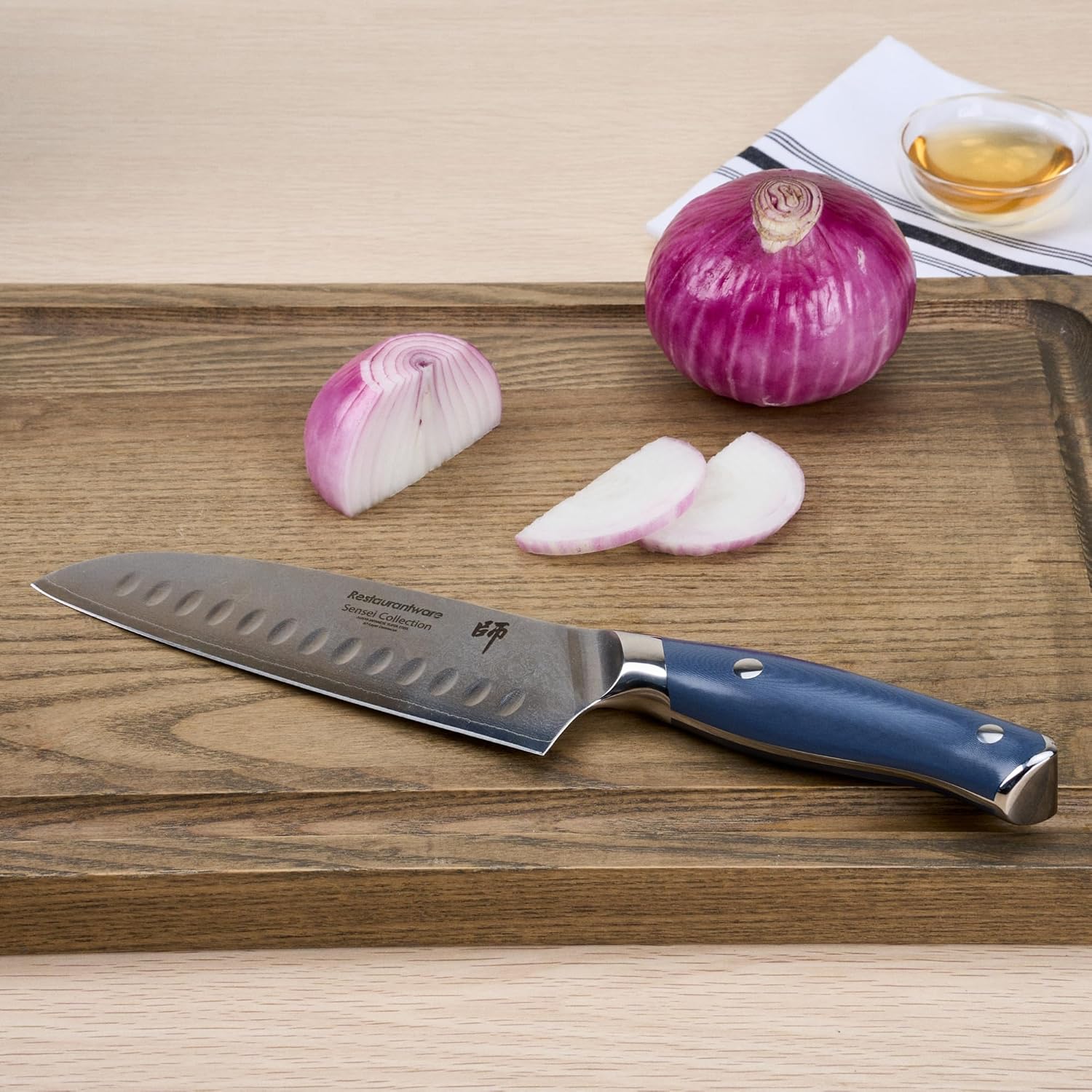 Expertly tackle any slicing and chopping with our Sensei Blue Steel Santoku Knife. Forged from the highest grade Japanese VG-10 steel, this 7 inch Santoku chef knife is equipped with a superior cutting edge that is renowned for its extreme durability. Its 67-layer Damascus steel blade delivers clean and precise knife cuts, while its dimpled granton edge reduces friction and prevents delicate foods from sticking to the blade. Equipped with a full tang construction and triple-riveted handle, these Japanese Damascus chef knives provide a well-balanced and secure grip. In addition, these Damascus steel kitchen knives are equipped with moisture-resistant G10 handles to minimize the risk of knife slippage and accidental injury. Our luxurious Sensei Blue Steel Collection is specifically designed for busy professional kitchens, where expert chefs demand the most of their equipment. Shipped in a 1 count box.Product SpecificationsProduct Material: Damascus SteelProduct Color: GrayPack Size: 1 countProduct Dimensions: 12.4''L x 1.9''W x 0.8''HProduct SKU: RWT0097
