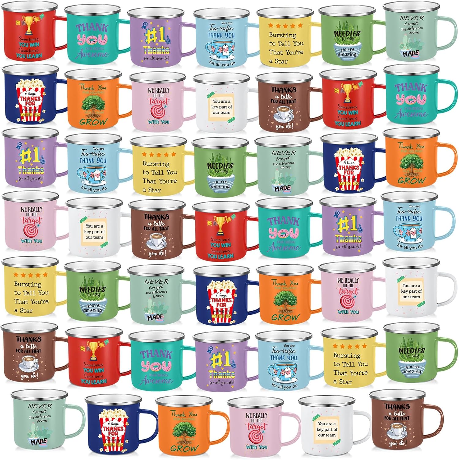 Features: Versatile for Everyday Use: whether at home, in the office or traveling, these enamel mugs are perfect for any setting. Their lightweight yet durable design makes them ideal for enjoying coffee, tea, or any beverage while bringing inspiration and beauty into your daily routine. Crafted for Lasting Enjoyment: made from high-quality steel with an enamel coating, these mugs are built to withstand daily use. The vibrant design and meaningful message are not easy to fade, ensuring beauty and long-term use. Specifications: Material: steel Color: multicolor Size: 12 oz Package includes: 48 Enamel mugs Notes: Manual measurement, please allow slight errors on size. The color may exist a slight difference due to different screen displays.