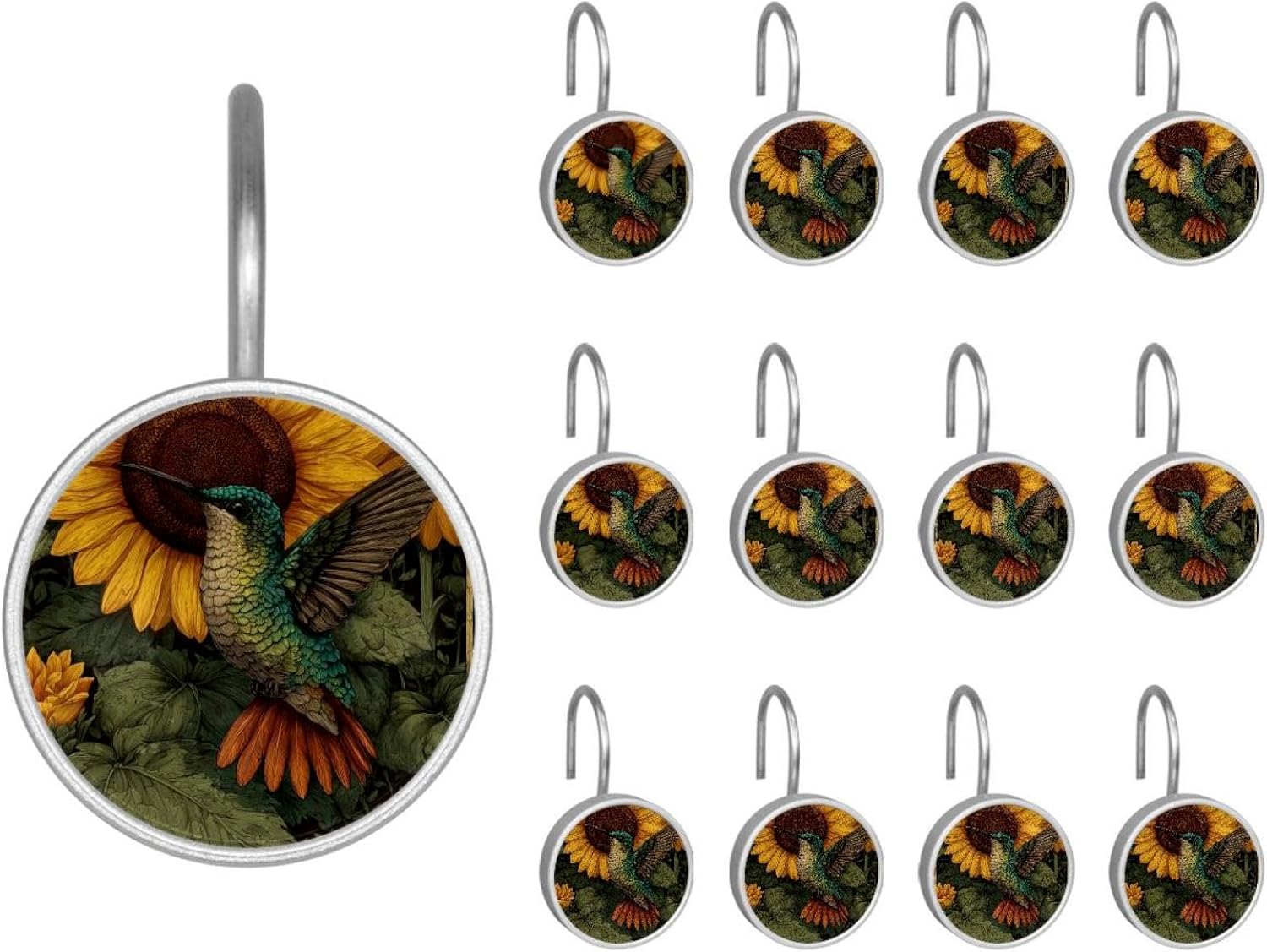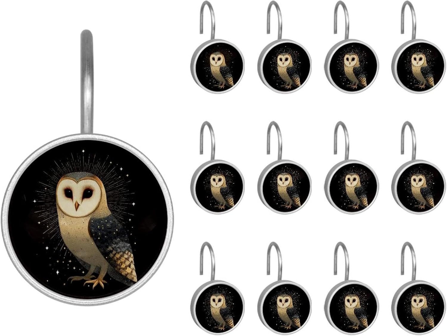 MATERIAL: glass, stainless steel. These shower curtain hooks can be decoration bathroom and will be long-lasting.12 pieces of shower curtain hooks, round crystal glass decoration, printed patterns, silver hooks to match various styles of bathroom shower curtains. SIZE: Crystal glass diameter of round shower curtain hook is 1.45x1.45in/ 3.7x3.7cm. The shower curtain hooks diameter is about 1.1in, 12 pieces shower curtain hooks are suitable for rod of 8-28mm(0.3"-1.1"). RUST RESISTANT:Shower hooks are made of stainless steel and crystal glass, which is durable, rust-proof and corrosion-resistant, it will not rust suitable for wet bathroom environment. EASY TO INSTALL:Hand the shower curtain hooks hold securely on straight or curved shower curtain rods,slid easily and smoothly. Easy to install and decorate your bathroom. BEAUTIFUL AND ELEGANT:Beautiful Love hook add charming scenery for your bathroom, baby room, bedroom, living room, and the gorgeous style is easy to match with any kinds of bathroom shower curtain. EASY GLIDE: Open and close your shower curtain quickly and easily with the Shower Hooks, easily glides on shower curtain rods and tension rods. No snagging; no effort; no hassle PACKAGE: 12 shower curtain hooks in a pack.The bathroom curtain hook has a smooth appearance and can be hung on the pole to pull it at will. Special price 12 sets to meet your needs.
