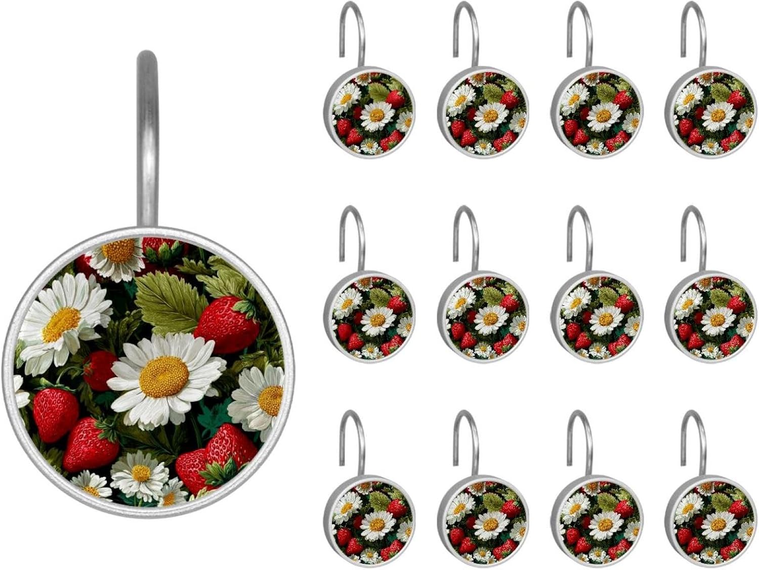 MATERIAL: glass, stainless steel. These shower curtain hooks can be decoration bathroom and will be long-lasting.12 pieces of shower curtain hooks, round crystal glass decoration, printed patterns, silver hooks to match various styles of bathroom shower curtains. SIZE: Crystal glass diameter of round shower curtain hook is 1.45x1.45in/ 3.7x3.7cm. The shower curtain hooks diameter is about 1.1in, 12 pieces shower curtain hooks are suitable for rod of 8-28mm(0.3"-1.1"). RUST RESISTANT:Shower hooks are made of stainless steel and crystal glass, which is durable, rust-proof and corrosion-resistant, it will not rust suitable for wet bathroom environment. EASY TO INSTALL:Hand the shower curtain hooks hold securely on straight or curved shower curtain rods,slid easily and smoothly. Easy to install and decorate your bathroom. BEAUTIFUL AND ELEGANT:Beautiful Love hook add charming scenery for your bathroom, baby room, bedroom, living room, and the gorgeous style is easy to match with any kinds of bathroom shower curtain. EASY GLIDE: Open and close your shower curtain quickly and easily with the Shower Hooks, easily glides on shower curtain rods and tension rods. No snagging; no effort; no hassle PACKAGE: 12 shower curtain hooks in a pack.The bathroom curtain hook has a smooth appearance and can be hung on the pole to pull it at will. Special price 12 sets to meet your needs.