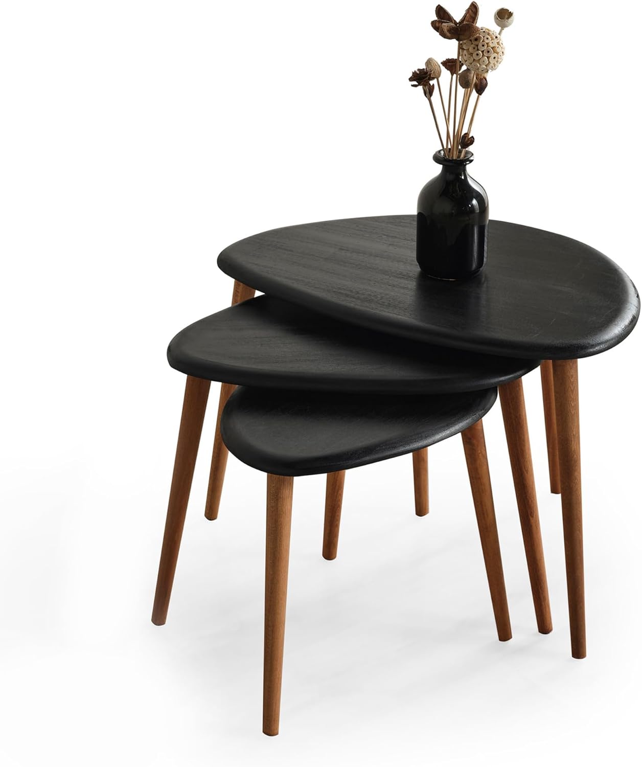 Add a touch of elegance and functionality to your living room with our Nesting Coffee Table Set. Made from high quality wood , these coffee tables are not only stylish but also reflects the natural slihoutte of the pebbles. Designed in a mid-century modern style, they will effortlessly complement any decor, making them a perfect addition to your home. With their sleek and minimalist design, these wooden coffee tables blend seamlessly into any room. The pebble-shaped tabletops add a unique and eye-catching touch, attracting attention and making a statement. The versatility of this nesting table set is unmatched. The three different sizes allow you to easily rearrange and nest them together when not in use, saving precious space in your living area. Use them as accent tables to display your favorite decor pieces, or as bedside tables to keep your essentials within reach. They can even serve as sofa tables for placing your drink or book while lounging on the couch. Whether you're looking for an end table, a nightstand, or simply a stylish coffee table set, our nesting tables have got you covered. Upgrade your living space with these versatile and charming pieces that are sure to enhance the ambiance of your home. Discover the perfect balance of style and functionality with our mid-century modern nesting coffee table set. Measure: Width / Height / Depth (Set of 3) S: 17.7''- 17.3'' -13.2'' / 45 - 44 - 33.5 cm M: 21.5''- 18.5'' - 15.4'' / 54.5 - 47 - 39 cm L: 25.6''- 19.7''- 17.3'' / 65- 50- 44 cm