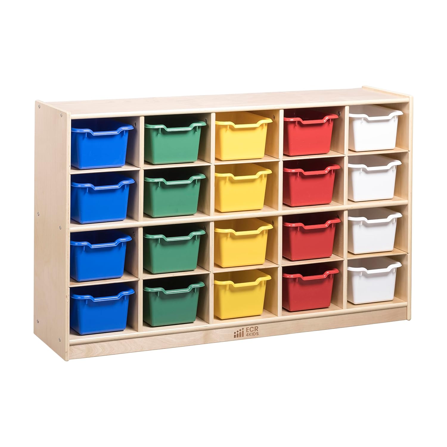 Keep your classroom or playroom uncluttered with the ECR4Kids 20 Cubby Mobile Tray Storage Cabinet with Scoop Front Storage Bins. Ideal for small spaces, kids can organize and store toys, games, building blocks, and school supplies that may otherwise be forgotten. Designed to grow with little ones, this storage cabinet with 20 bins helps parents, teachers, and educators keep small items within reach. Give children their own separate cubby at school to store art projects, homework, and personal belongings. Durable plastic bins feature rounded edges, an easy-to-grasp scoop front handle, and a curved interior to simply remove contents. Lightweight bins are easy to pick up and carry between activities. The low-profile open-face shelves encourage little ones to select their favorite activity independently, introduce organizational skills, and clean up when playtime is over. Four casters are included for mobility; move the storage unit from a hallway to the art room. Constructed from sustainably harvested birch plywood with a durable finish sealing the wood surface and resisting scratching. A UV inhibitor helps furniture resist ultraviolet light and yellowing. Birch plywood is extremely durable and will hold up to everyday use in an early childhood environment.