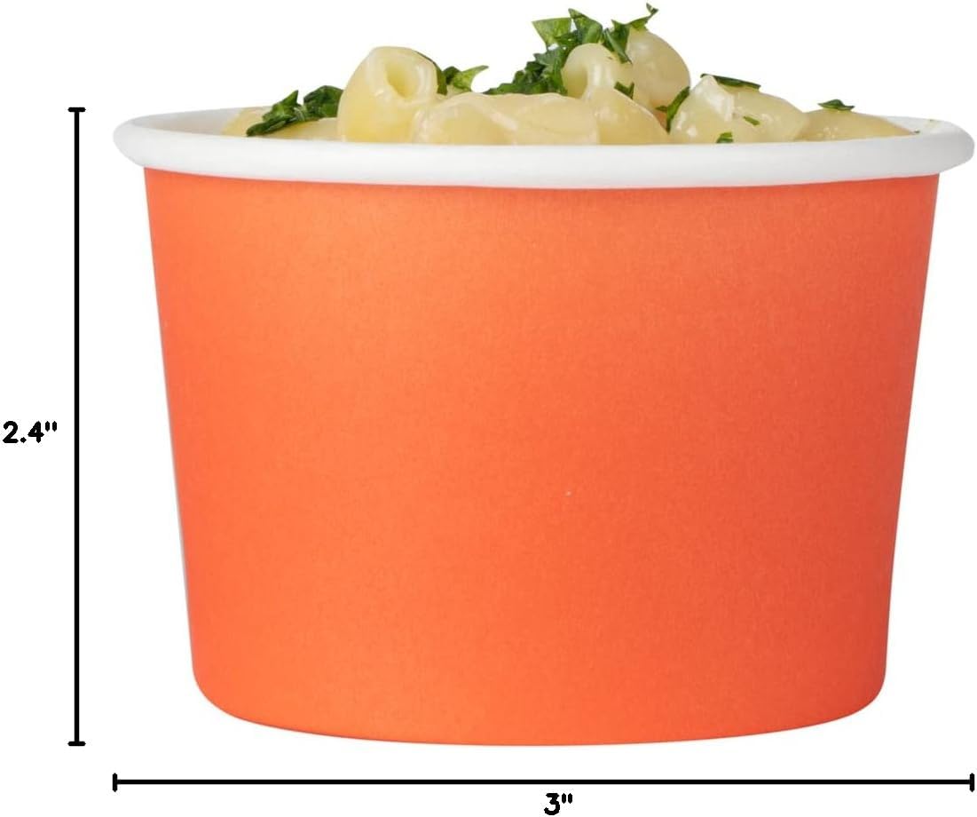 Serve sweet desserts using our Coppetta 4-ounce Round Tangerine Orange Paper To Go Cups. These takeaway dessert cups are made from premium paper and are suitable for carrying hot and cold food items. Featuring a no-grease PE lining, these round ice cream cups keep oil or grease from soaking through and allow you to serve food in a no-mess manner. With a rolled rim and durable design, these frozen yogurt paper cups are built to keep meals intact. To minimize your carbon footprint, these premium paper frozen dessert cups are sustainable. The bright orange finish of these paper soup cups instantly upgrades the look of your meal presentations. Pair these orange cups for ice cream with our matching lids (ASIN B089QWHF7R). These orange food containers can hold up to 4 ounces of ice cream, soup, or other snacks. For space-saving storage, these disposable to go cups are stackable. These paper soup cups measure 3 inches in diameter by 2.4 inches in height. Sold in a 200 count box. Lids are available and sold separately.