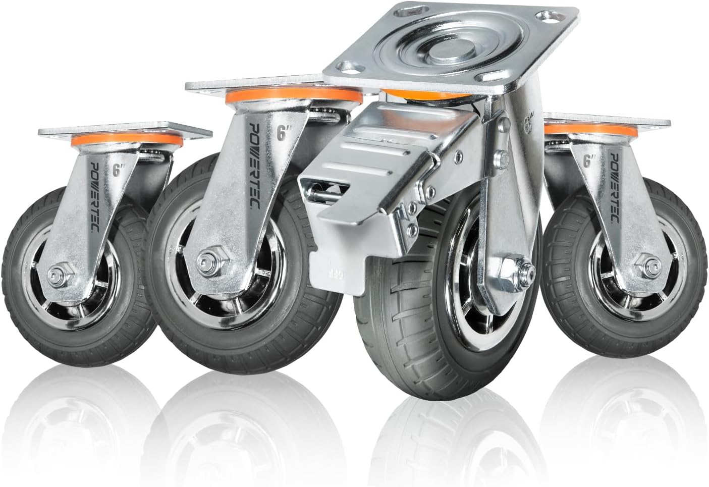 Unlock Effortless Mobility and Make Heavy Lifting a Breeze Introducing the 8-Inch Caster Wheels Set by POWERTEC. These 8-Inch Swivel Caster Wheels are engineered to provide effortless mobility and superior support for even the most demanding applications. Unleash Heavy-Duty Performance: Each caster in this set of 4 boasts an impressive 2000 lbs capacity. Whether you're moving construction equipment, power tools, or heavy-duty furniture, these caster wheels can handle the load with ease. Smooth and Silent Rolling: Featuring premium polyurethane (PU) wheels and precision ball bearings, these casters glide quietly and smoothly across various surfaces. Enjoy effortless movement without the jarring noise and marring floor damage often associated with lesser-quality caster wheels. Enhanced Stability and Control: The 360-degree swivel action allows for effortless maneuverability in any direction. The set includes 2 caster wheels with brake locks and 2 without, providing flexibility and control for your specific needs. The brake locks secure both the wheel rotation and swivel motion, ensuring stability and preventing unwanted movement. Workbenches: Transform your static workbench into a mobile workstation for increased flexibility and efficiency. Carts and Dollies: Create robust and reliable carts and dollies for transporting heavy loads in warehouses, factories, or workshops. Furniture: Upgrade your furniture with smooth-rolling mobility, making it easy to rearrange your space. Storage Mobility: Add mobility to storage cages, tool carts, and other storage solutions for easy access and organization. POWERTEC is a leading manufacturer of high quality woodworking and construction tools, accessories, machines, and an assortment of OEM replacement parts. We are committed to exceeding expectations, while bringing the latest innovations, technology, and product development to the industry.
