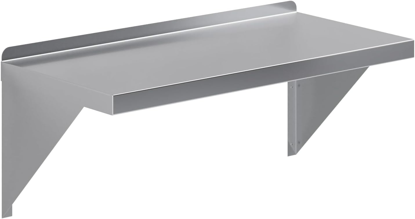 12 in. x 30 in. Stainless Steel Wall Shelf with 10 in. High Mounting Brackets and 1 in. backsplash. Squared edge. Enhance your organization and efficiency with the Amgood stainless steel wall mount shelf. Crafted with high-quality stainless steel, this shelf offers durability and sleek aesthetics for any space. Its sturdy construction ensures steadfast support for an array of items, spanning from spices and ingredients to small kitchen appliances and cleaning supplies.Product Specifications:18 Gauge 430 Stainless Steel Shelf 220 Lbs weight capacity1 in. backsplash2 Stainless Steel Shelf Mounting BracketsNSF CertifiedSturdy & Easy to SetupHeavy DutyCommon Applications:Shelf For Commercial KitchenAppliance Storage For Home KitchenUtility ShopGarage StorageLaundry Room StorageBathroomStove Top / Oven ShelfCloset SetupJanitors RoomButcher ShopEtc…NSF certified to meet the strictest standards for public health protection. The industrial-quality manufacturing process meets the highest regulatory requirements for construction, safety, and durability.