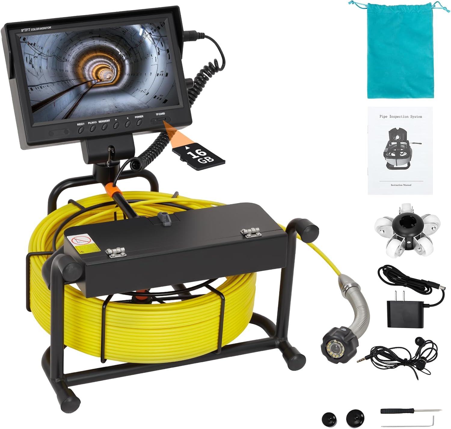 Tired of guessing what’s clogging your pipes or struggling to pinpoint hidden leaks? Our Sewer Camera (Pipeline Endoscope) is the ultimate solution for plumbers, DIY enthusiasts, and homeowners alike—here’s why it’s a must-have:1. See Every Detail, Even in the Toughest SpotsCrystal-Clear Visuals: Equipped with a 9-inch 1080P HD color screen and a high-definition waterproof camera, this endoscope delivers sharp, bright images (no more blurry, dark views!).36X Zoom & 120° Wide-Angle Lens: Zoom in to inspect tiny cracks or use the wide lens to scan large pipe sections—perfect for spotting clogs, corrosion, or hidden leaks.12 Adjustable LED Lights: Illuminate dark, narrow pipes so you never miss a detail, even in pitch-black sewer lines.2. Locate Issues Fast (No More Guessing Games)512Hz Locator Included: Struggle to find where a pipe problem is? The built-in locator helps you pinpoint the exact spot above ground—saving hours of digging or trial-and-error.164FT Fiberglass Rigid Cable: Reach deep into sewer lines, drains, or HVAC ducts. The cable has length markings, so you always know exactly how far the camera has traveled.3. Capture & Document EverythingDVR Recording + 16GB SD Card: Record videos/photos of pipe conditions to share with clients (for plumbers) or keep as a “before/after” record (for homeowners).Audio Recording: Need to note specific sounds (like dripping or gurgling)? The audio feature lets you document anomalies that visuals alone might miss.4. Designed for Long, Easy Use4500mAh Battery = 8 Hours of Power: Inspect multiple properties or tackle lengthy jobs without stopping to recharge.IP68 Waterproof Camera: Submerge the camera in water or sewage—its sealed design withstands moisture, debris, and harsh conditions.