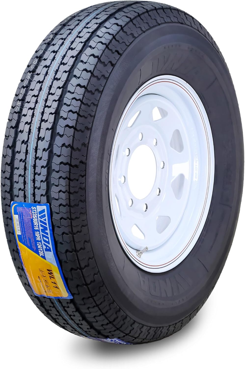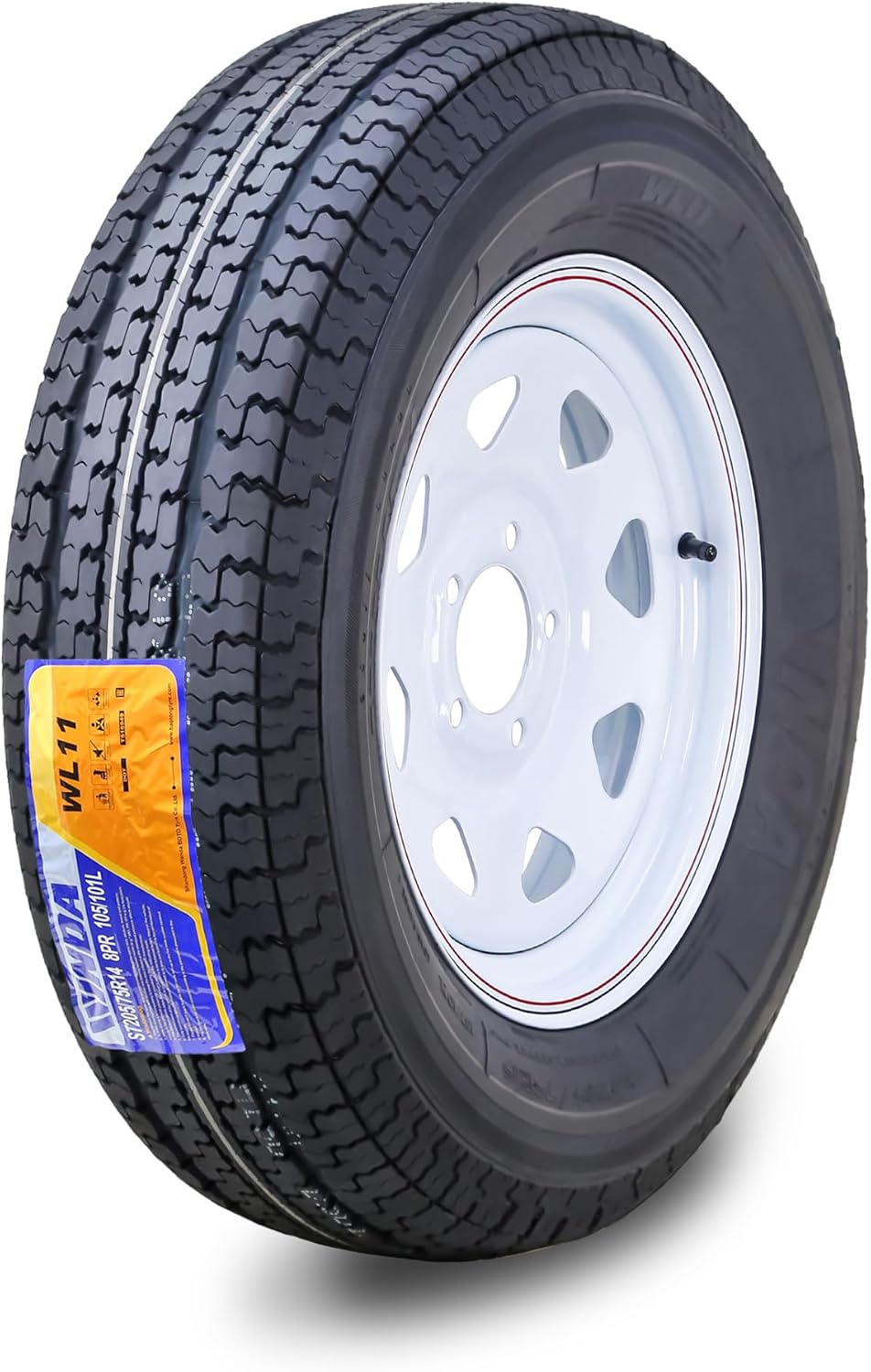 SAFETY--FULL nylon cap ply overlay cross entire tread area, significant upgrade from most other products on the market have nylon strips on shoulder area only, add critical safety feature!. FEATURE-- Unique “Scuff Guard” ring on tire wall for better tire side and rim protection. LONG LASTING: 8mm deep tread depth vs 5.6 mm of other cheap competitors, durable and longer mileage life. PERFORMANCE: 8 ply rated, load range D. Load Index:107. Speed rating L--up to 75mph. WHEEL DETAIL: 5 Lug on 4.5" bolt pattern, offset: 0, style: White Spoke. SAFETY CERTIFIED: Meets or exceeds applicable DOT standards to provide dependable performance season after season for hauling cargo safely.Tire SpecificationsTire Size: ST205/75R15Brand: WINDATread Pattern: WL11Ply Rated: 8Tread Depth: 8Rim Width: 5.5Max Load: 2150lbsLoad Index: 107Speed Rating: LPlease note: fitment guide is for reference only and does not guarantee the tire will fit your specific model. Please check your owner's manual to ensure proper fitment.