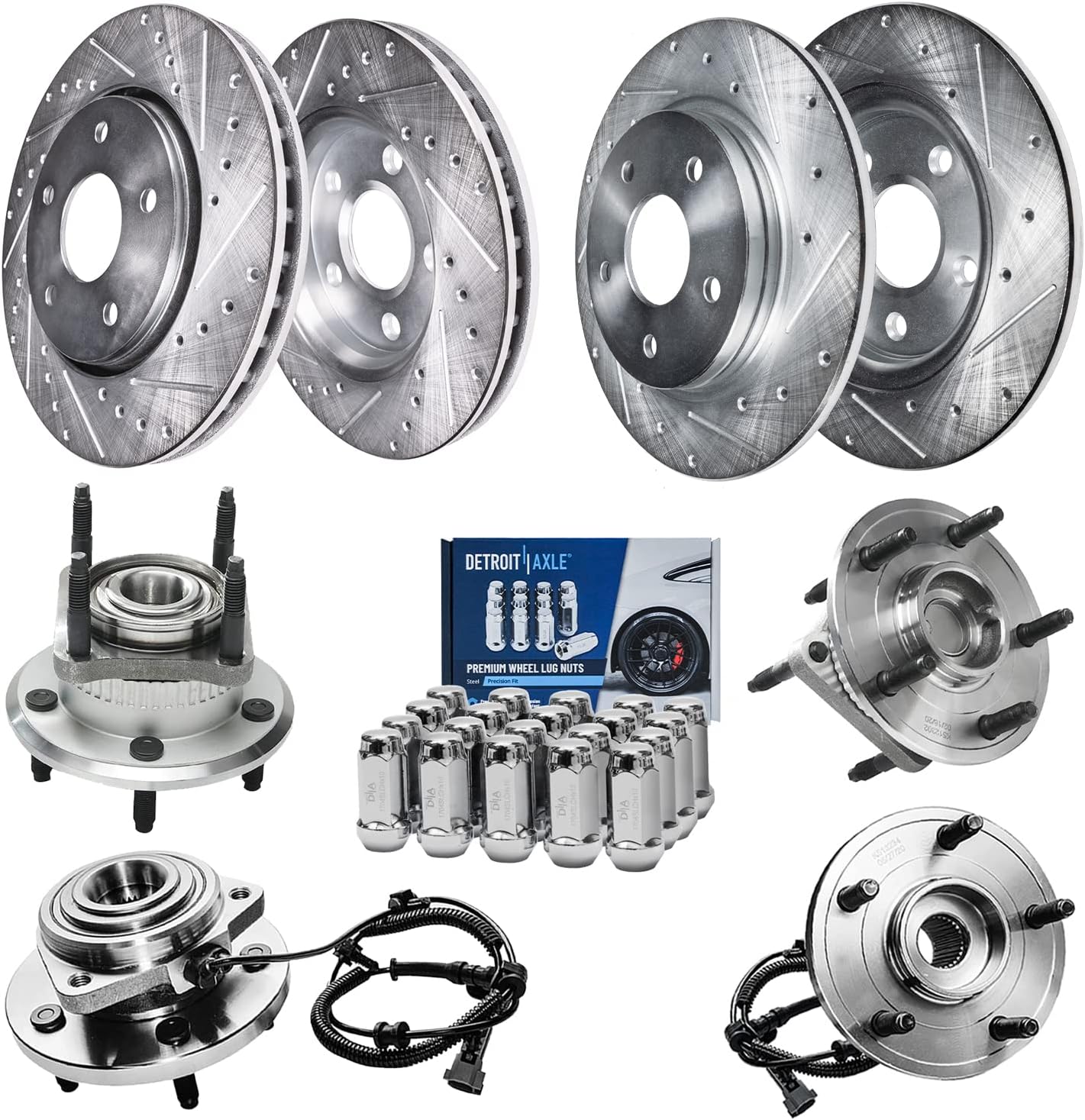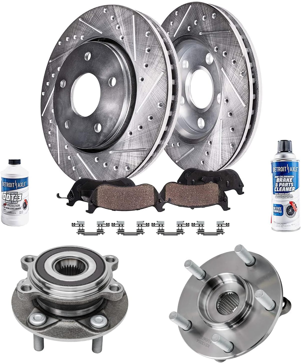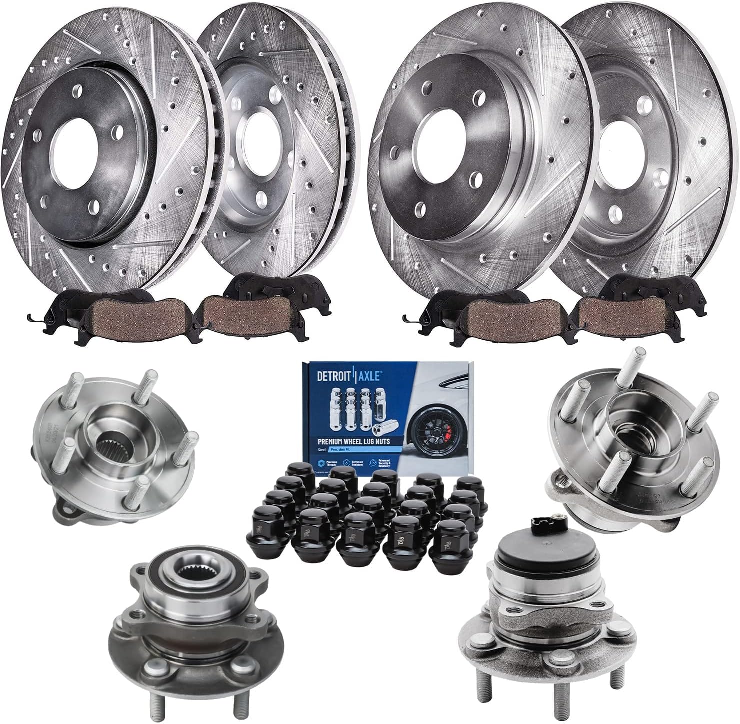 Kit Includes:2x Front Drilled & Slotted Disc Brake Rotors: S-342792x Rear Drilled & Slotted Disc Brake Rotors: S-344312x Front Ceramic Brake Pads (Hardware Included): P-13752x Rear Ceramic Brake Pads (Hardware Included): P-17792x Front Wheel Bearing & Hub Assembly - Driver or Passenger Side - 5132531x 12oz Brake Fluid Bottle1x 10oz Brake Cleaner BottleHub Specifications:Lugs: 4 BoltABS on Hub: YesFlange Type: 4-Bolt SquareFitment:**12.28 inch (312mm) Front & 10.70 inch (272mm) Rear Rotors**Replacement for 2015 Volkswagen Passat (3.6L; 1.8L)Replacement for 2015 Volkswagen Passat (2.0L-Built After 7/1/2014 )Replacement for 2016-2020 Volkswagen PassatIntroduction:Detroit Axle is a leading global retailer and distributor of OE re-manufactured and new aftermarket auto parts. We are committed to providing first-class products and outstanding customer service at an incredible value. Our rapidly-expanding product line includes CV Axles, Wheel Hub & Bearings, Suspension & Chassis parts, Complete Strut Assemblies, Shock Absorbers, Drilled & Slotted Brake Rotors, Conventional Brake Rotors, Ceramic Brake Pads, Brake Fluids, Brake Cleaners, Rack & Pinion Assemblies, Gearboxes, Drive Shafts, Transmissions, Brake Calipers, Wheel Lug Nuts, and more. With over 30 years of experience, we are proud that millions of customers around the world rely on Detroit Axle parts. We have two Metro Detroit storefront locations on the north and west sides of the city.